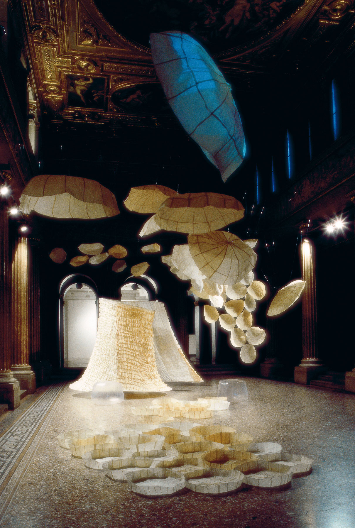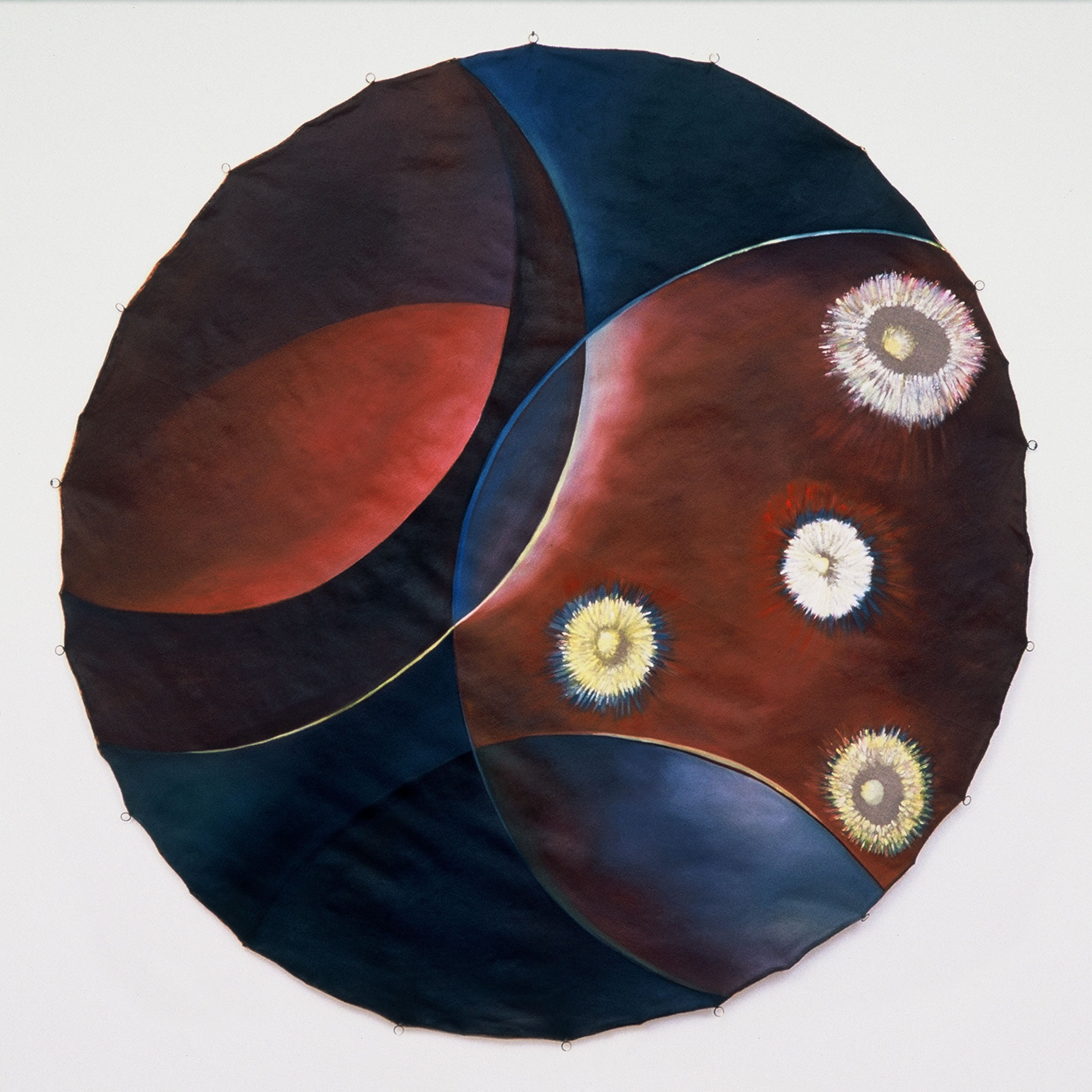 Steel tube, powdercoated, crochet wool, height: 221 cm, ø 138 cm