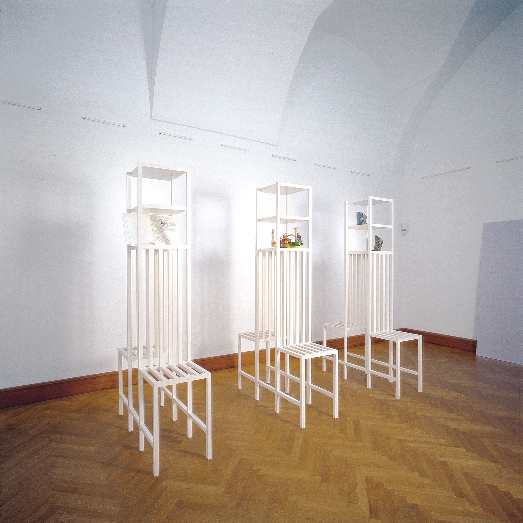 Wood, glass, textile object, paint, 188 × 66 × 66 cm