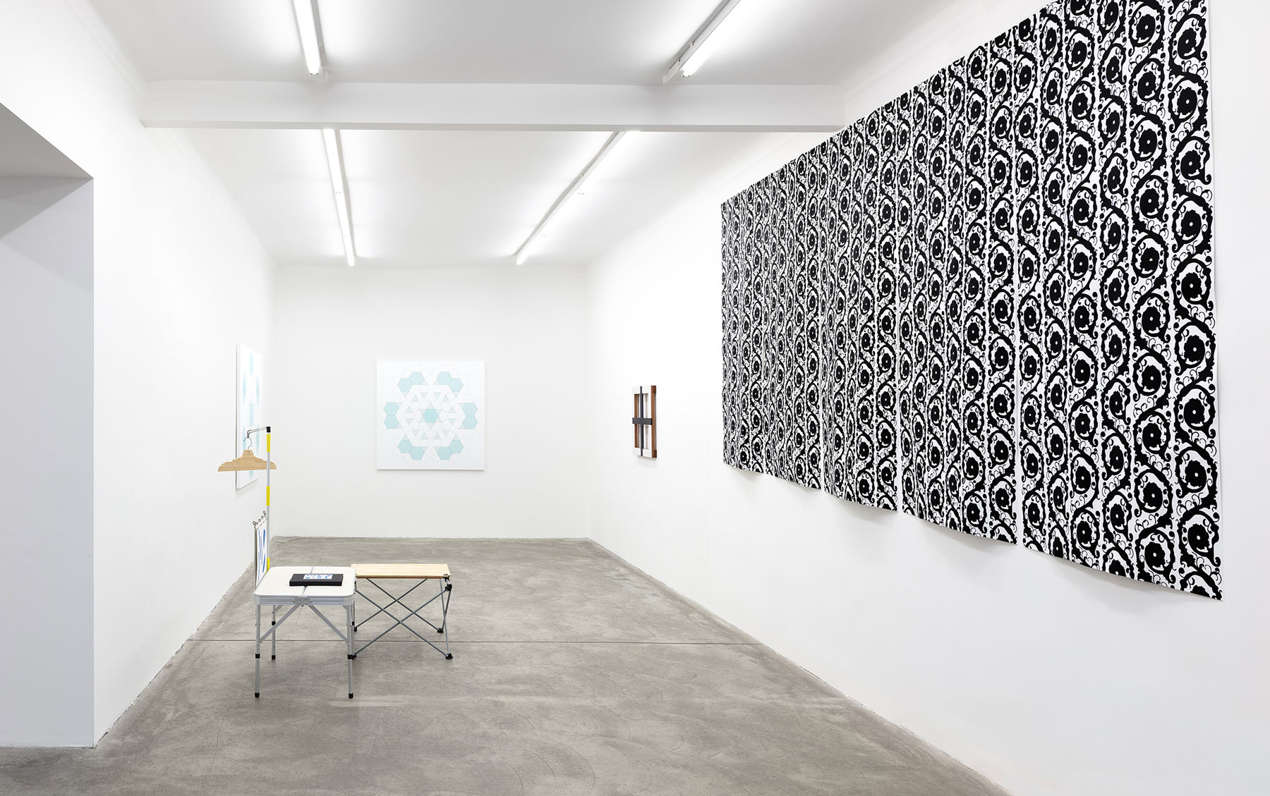 Bamboo, plexiglass, latex paint, 6 relaxation cushions, 108 × 115 cm