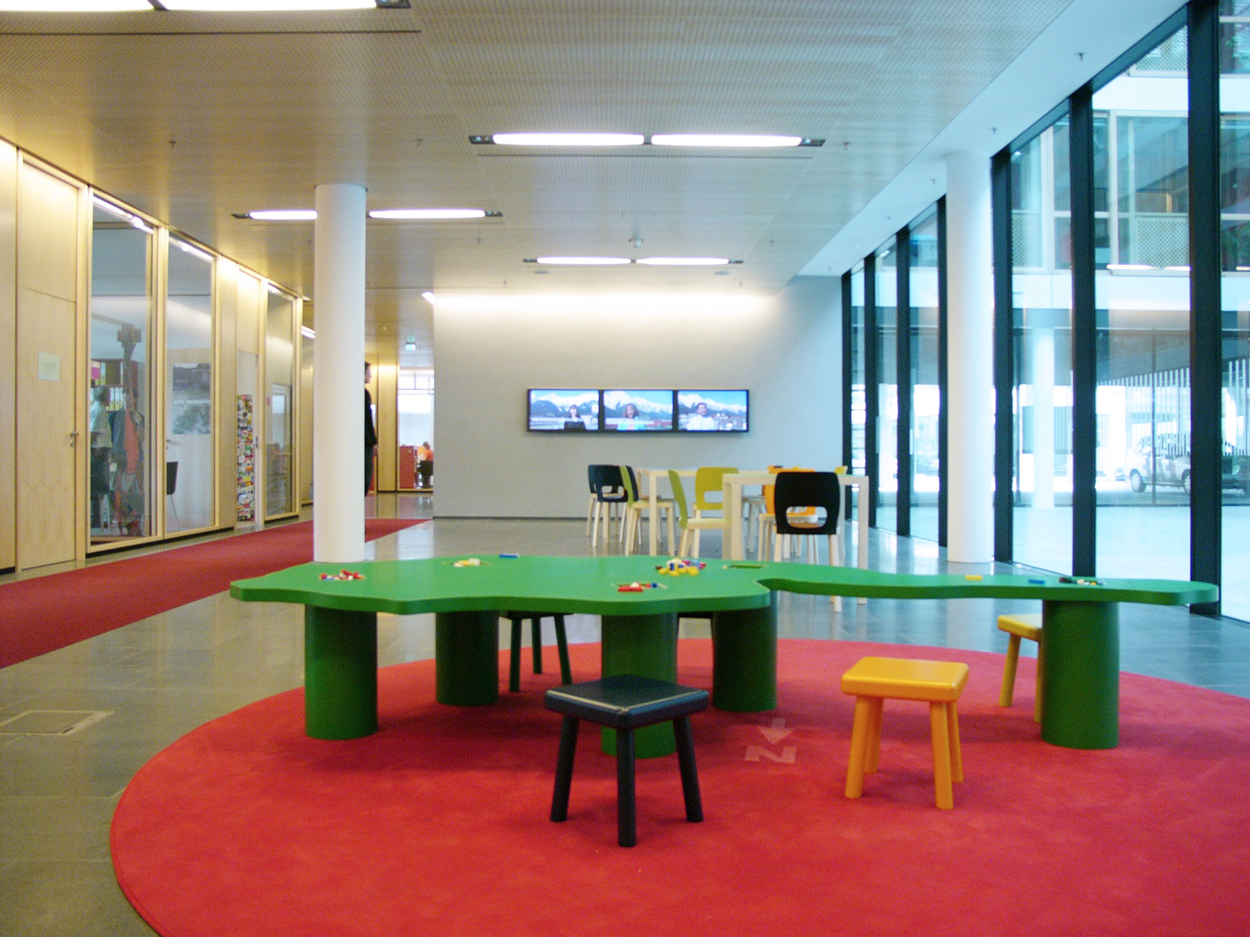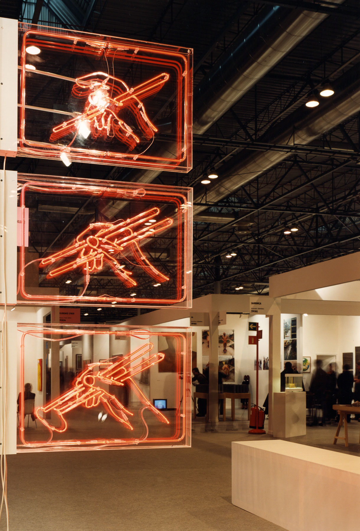 Wood, neon installation, video, stools, 5.5 × 5.5 × 3 m