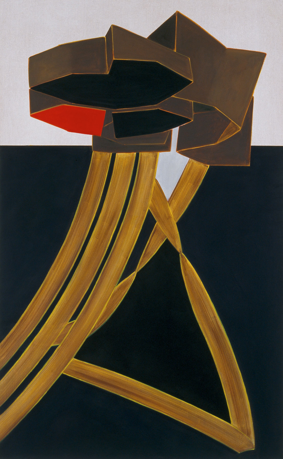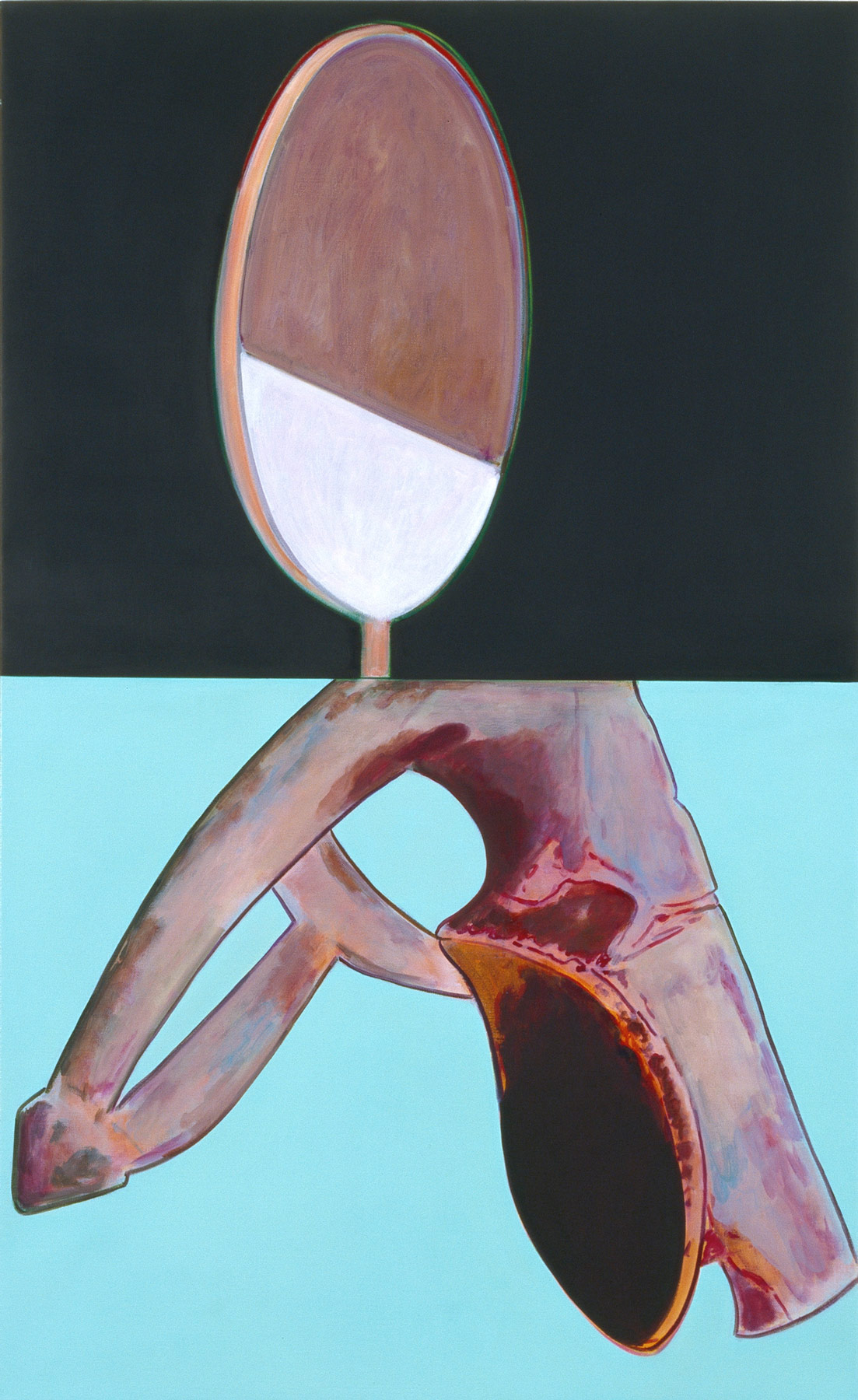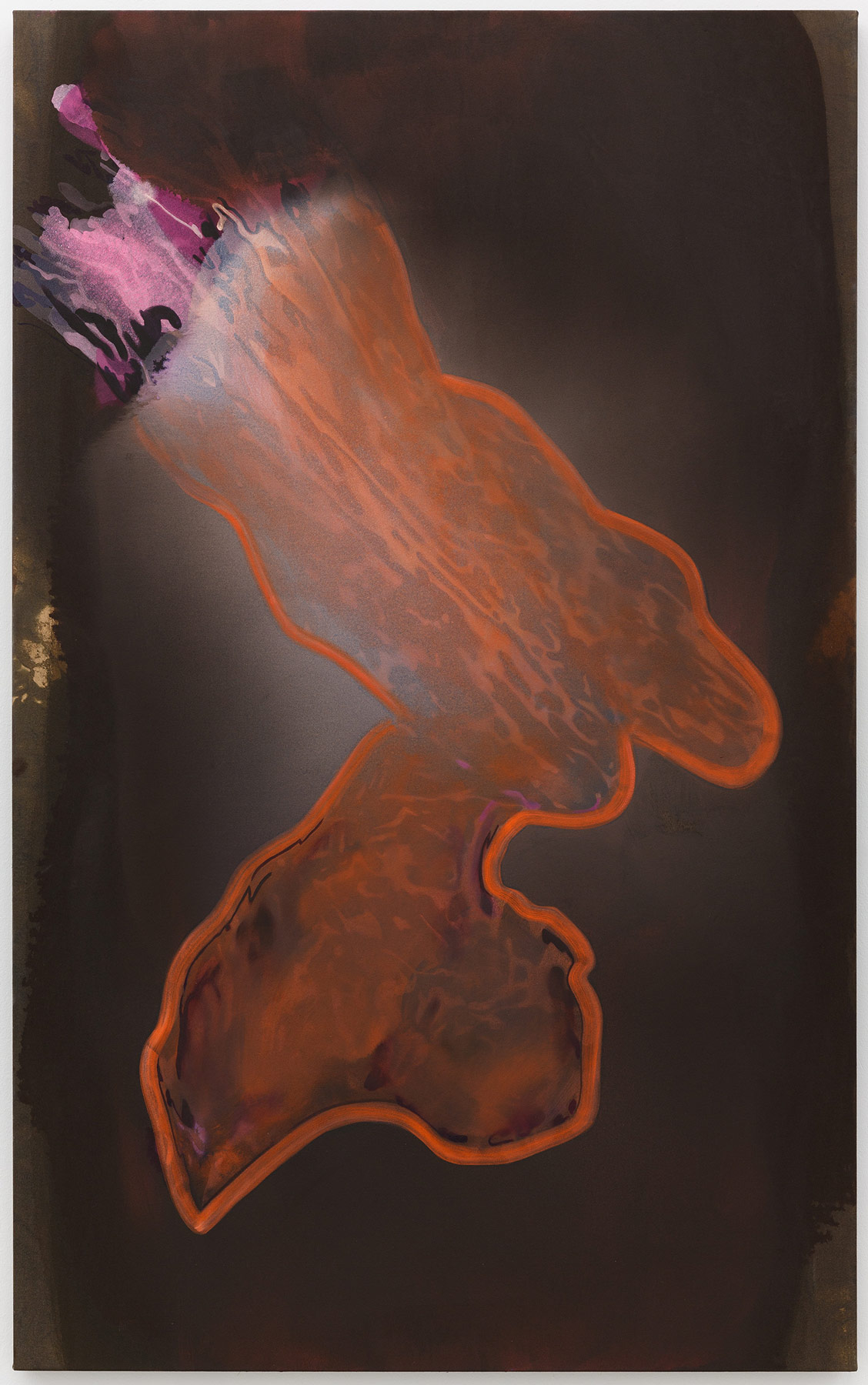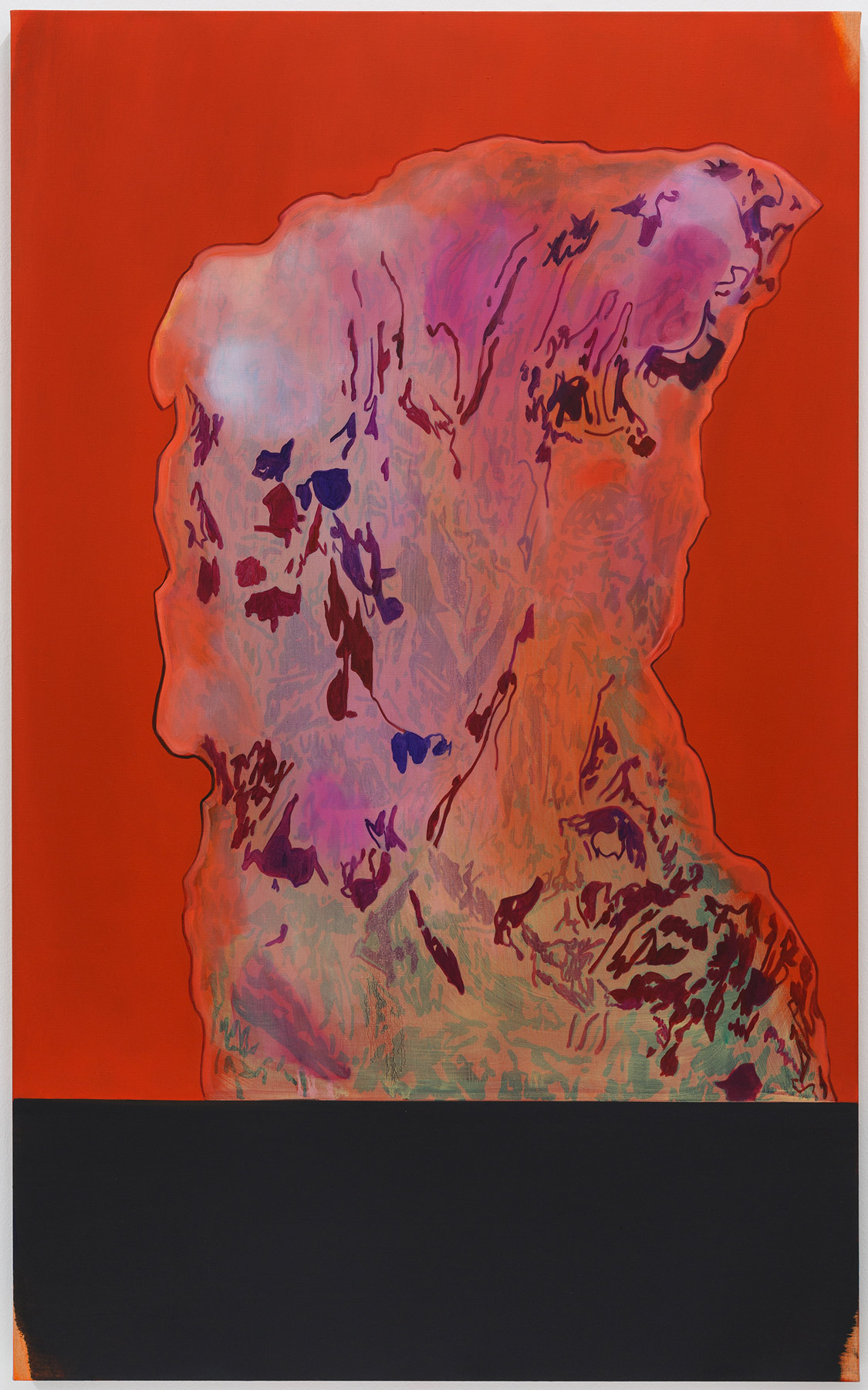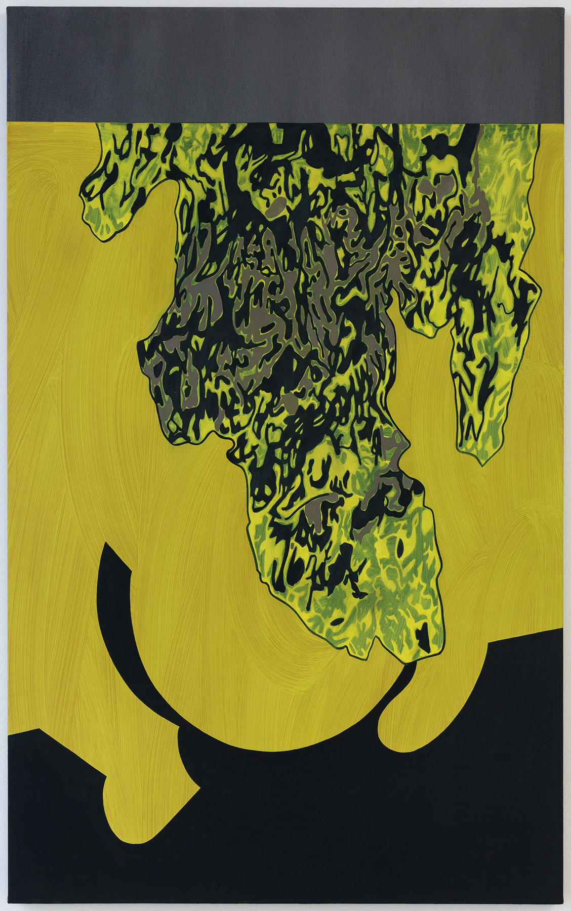 Liquid acrylic, oil and clear gesso on black dyed canvas, 148 × 91.5 cm