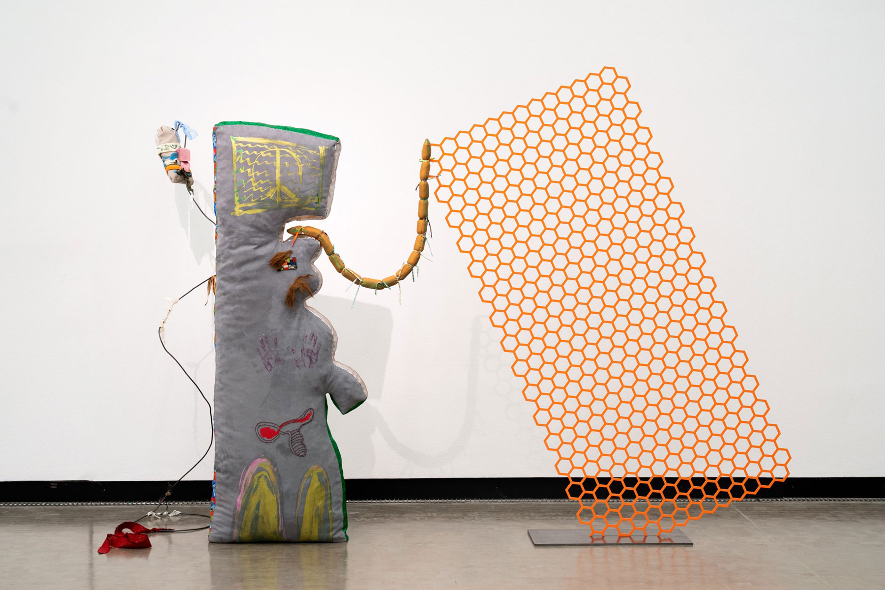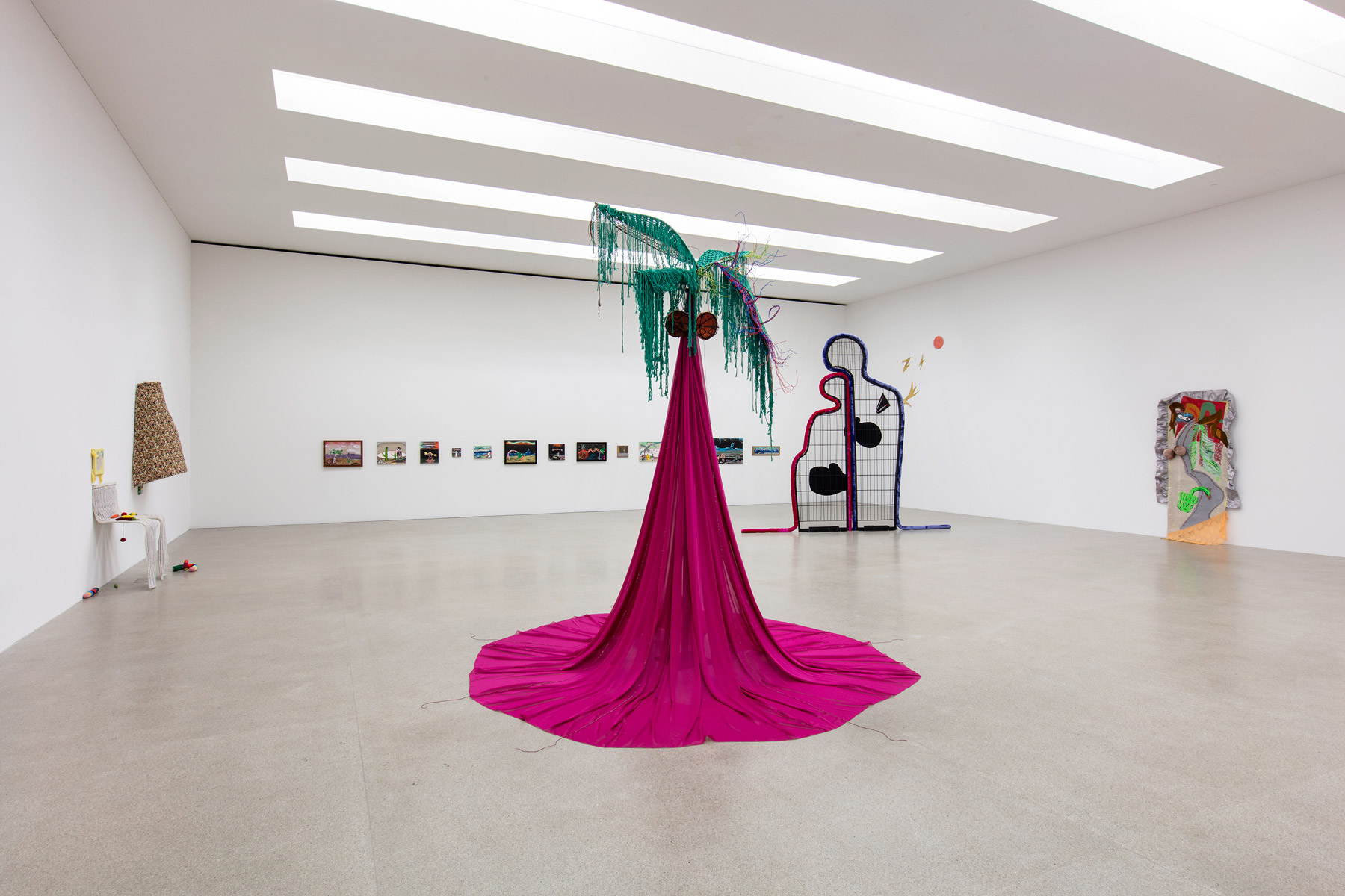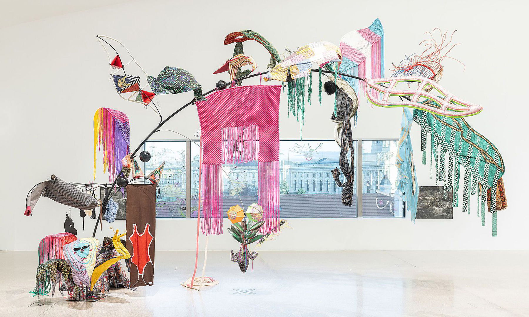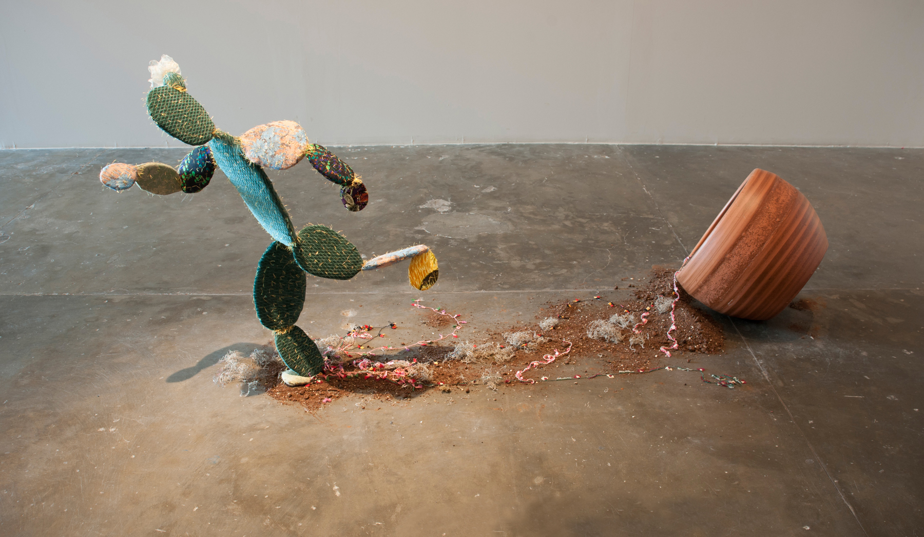 Fabric objects, metal construction, thread, fabric, flowerpot, earth cactus: 90 × 95 × 45 cm, pot: ø 44 cm, height 30 cm. Photo: Marcos Gorgatti