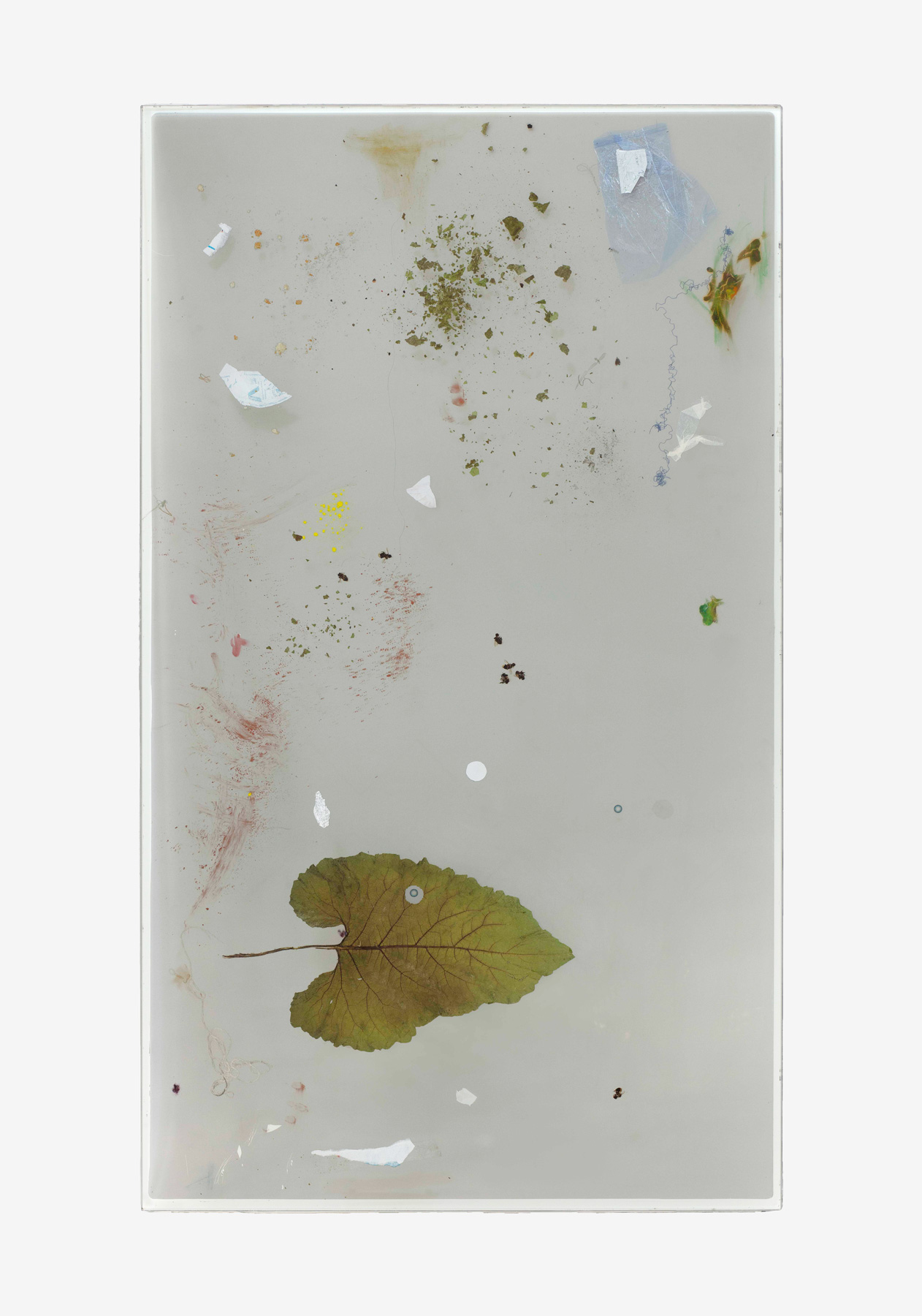 Stratified glass, reused museum window, found bees, contact lenses, fragments of clothes, receipts, leaf, blush, dust, bread crumbles, fragment of n95 mask, plastic bag, plasticine, tape, 150 × 86 × 1.5 cm