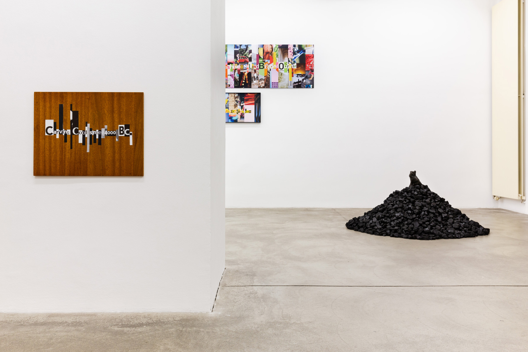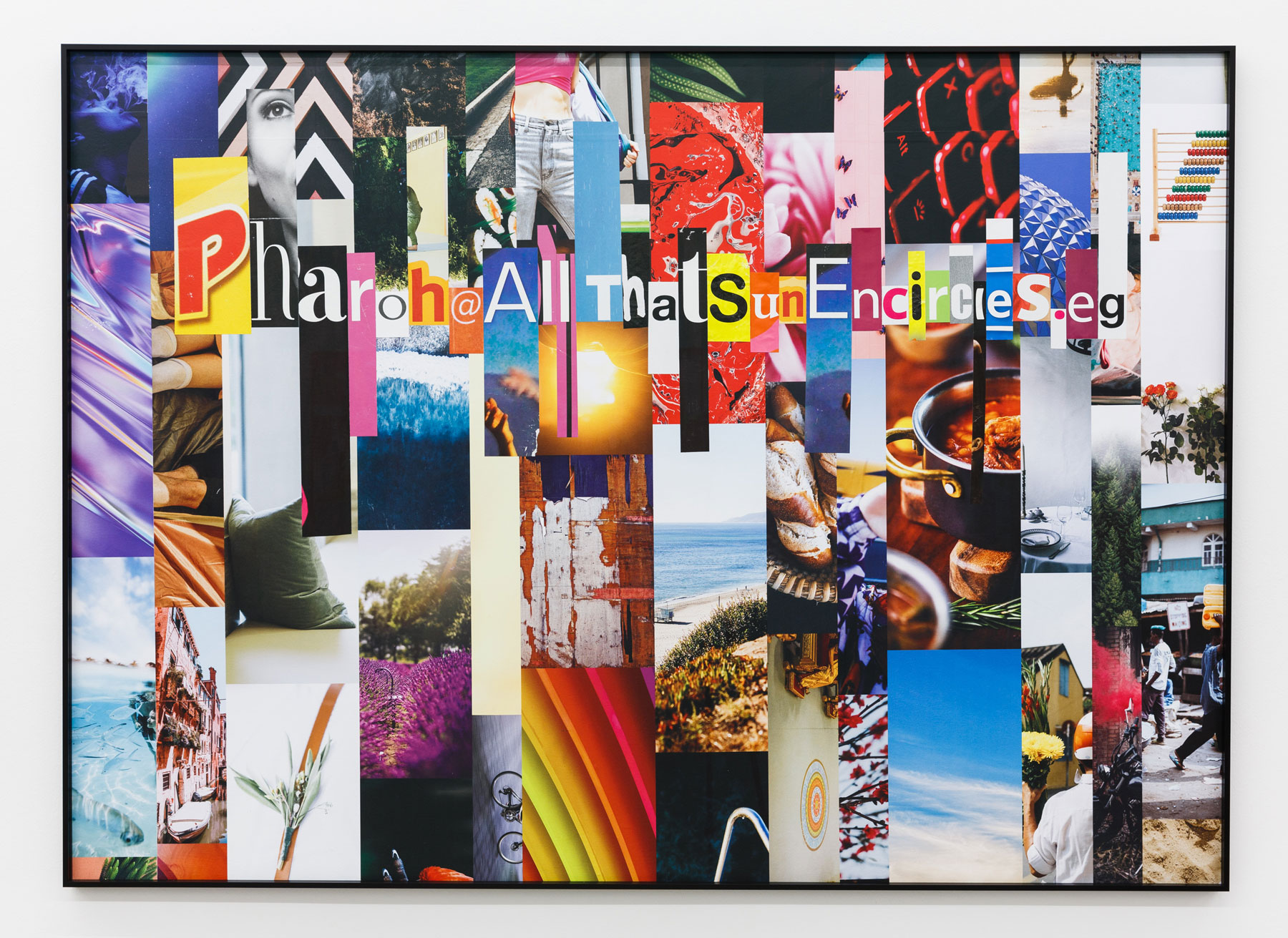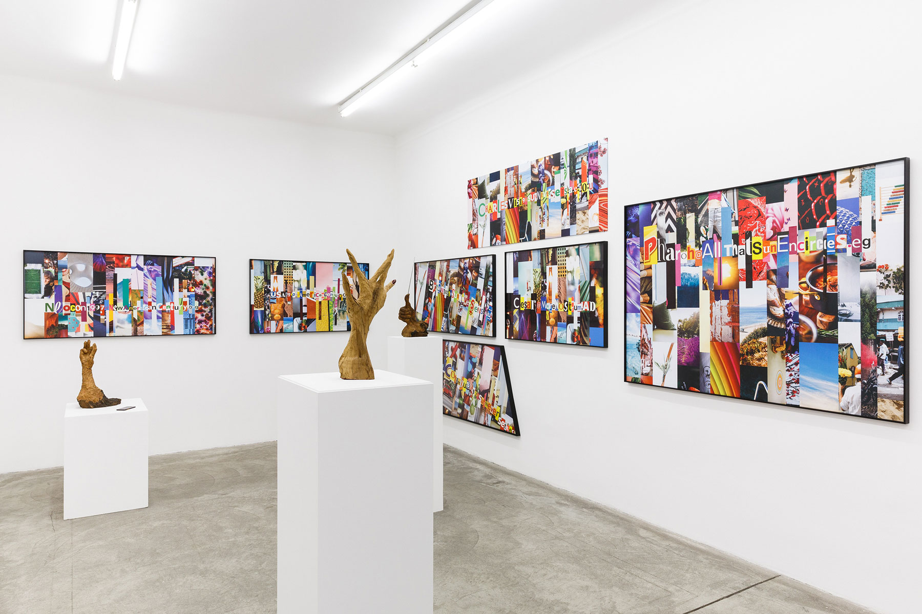 For his third solo exhibition at Galerie Martin Janda, Balteo-Yazbeck has collaged and assembled materials and topics from advertising, propaganda, the news, social media, sleek technologies and even interior design. He has also enlisted some artist-friends by including their works, thereby adding to each other’s anthropocentric anxieties. In his most recent series, All the Lands from Sunrise to Sunset (2018), different iterations of this age-old maxim evoke the evolution of hubris for more than four thousand years up until the present. Spelled in extremely colorful collages and encoded as hashtags or email addresses such as Britain1821@SunNeverSets.co.uk, they resemble cut-out-letter ransom notes.