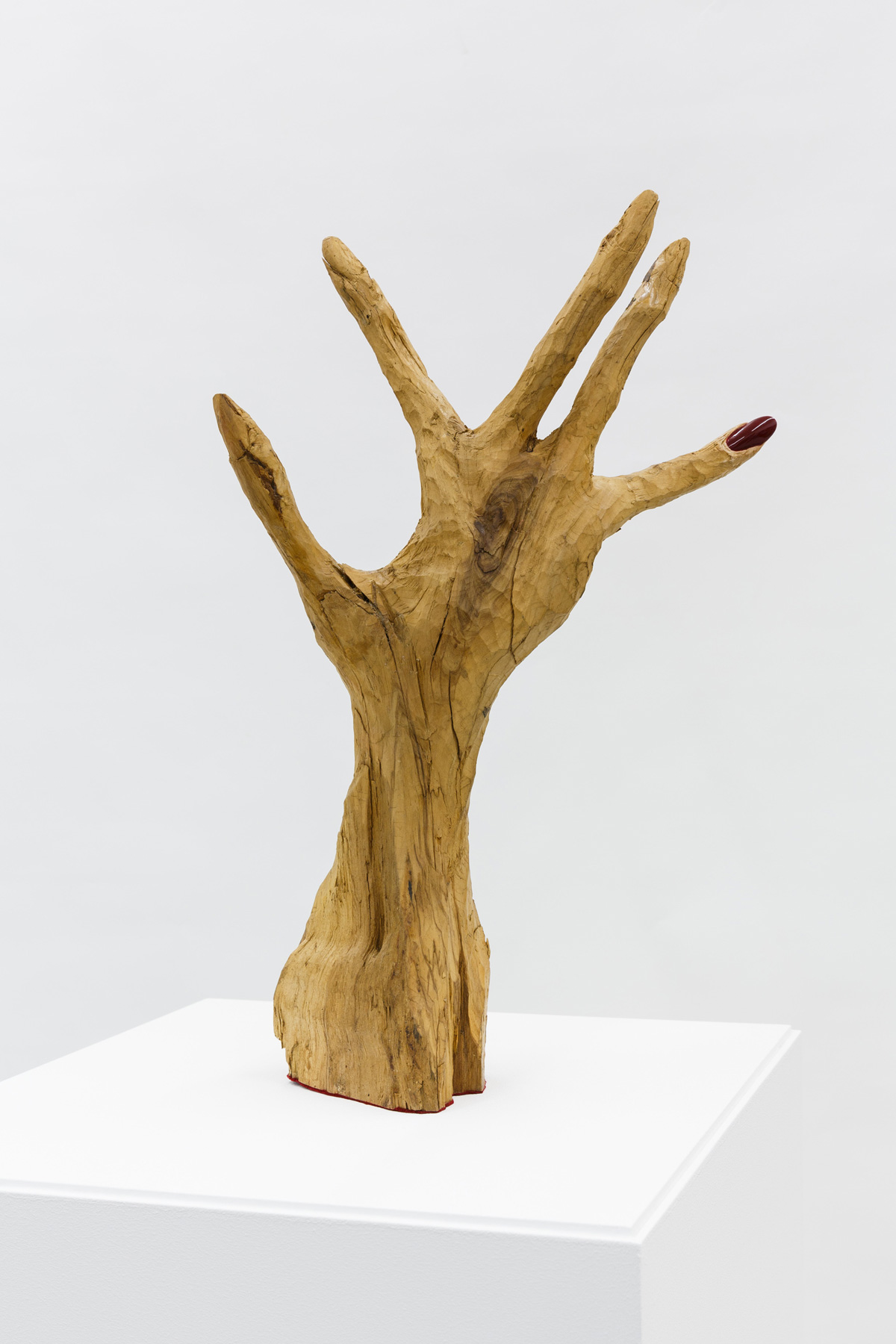 This series includes sculptures carved in olive wood and shaped as human hands, originally created by Attilio Napolitano, that Balteo-Yazbeck has nonchalantly intervened in different ways. Also part of the series, the small installation Backup (2013), originally made by Judith Sönnicken is now shown against a photo-collaged background, refers to our shared anxiety over losing digital archives. These three-dimensional works confront us with disparate technologies parading as human practices in our contemporary civilization — from ancient Chinese formulas for nail polishing and shellac, to coal as a fossil fuel, cellphones and GPS.