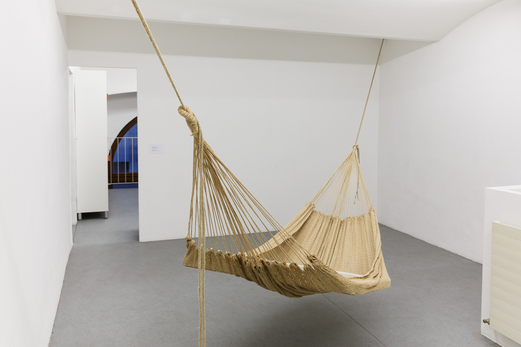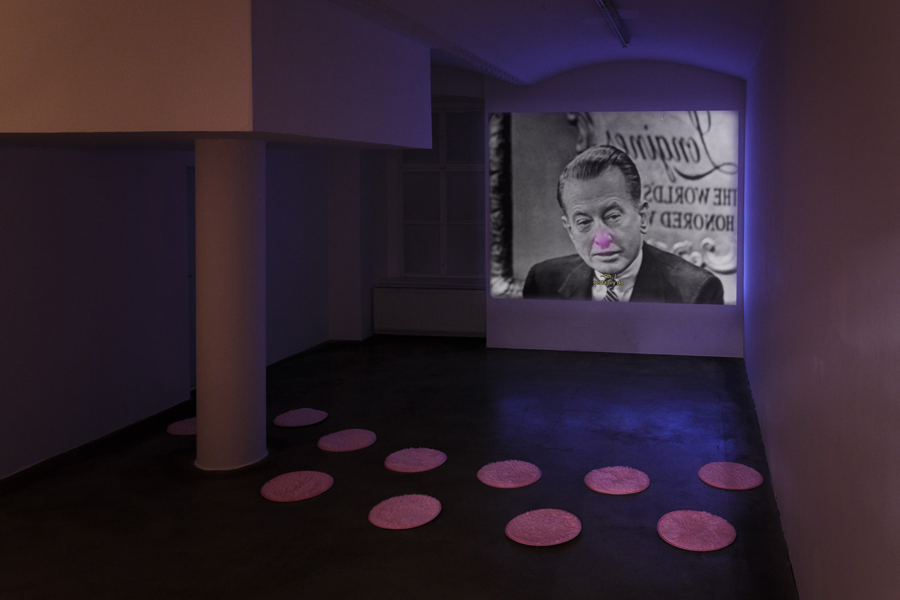 These themes refer back to some of Balteo-Yazbeck’s preceding work, which likewise addresses the uneven development of technological ecosystems. Such is the case of Warao Chinchorro (2014), an installation featuring a framed, slick photograph by Holger Niehaus resting peacefully on a handmade palm fiber hammock — a furniture type produced by the Warao, an indigenous group living in the Orinoco river delta. This and other installations in the exhibition could pass for post-conceptual exercises were it not for the humor and wit the artist deploys to point to contemporary topics. In these works, color is almost absent. Black is perhaps the only formal element shared by this selection of ready-made objects or materials, but it is used only to be countered. For example, in Chronoscope, 1952 or 1953, 11pm. (2017), a TV broadcast from CBS’s Longines-sponsored public affairs show featuring a troublesome political discussion is projected in its original black and white version, which the artist disrupts with pink stains at particularly hopeful moments. A matching pink carpet arrangement for the viewers to sit on “really ties the room together”…