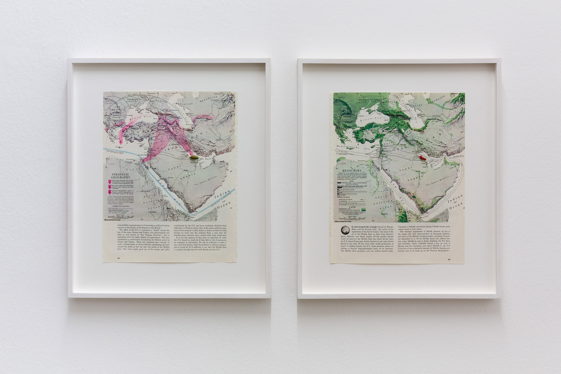 Cardamom and rose pepper glued on maps (four pages, lithographic print, Fortune magazine 1951) custom mounted on conservation mat board, individually framed, edition of 3 + 1 A.P., 2 parts, each 45.5 × 38.5 × 3.5 cm
