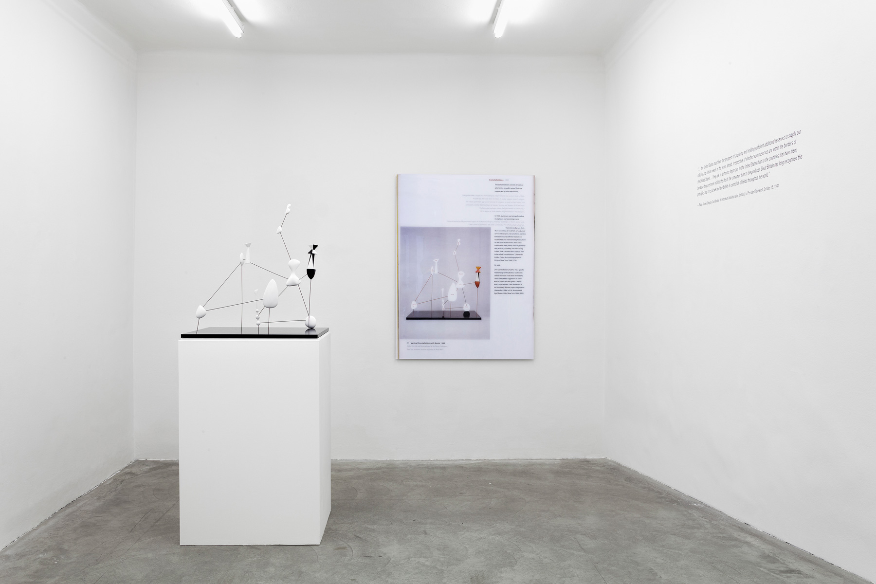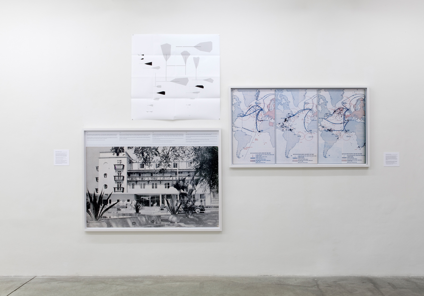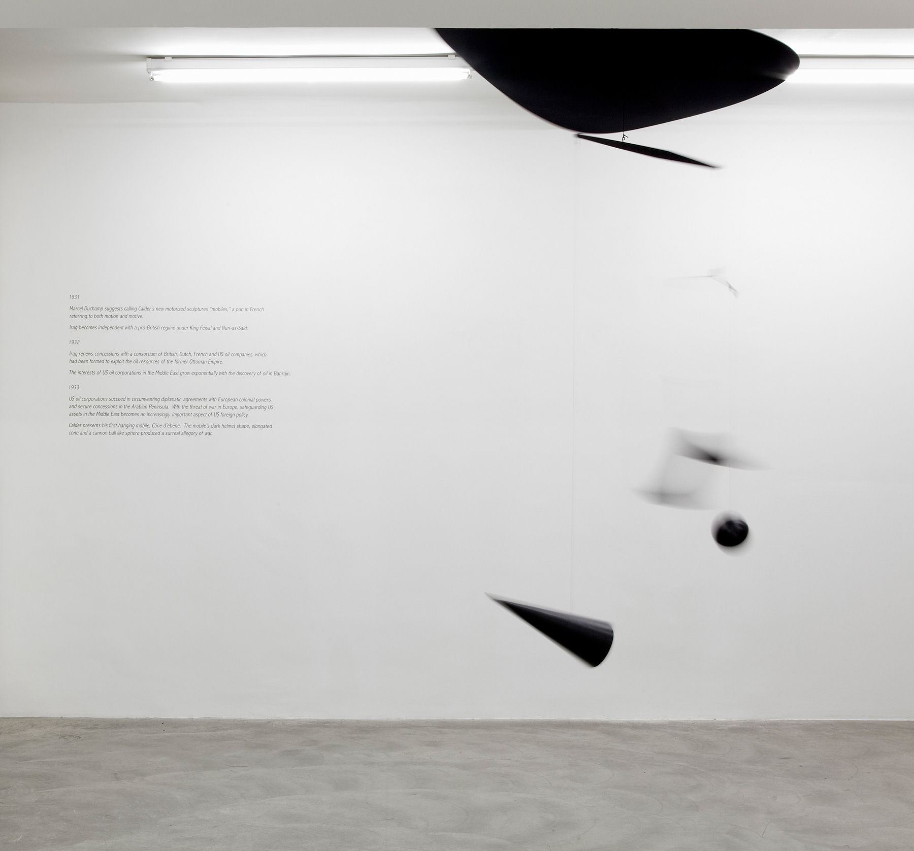 In the pieces on show here, Balteo-Yazbeck makes reference to works by Alexander Calder, linking the latter’s aesthetic formalism with the political events under way at the time of their creation. He works in a variety of media including photography, film and installation, often making use of found material, for example photographs, maps and newspaper cuttings. His works question and analyse propaganda strategies of the post-war western world, when contemporary artworks were used systematically to convey such values as freedom, prosperity, security and utopias. Balteo Yazbeck combines this set of concerns with US interests in petroleum and the contingent economic and political ties which have persisted to this day.