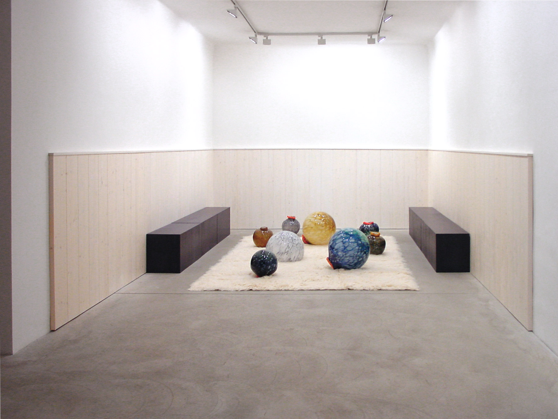 8 mouth-blown glass marbles, flokati rug, wood panelling, glazed wooden benches, 180 × 500 × 600 cm