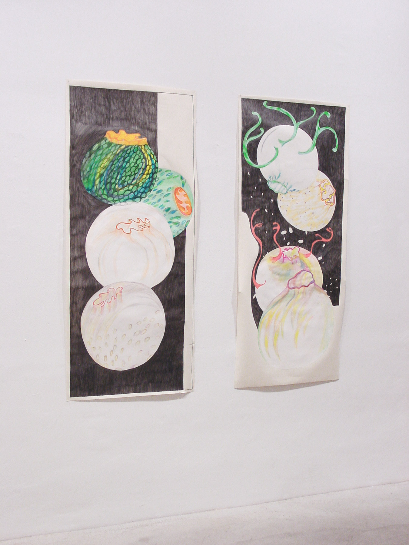 Der Raum ist mit einer an ein Gasthaus erinnernden Wandvertäfelung ausgestattet. Dunkle Bänke umgrenzen mundgeblasene bunte Glaskugeln in verschiedenen Größen, die auf einem hochflorigen Teppich gelegt sind. Diese Früchten ähnliche Objekte sind in unterschiedlichsten Dekors gestaltet. Die Materialien sind bewußt in ihren Eigenschaften und Farben gegensätzlich: weich, hart, zerbrechlich, schwarz, weiß und unglaublich farbintensiv. All diese Faktoren können auch in ihrer inhaltlichen Bedeutung überprüft und gelesen werden: Frucht, Fell, Gaststube usw.