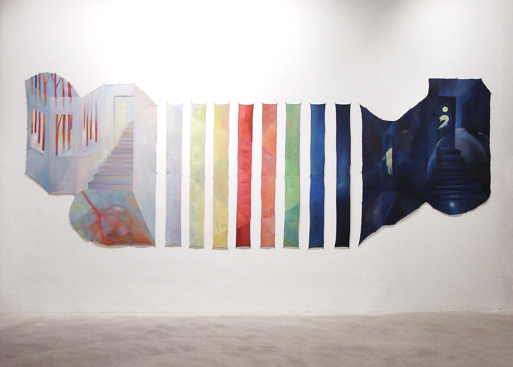 Der zweite Raum der Galerie ist einem großen Ölgemälde von Irene Hohenbüchler vorbehalten. In der Zeit des Lichts, in der Zeit der Dunkelheit besteht aus zehn Bildteilen in amorphen Formen. Ein Tag- und ein Nachtraum werden durch vertikale Bildteile miteinander verbunden. Neben dem Titel des Bildes kommt in diesen verbindenden Teilen auch der Name und das Geburtsdatum des Kindes von Christine Hohenbüchler als Textelement vor. In zwei unterschiedlich formalen und stofflichen Versuchen werden Fragen nach sehr persönlichen, biographischen Momenten als Möglichkeit der Erklärung gesellschaftlicher Phänomene gestellt: nicht als kühle Analyse oder präzise Recherche anhand faktischer politischer Ereignisse, sondern übertragen in den Alltagsablauf der Geschwister mit der Sicherheit, diesen Fragen auch adäquat zu begegnen.