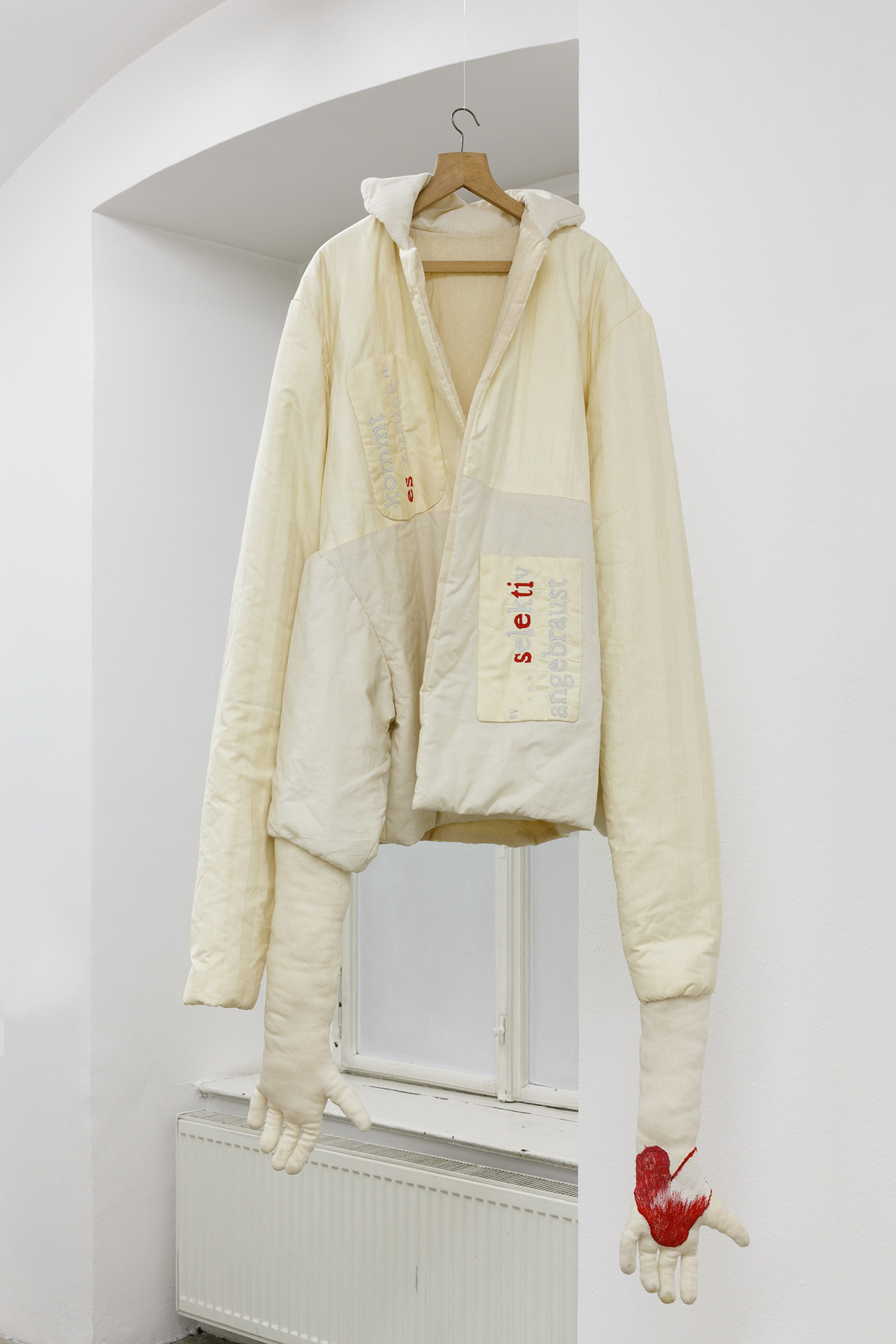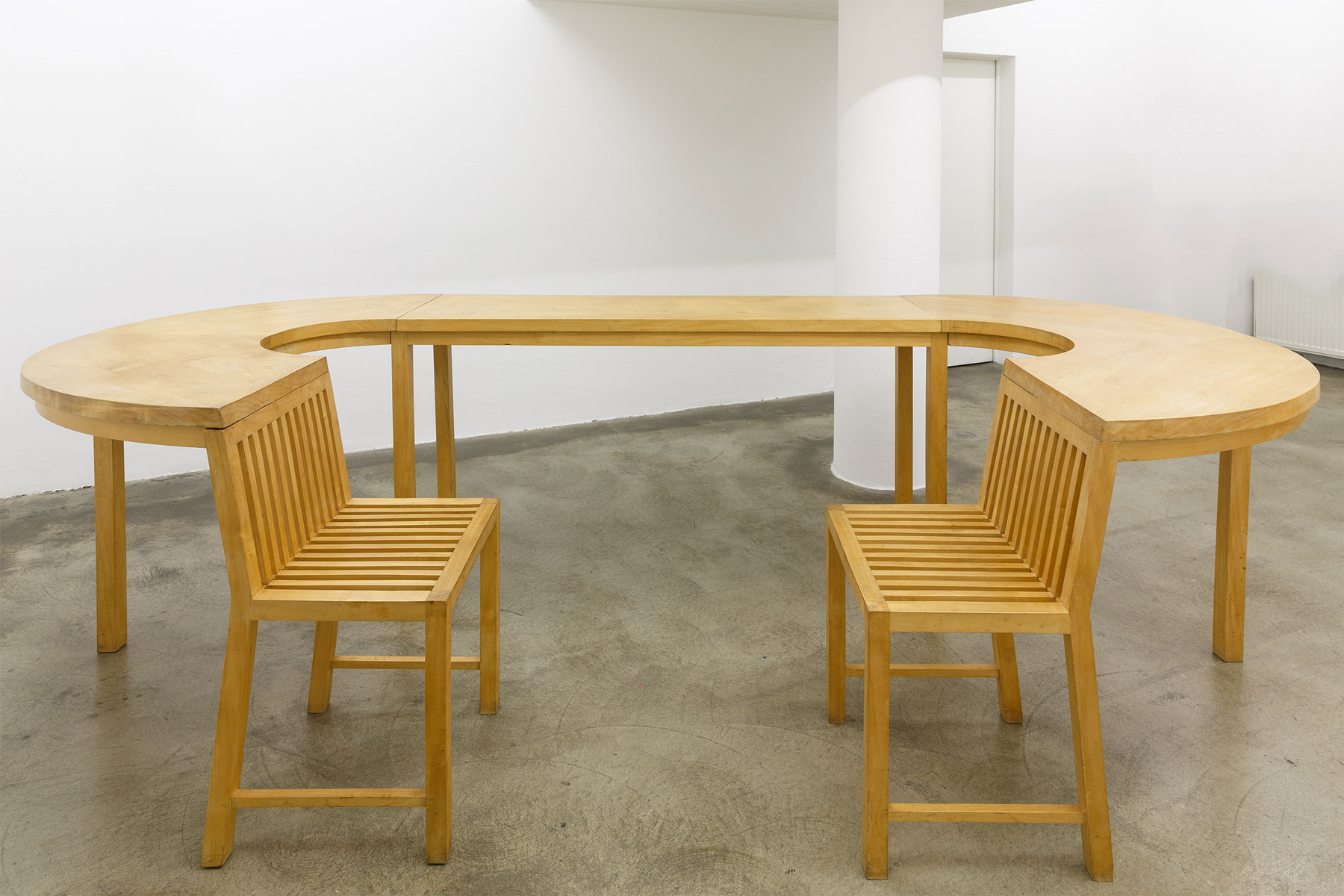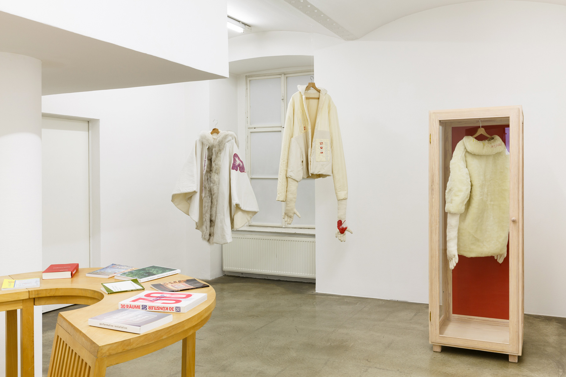 The phenomenon of different types of communication was visualised back in 1995, in the DAAD TISCH table, completed in Berlin while on a DAAD scholarship. The personal realm frequently plays a part in the process of engaging with social structures and their composition, as is also reflected in the wardrobe-style display cases containing clothes that embody specific fashions, shapes and periods of taste. The focus on the body is also recognizable in the recent drawings, where alien-like figures appear in the images and, as so often in the Hohenbüchlers' works, address issues of the need for protection, exclusion and a necessary sense of togetherness.