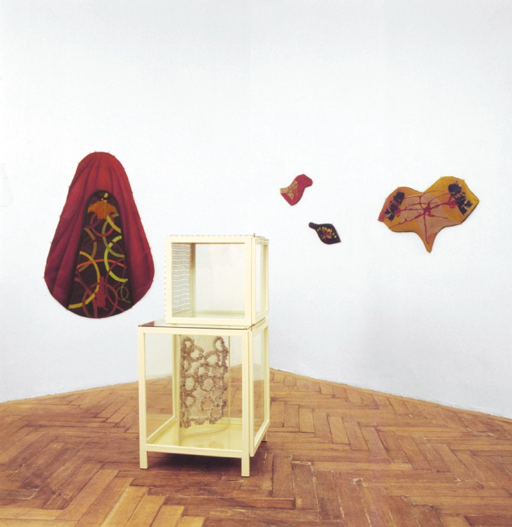 Die Vitrinenobjekte von Christine Hohenbüchler, im Atelier des Forum Marktl entstanden, lassen in Farbe und Form die Nähe zu Krankenhausausstattungen oder medizinischen Schränken aus Arztpraxen erkennen, werden aber durch die Applikation von Tafeln verschweißter Aluminiumputzen verfremdet — Schutz, Gitter, Bekleidung. Diese Vitrinenobjekte „beherbergen“ die bemalten Wäschestücke und Vasen sowie die Zeichnungen von Elfriede Skramovsky.