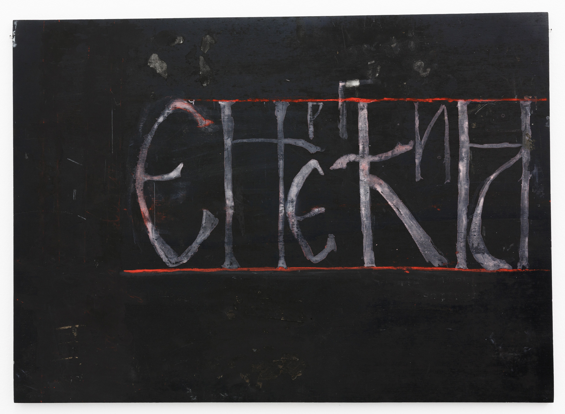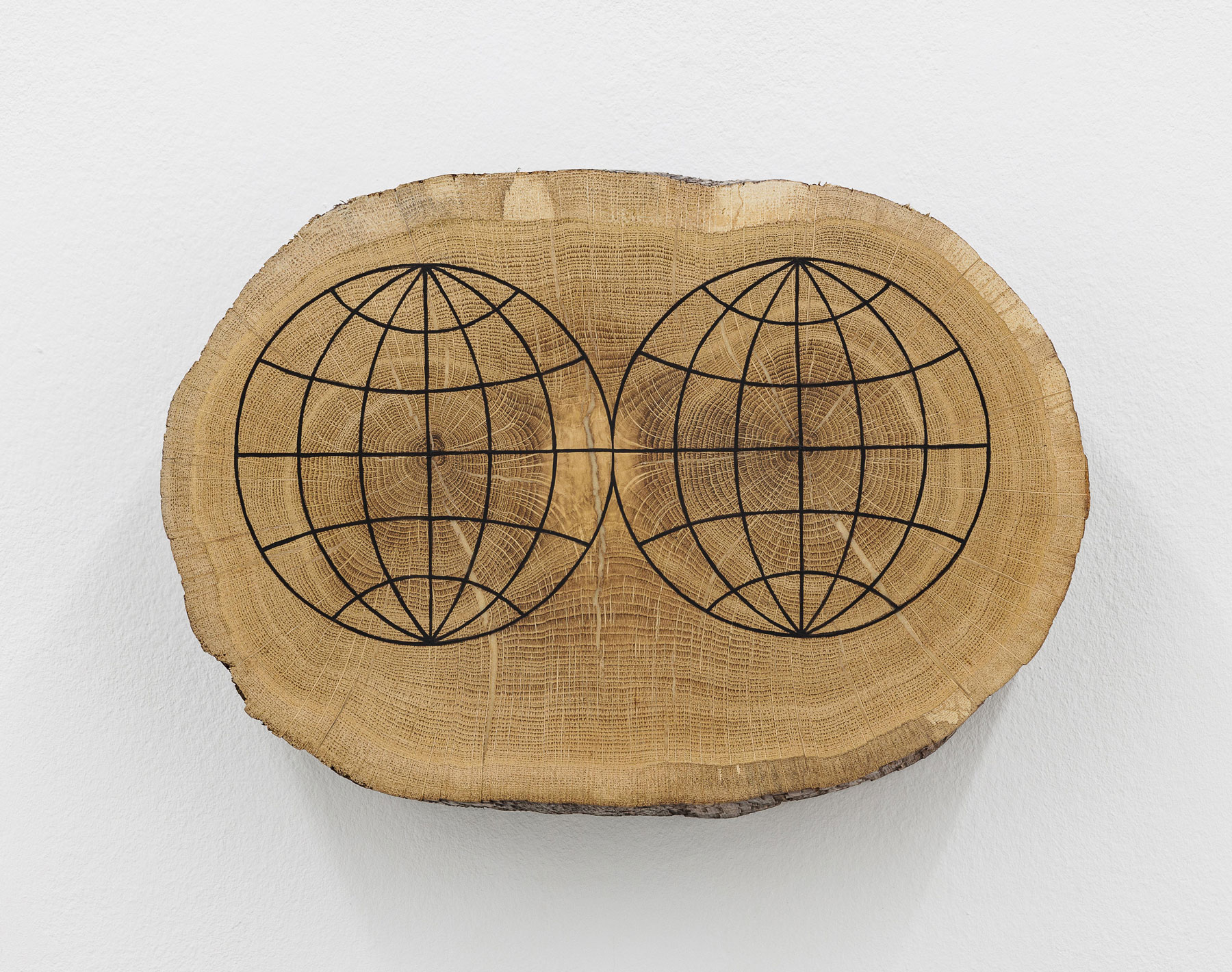 The contour of an absent rear-view mirror, identified in the title of Roman Ondak’s work, Erased Wing Mirror (2013), also denies the reflection of our face, suggesting the impossibility not only of facing ourselves as other, but also of looking back, which is, after all, what rear-view mirrors allow us to do. Placed over a relief map, the cut-out mirror evokes the idea of journey and of borders as inevitably linked to the temporal dimension of travel, and the difficulty to orient ourselves in absence of a historical perspective. Ondak returns to the trope of the mirror, albeit less explicitly, in his new piece Parallel Worlds (2022), in which the two contiguous representations of a globe, where the lines that represent latitude and longitude of the geographic coordinate system are engraved, overlapping the concentric growth lines of the section cut of a tree. The ideal nature of the geographical divisions contrasts with the irreducible material condition of the organic tree, not unlike the way in which Tania Pérez Córdova’s Contour #12 (2021) draws a threshold by pouring bronze into a sand mould of lines which, far from their diagrammatical abstraction, spill out of their borders. The lines of ruled notebooks replicated in all Mangelos’s painted manifestos seem similarly imperfect. Hesitant and contingent, they seem almost incapable of fulfilling their function of straightening the calligraphy into a systematic logic. The cadence of the line that constitutes the handwriting in these works (Hamurabi Manifesto, Energia, Manifesto on Thinking No. 1, all dated between 1971 and 1978) is no less decisive than the abstract template that should have normalised it by subjecting it to the order of the parallel lines.
