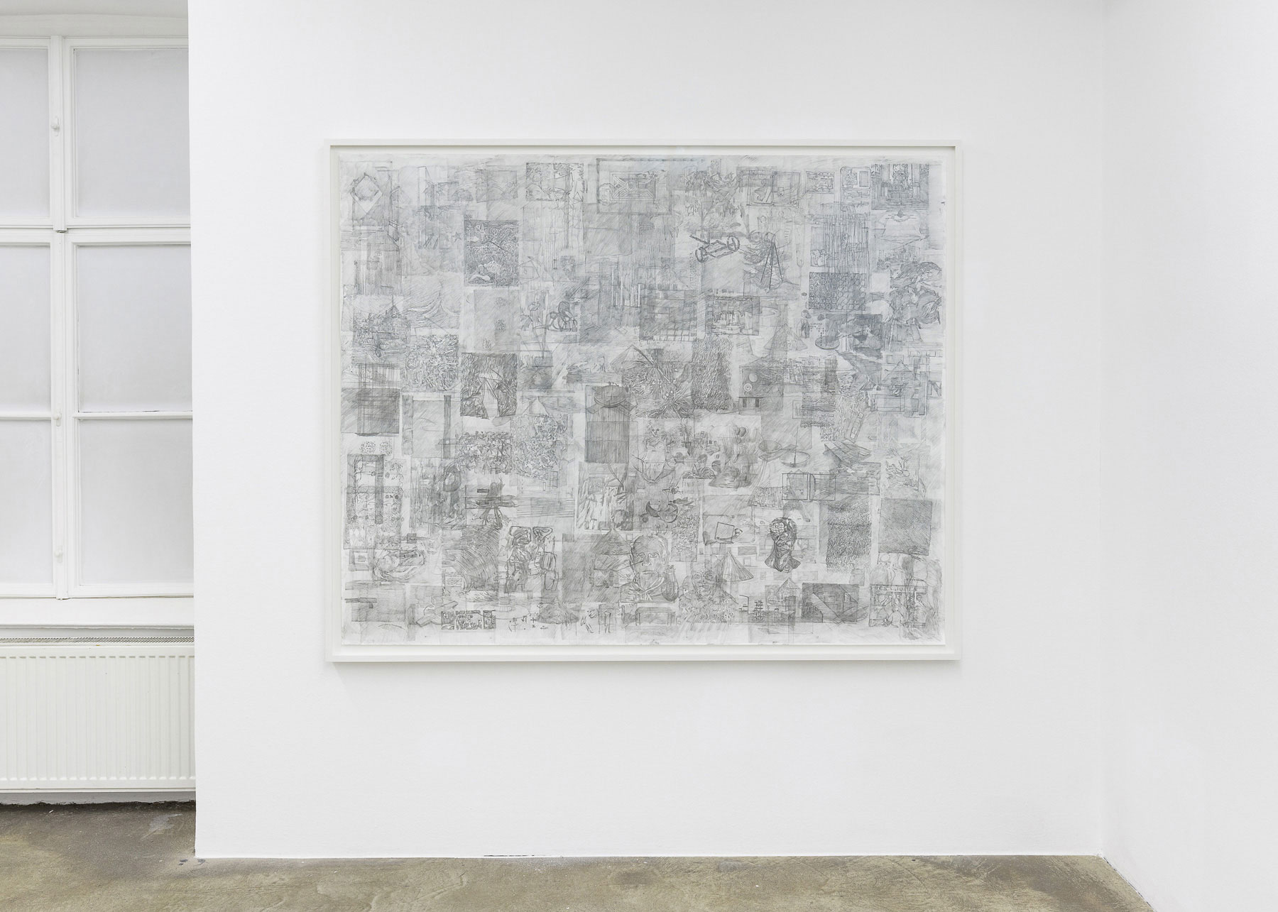 When Ciprian Muresan overlaps several partial casts of busts (Untitled (Portrait), 2021), the multifaceted structure of Macuga’s constellation seems to condense in an equivalent paradox. This method of overlapping is recurrent in Muresan’s work, most notably in his accumulation of lines which, as in a palimpsest, form simultaneous layers of what in its original form would be linearly organised pages in a book (All the Images from the Complete collection catalogue of S.M.A.K., 2019). It is a spatially paradoxical representation of time, both in its overlapping and transparency, and in its spreading throughout the support generating a surface reminiscent of a map.
