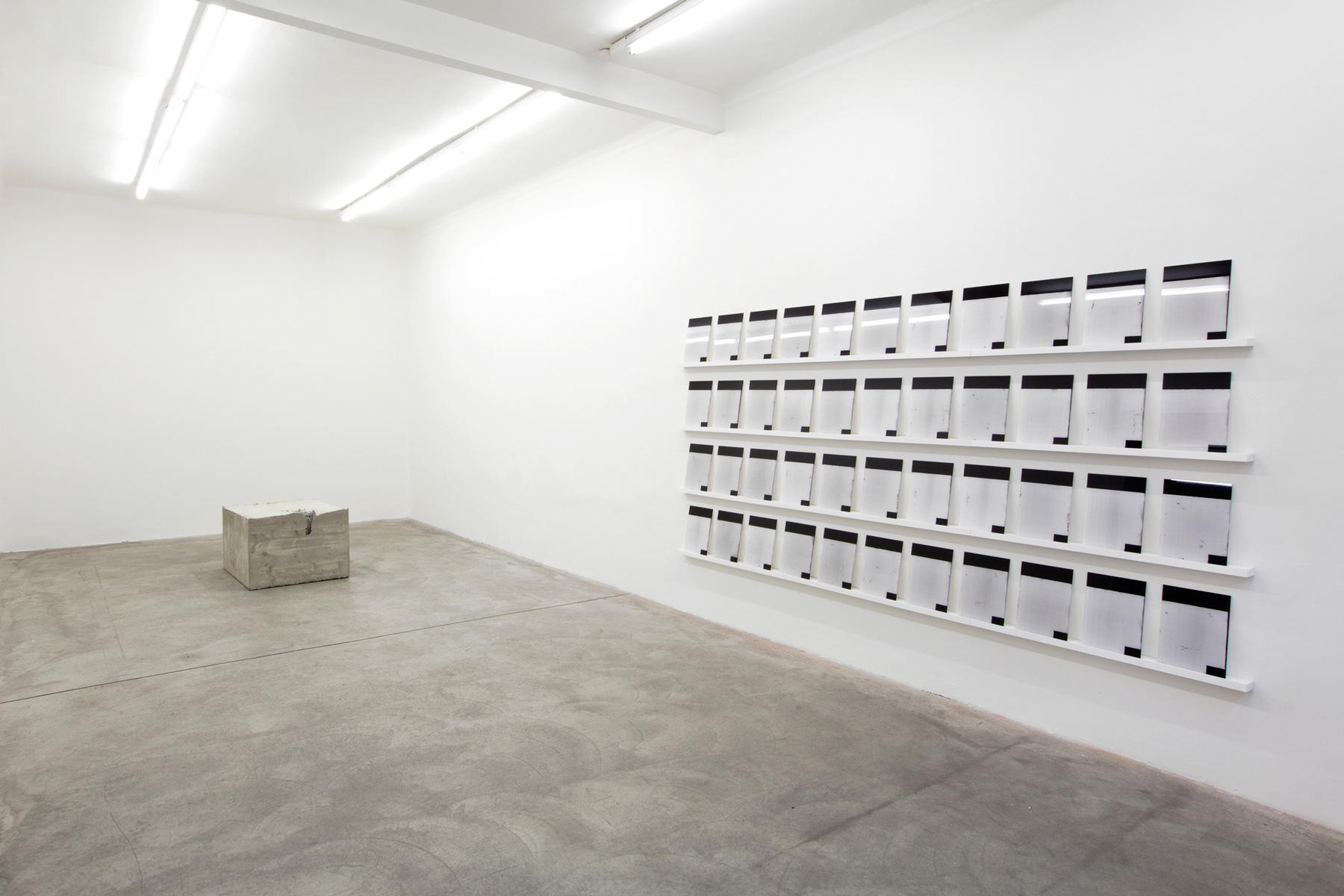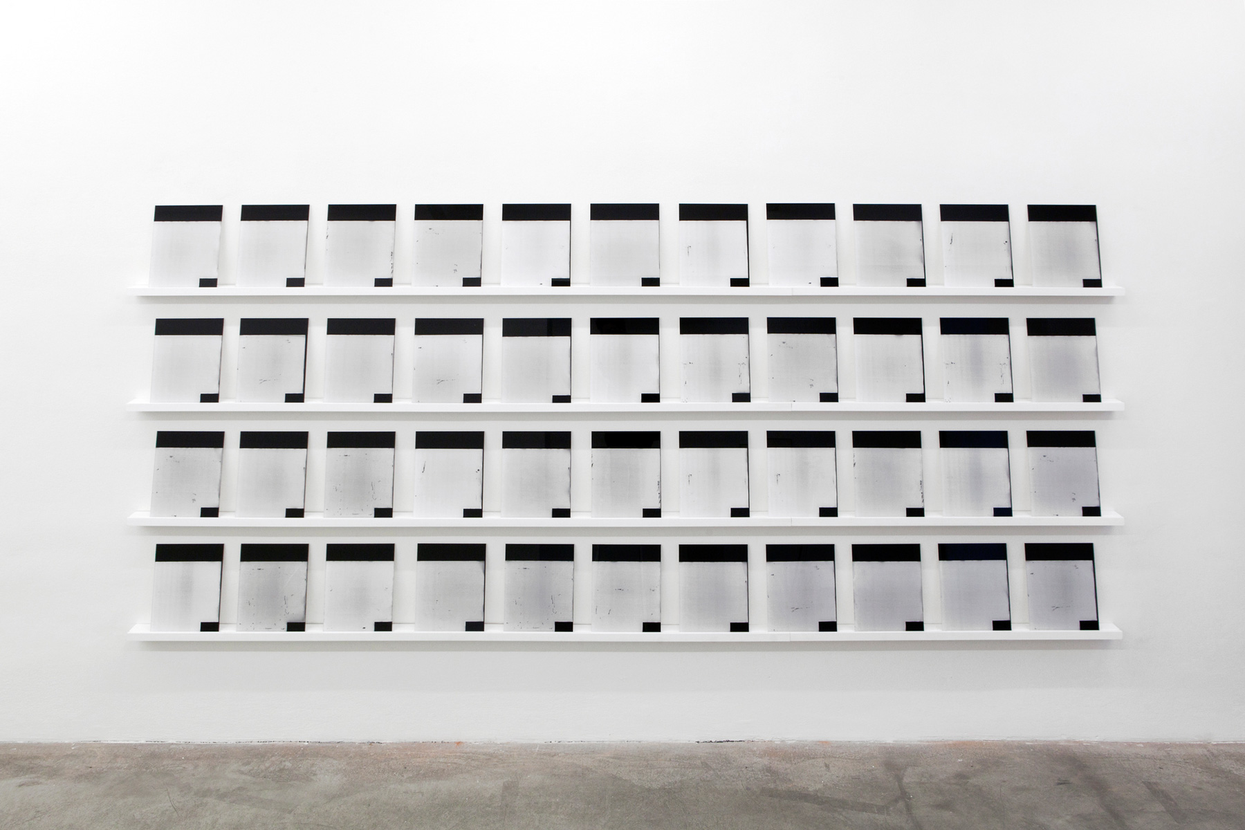 44 photographic prints face mounted onto perspex, wooden shelves, 330 × 168 × 10 cm. Photo: Lisa Rastl