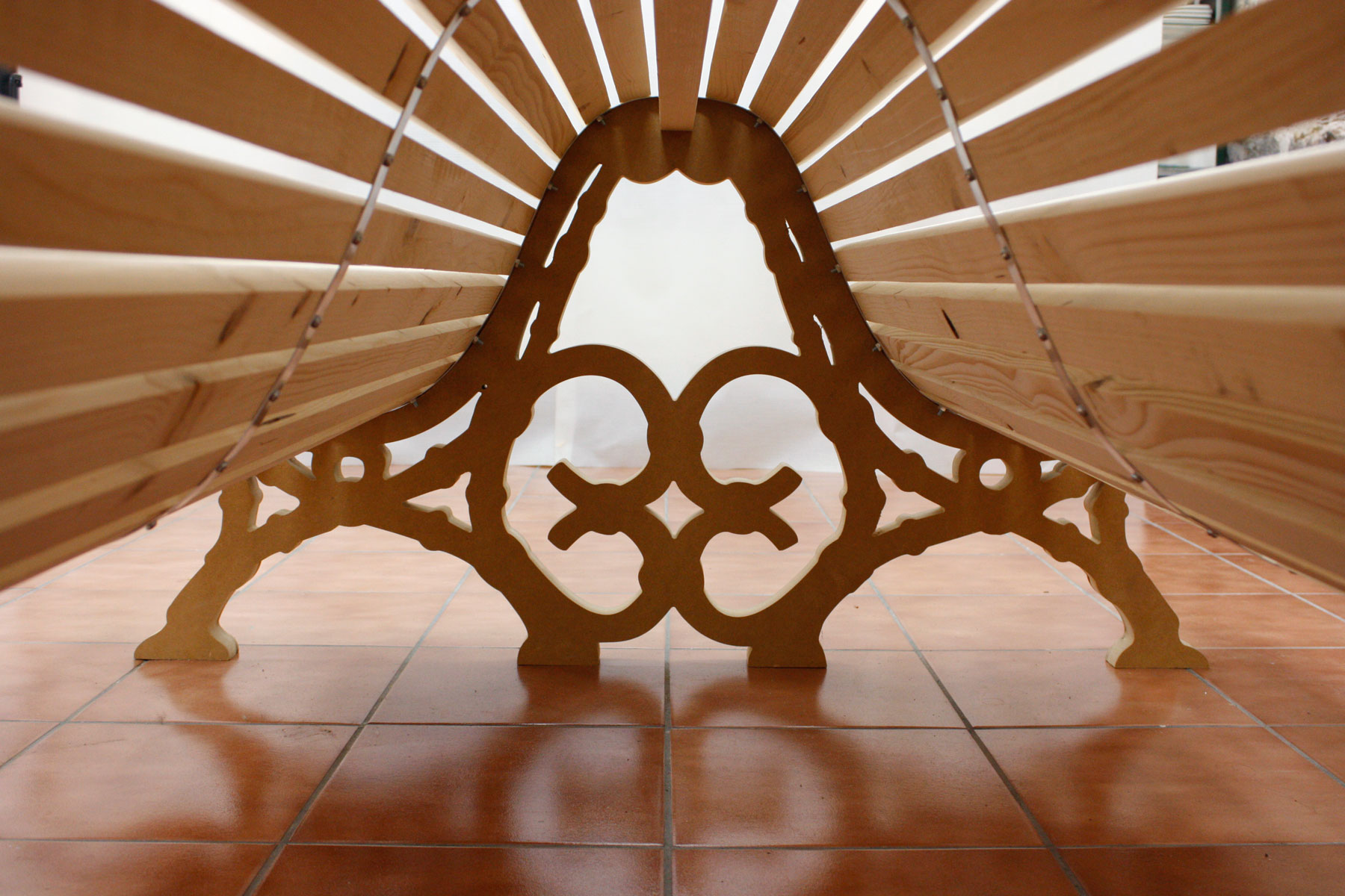 The work of Eulàlia Rovira & Adrian Schindler features a camera-phone film based around a Barcelona park bench, as well as its sculptural reproduction. This model of street furniture is known as the Romantic double, and it inspires a narrative and a sequence of gestures that evoke the masterplans that opened up cramped European cities in the 19th-Century as well as ongoing impulses to organise public space and orchestrate the gaze.