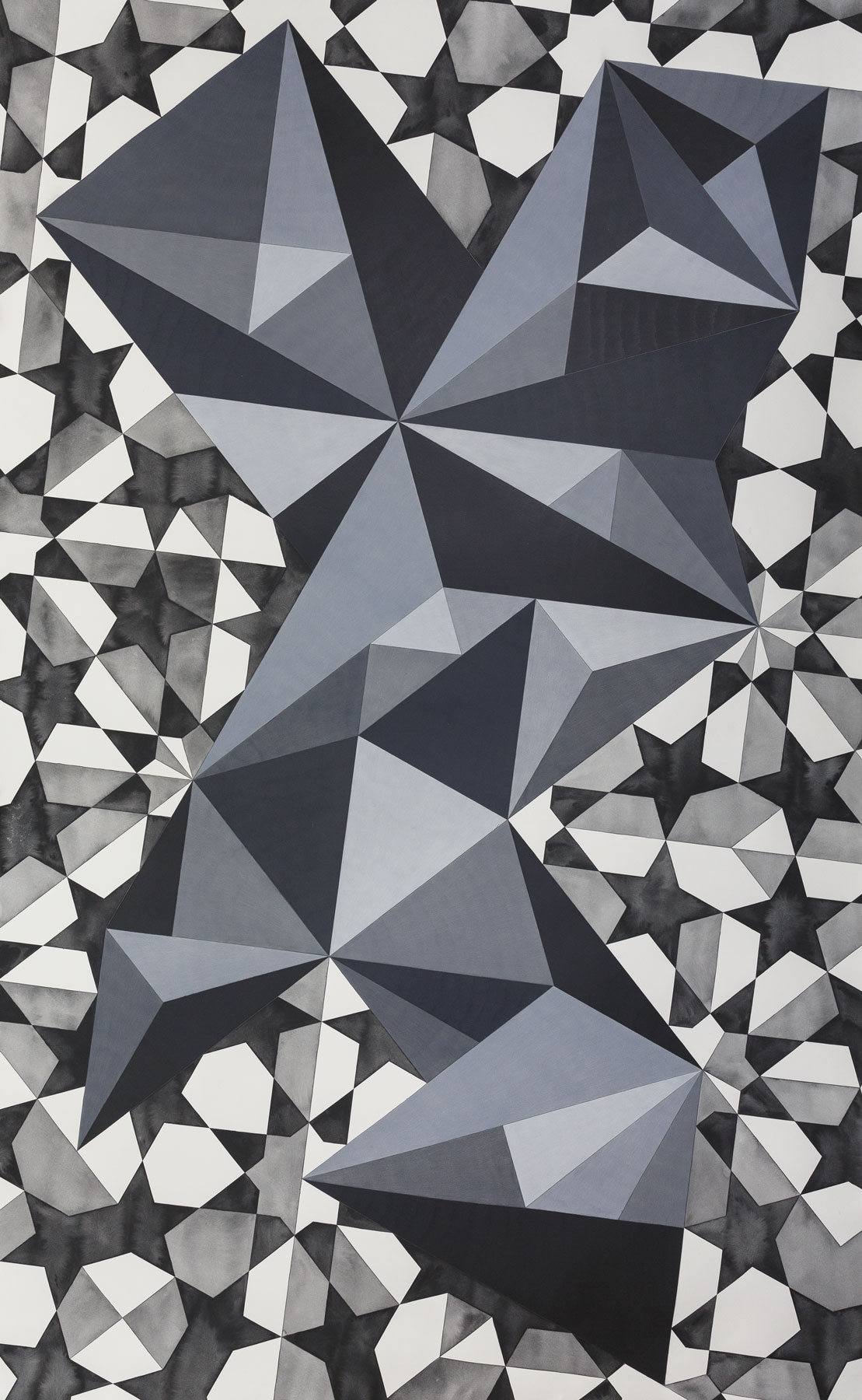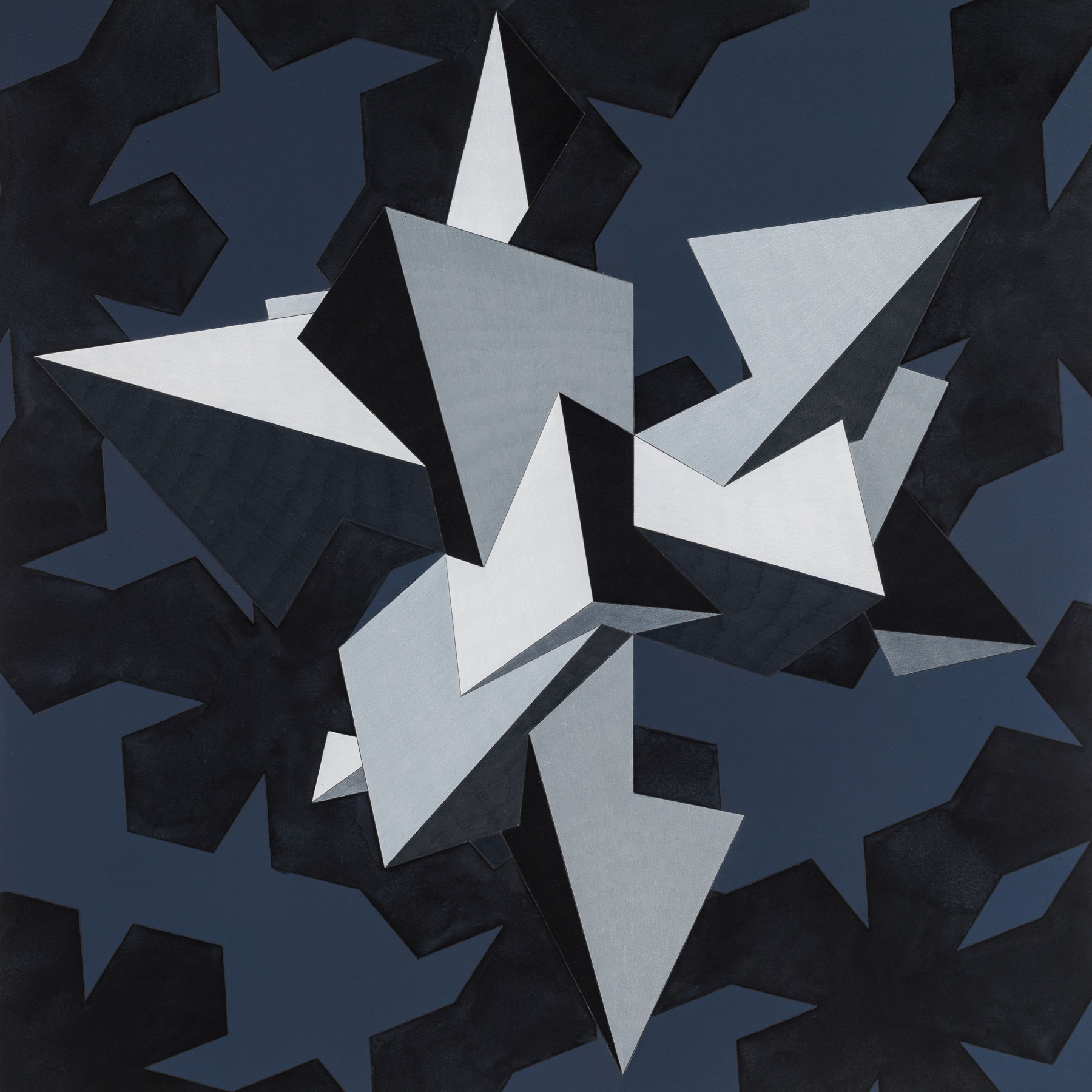 Five tetrahedrons are the origin of the drawings featuring Platonic solids (Tennantit, 2022). The ideal regularity of these complex forms poses something challenging, for their distortion alone leads to irritation. The artist detaches individual elements from the tetrahedrons, so that all forms collide and dynamically interact. Despite the resulting breaks we are still able to intuit the form’s clear underlying geometry.