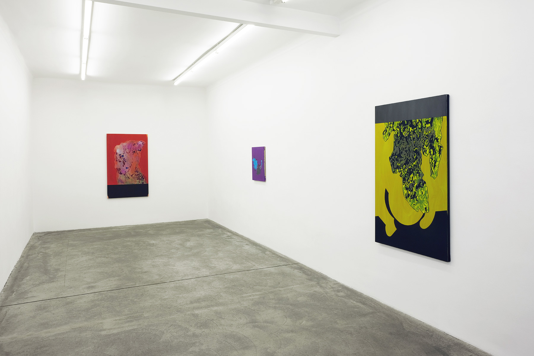 In the first room works from two series by Milena Dragicevic, Supplicants and Erections for Transatlantica, are being shown. In both series she uses a bricolage of gathered imagery, painterly processed, dissected and abstracted, to produce forms which are fused with swaying outlines from intuitive drawings. The abstract forms emerge to distinguish structure within the continuous space of the canvas and even evoke the passage of sculptural notions, before dispersing again into the background. This relationship of tension is heightened by the artist’s use of bold, block colour, which alternates between anchoring the forms onto the canvas and suspending the backdrop.