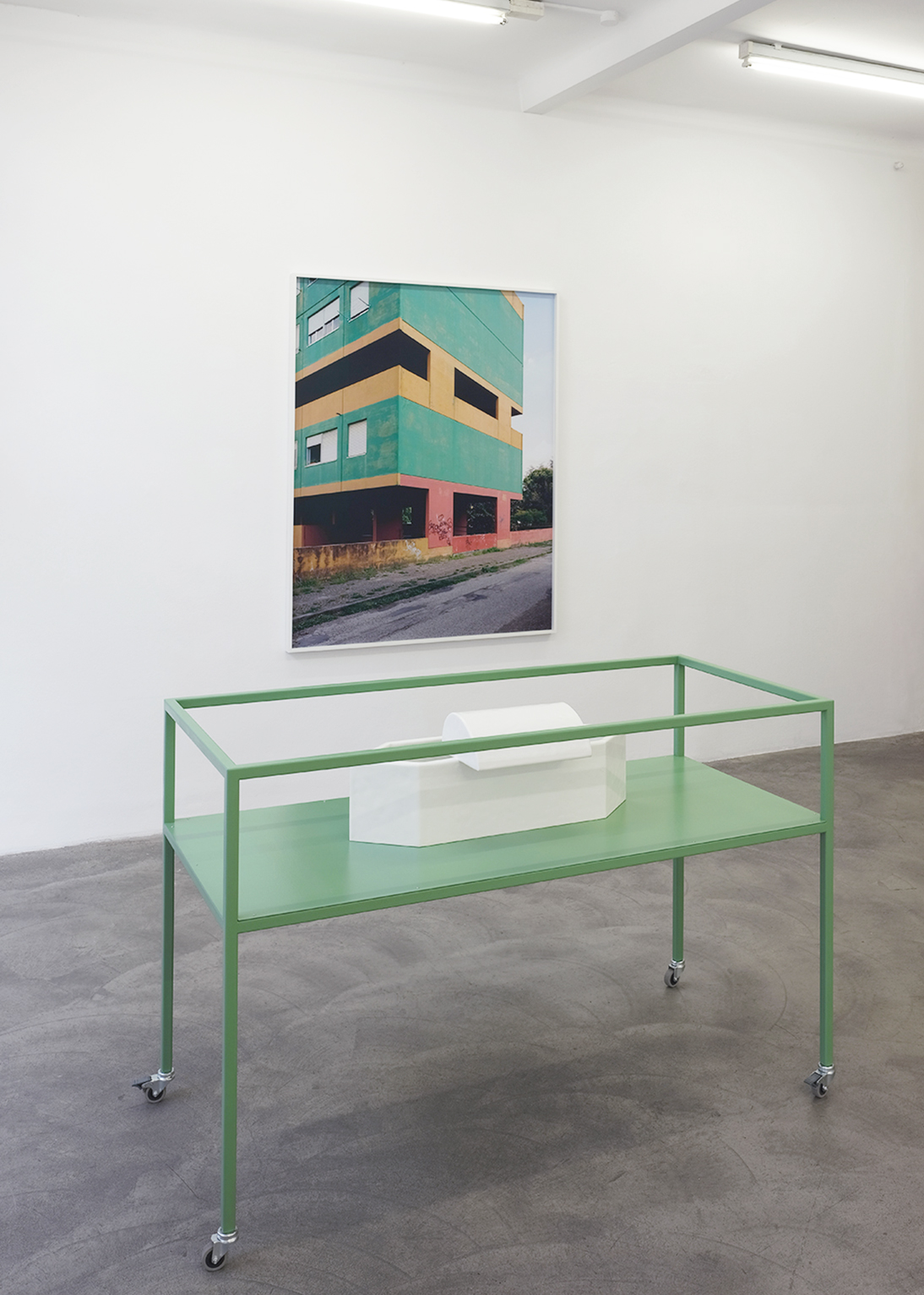 Werner Feiersinger's sculpture is surrounded by two of his photographic works, which contextualise it and create a system of references: One large-format photograph shows a section of a building by Gino Valle in Udine from the 1970s, its specific colour palette relating to Feiersinger's object.