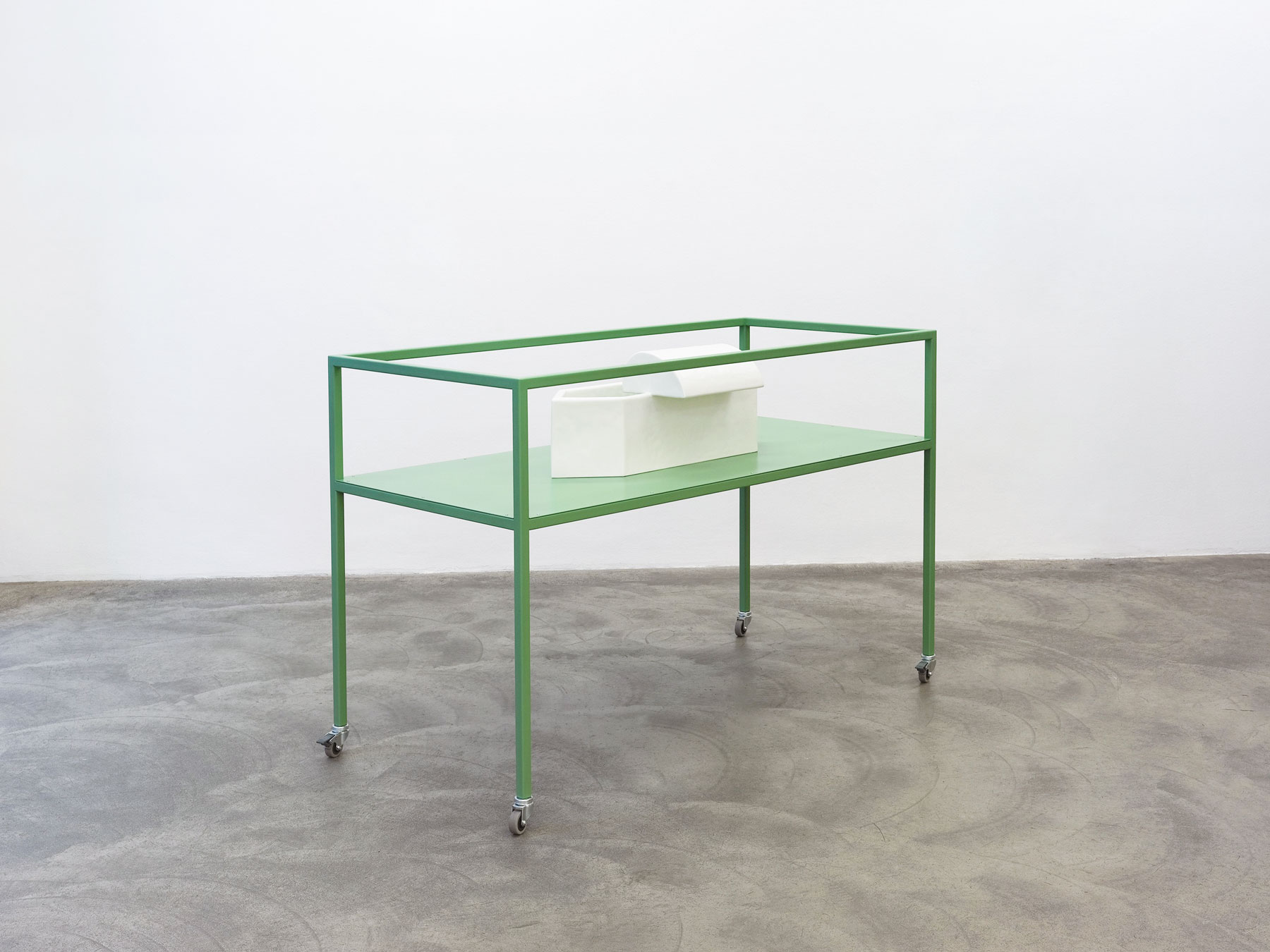An open vitrine made from steel sections, strict in its form, and within it, a fragmentary, model-like, architectural object. Its amorphous surface, carved and covered with a textile layer, is in clear contrast to the cool smoothness of the vitrine with its industrial green paintwork. The sculptural merges with the plastic to form a hybrid object.