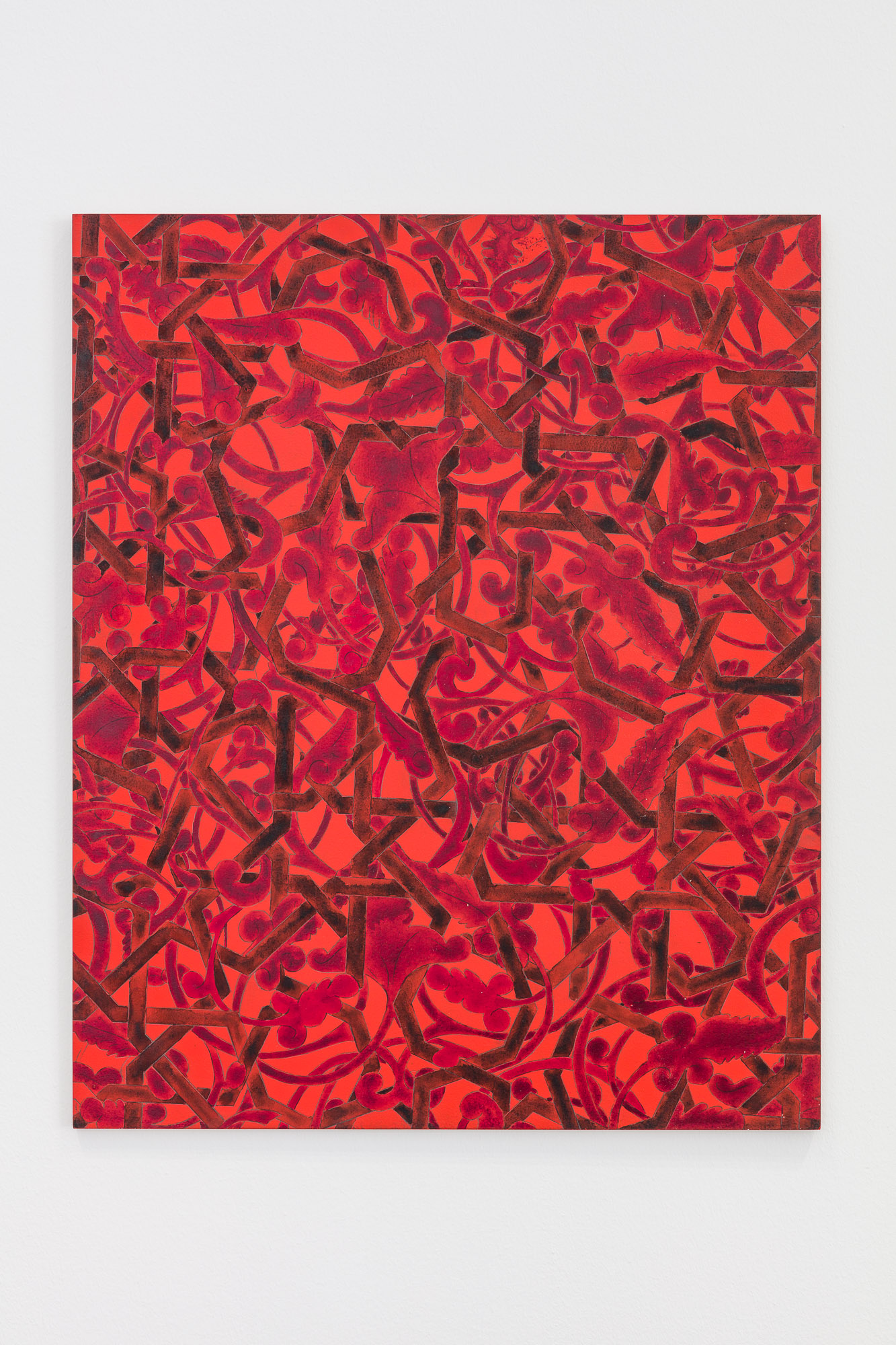 In her new body of works entitled Lajin, Adriana Czernin intertwines different ornamental structures that originate from the so-called Vienna Tableau, a fragment of an Islamic ornament from the 13th century. Czernin multiplies the botanical elements and arabesques of the inlays, and interweaves them with the strict geometric lattice ornament — the result is a dense, almost opaque and wild structure that seems to be in motion.