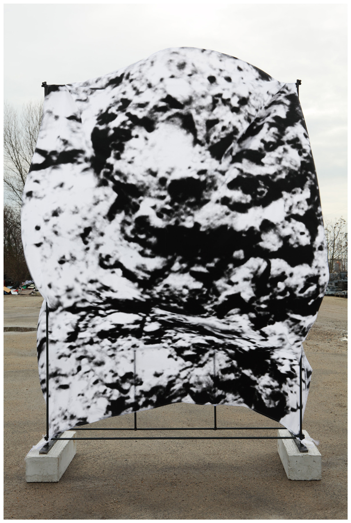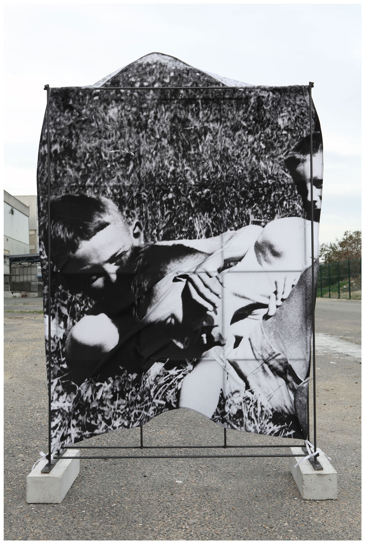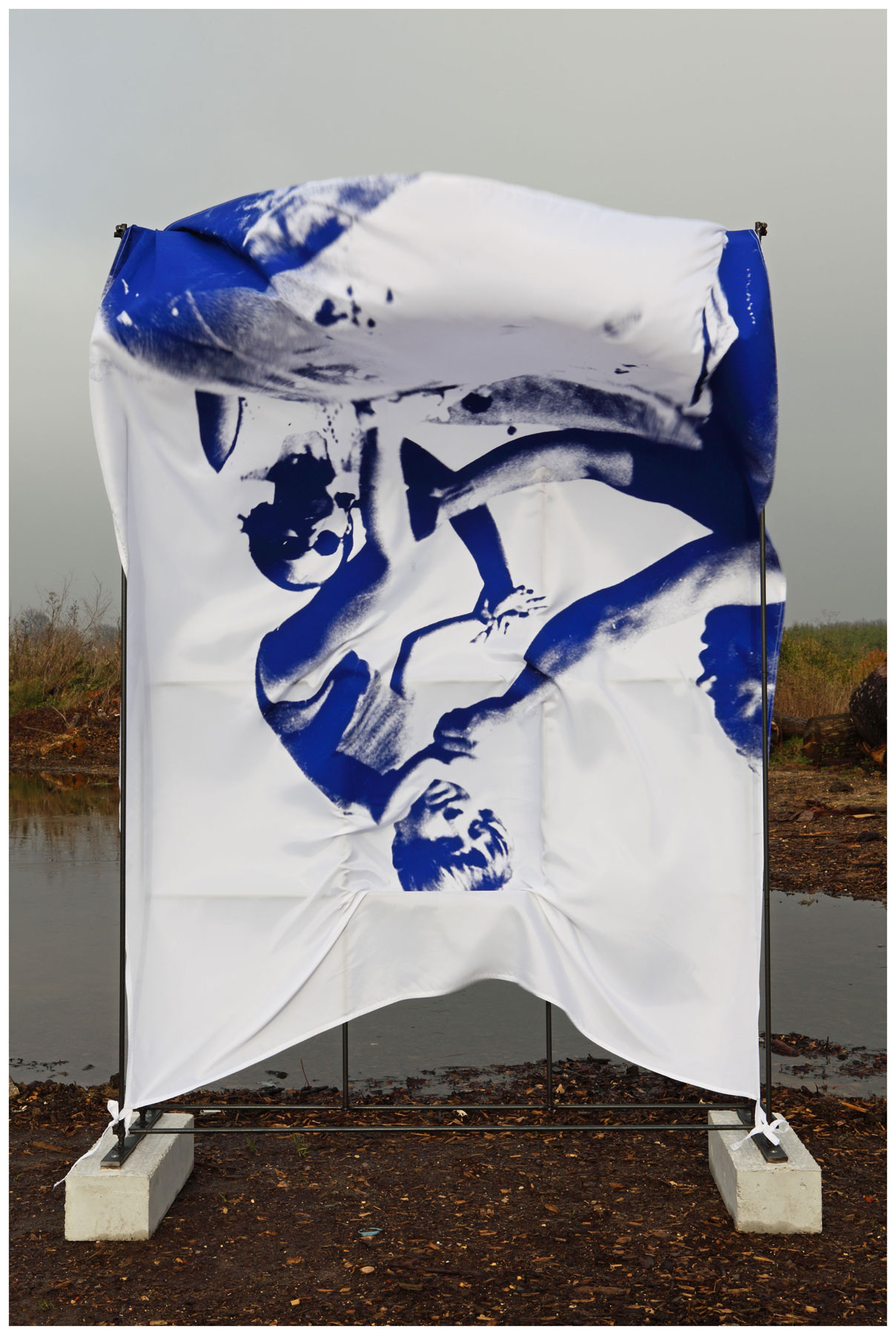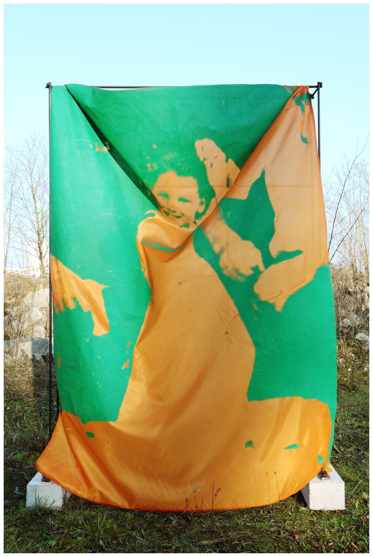 Each of these images depicts a printed fabric sheet fastened on to a metal construction. The cloth banners have been attached to thin metal frames, but appear much too large for them. The wind puffs the sheets up like sails, causing the objects to look even more sculptural. They refuse to adopt a perfect shape at any point; also they never acquire even a hint of being an advertising hoarding. The objects were positioned within industrial wastelands and various interstitial zones of Parisian suburbs before being photographed there — in areas that were devoid of people, completely anonymous, yet also projecting the idea of some sort of a wild and unfettered freedom. Although only a small segment of these places is discernible in each of the photographs, they are important points of reference within the series, expanding, as they do, the motifs employed on the fabrics, such as details from found pictures of children at play or of cloudlike structures. One of the images depicts one particular aspect of a metal casting process.