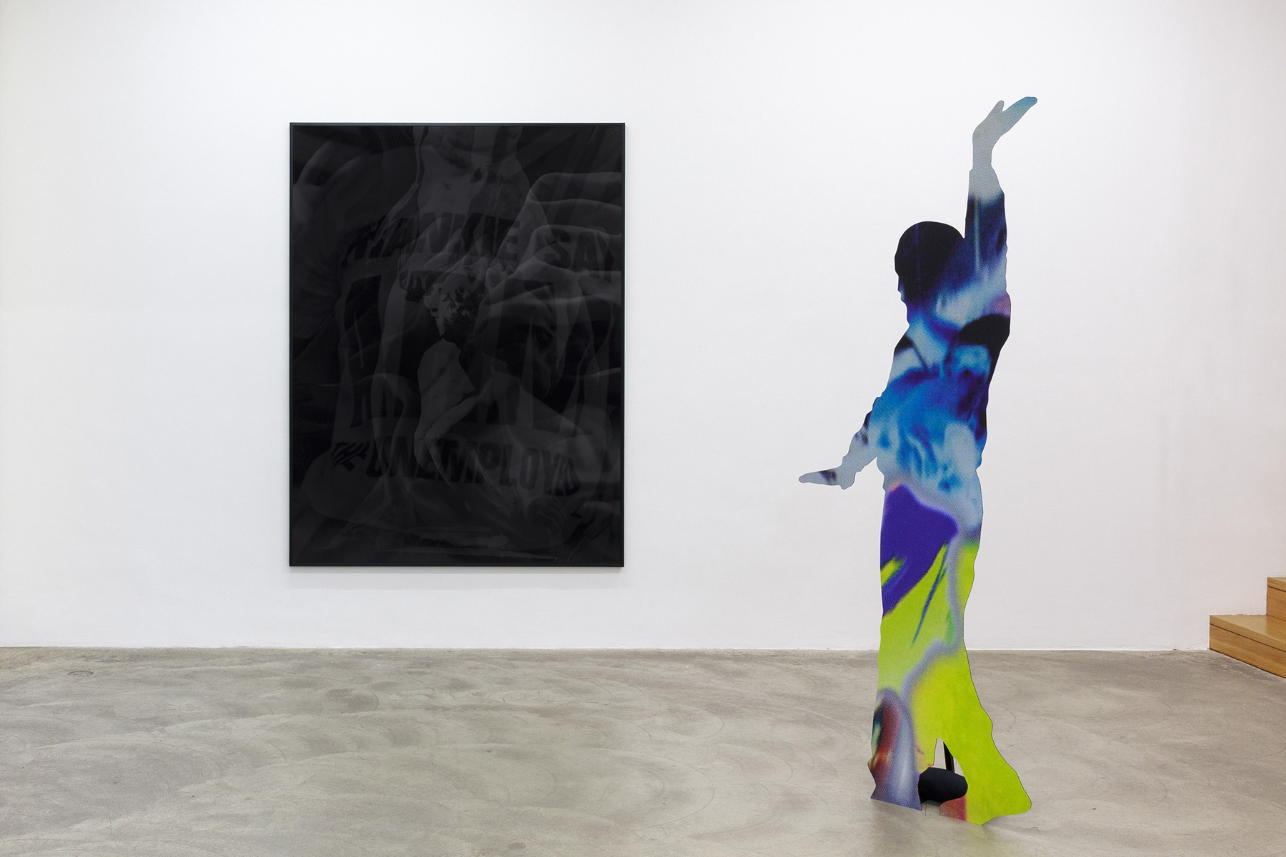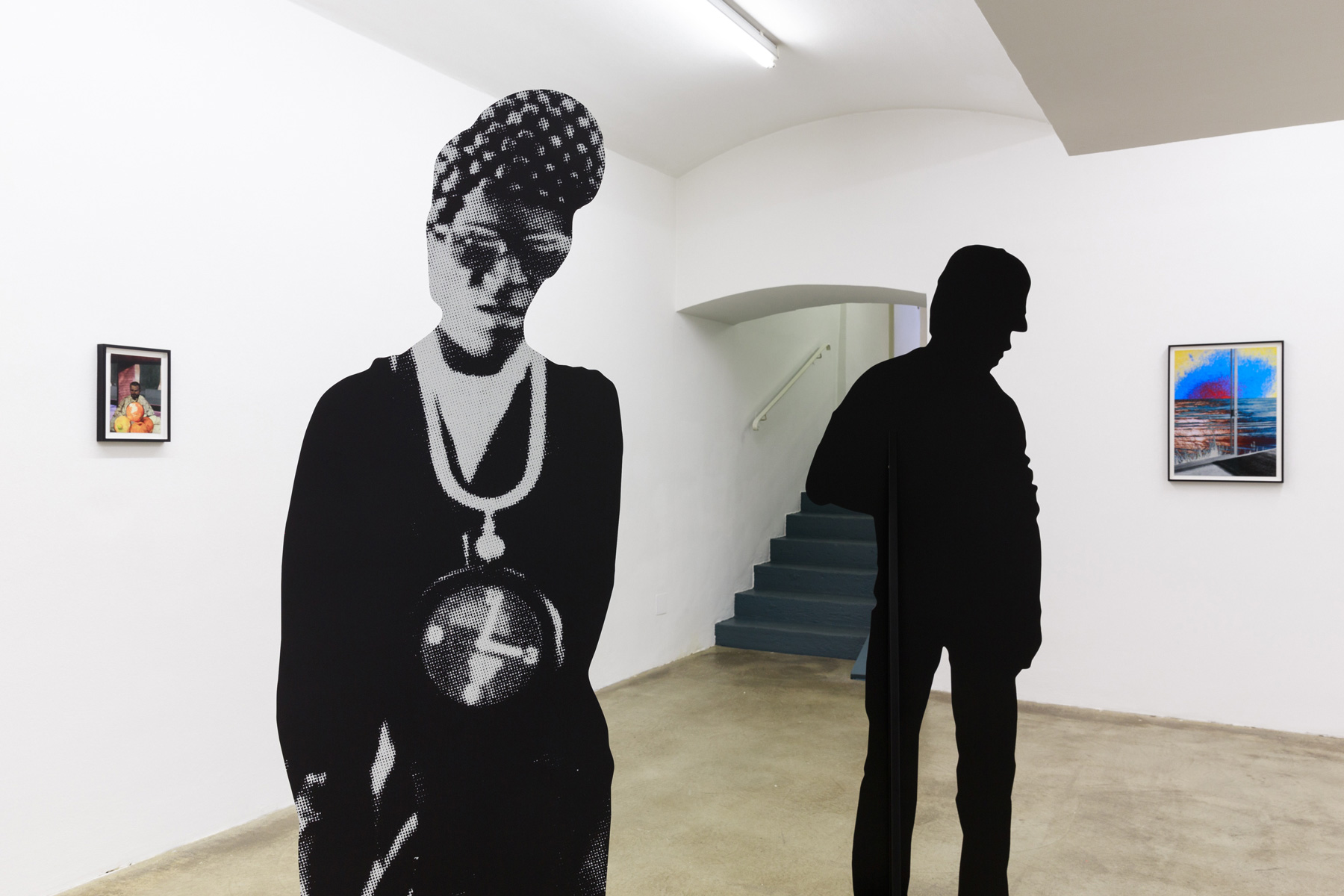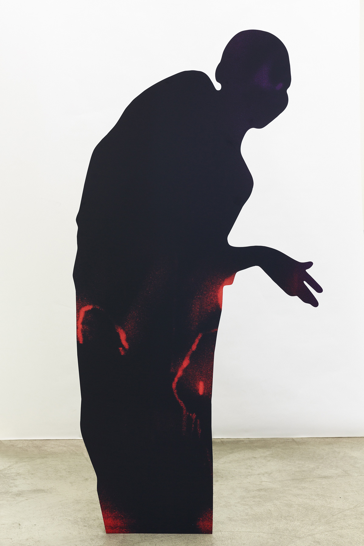 Sculptural works of cut-out figures are placed around the exhibition space. In each work, the silhouette is dictated by one source, with the imagery inside coming from another, allowing for two images to be present at the same time, as part of one another. This creates a feed-back loop between two elements, destabilising their relationship internally, as a conflicted body as well as influencing the relationship to the other figures and to visitors. Like a dance perhaps, or, as seen from the back, a shadow play of vaguely defined bodies and positions.