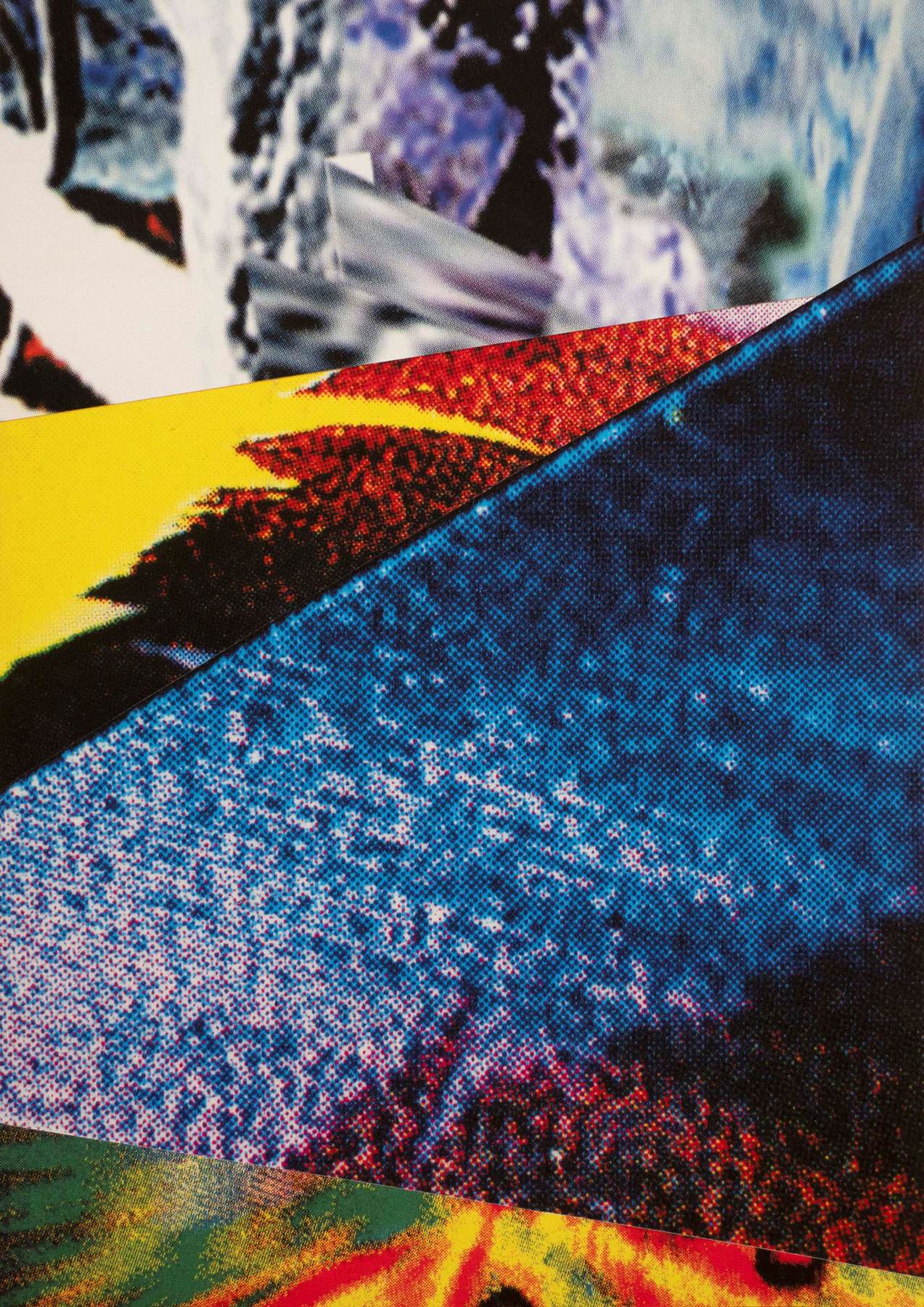 The hazy nature of these prints is contrasted by a cut and paste collage series, in which Kolding explores imagery of past visualisations of a digital future. With material taken from science fiction book covers from the 1960s to the 90s, and rave and ambient record covers from the late 80s to the early 90s, the combined imagery suggests a future of new virtual worlds, both utopian and dystopian. Having zoomed in on details to the point of abstraction, the images are visually arresting, appealing, proposing a bright digital future. However, seen now, these images become tinged with sadness, revealing a dark undercurrent running through them. The abstract visualisations of once-upon-a-time dreams of an emancipatory utopia, of a networked world and individual freedom, give way to concrete realities of diminished privacy in a digital world of extreme inequality, far outside democratic control.