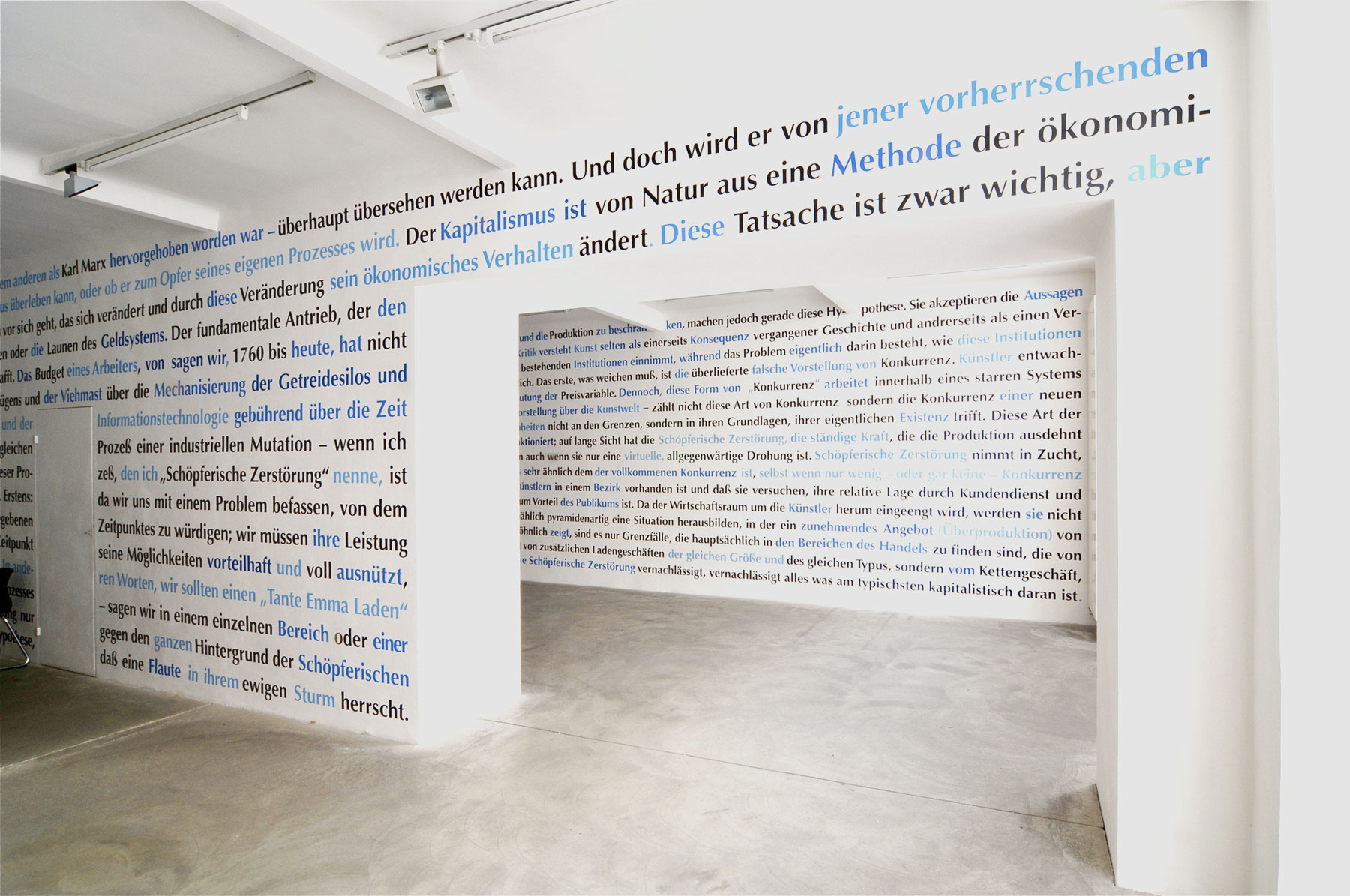 In this space-filling wall piece completed in 2008, Joe Scanlan deals with a text by Joseph A. Schumpeter (1883–1950), an economist of Austrian descent. Schumpeter’s most widely known idea — published in 1942 in Capitalism, Socialism and Democracy — is “Creative Destruction”: it addresses how in economic life old ways of doing business are destroyed in the process of new ways coming into being. Scanlan applies this theory of the essence of capitalism to art by changing, rewriting and rearranging Schumpeter’s text and by inserting words and phrases. Through Scanlan’s revisions — recognizable due to the artist’s use of different shades of blue — Schumpeter’s text itself becomes the subject of a creative destruction process. By transferring it to the gallery’s walls it also simultaneously becomes a tableau which visitors to the exhibition enter; accompanying their movement is an altered perception of the text and space.