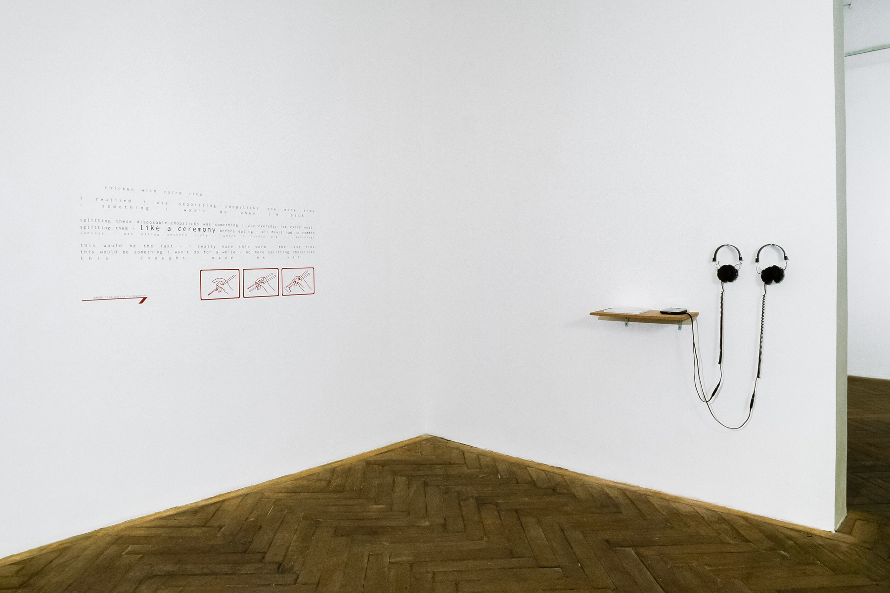 from… consists of a CD-player, two headphones and a batch of safty instruction cards, which are similar to those in an airplane. The work concerns of cultural-caused greeting-rituals, of recognition features of ethnic affiliation and of the slowly dissolution of this ordersystems.