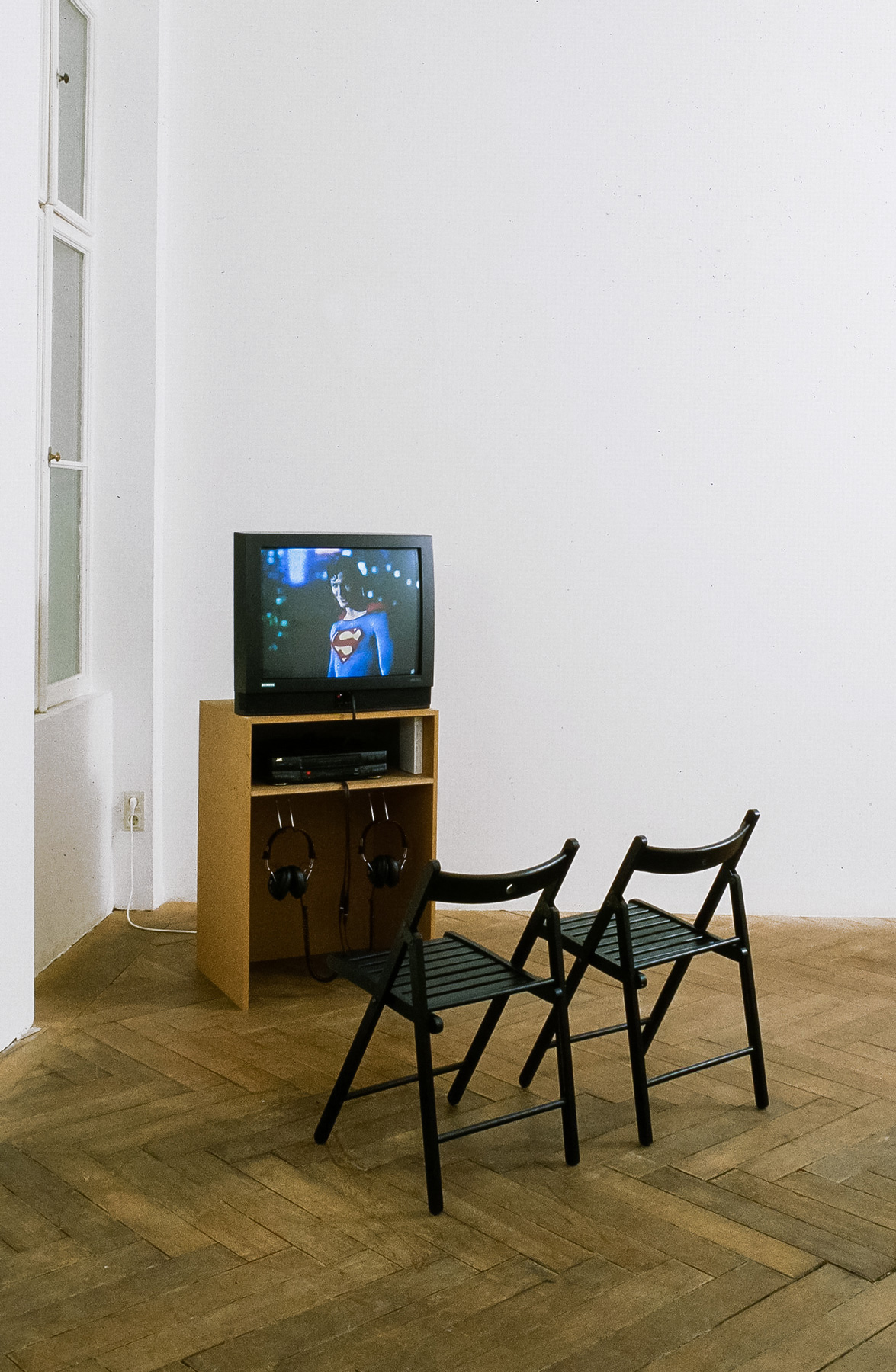 The video-installation from salariiman to superman shows a cut and a revision of his performance, in which he discusses the leading theme of his work on the basis of biographic events.