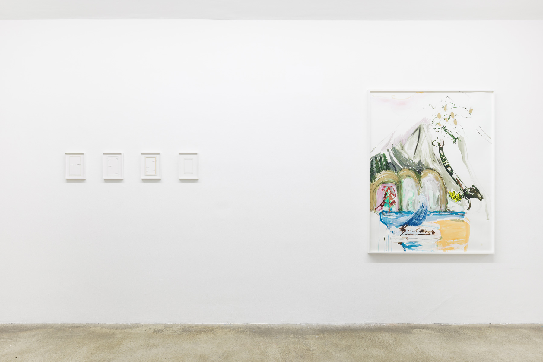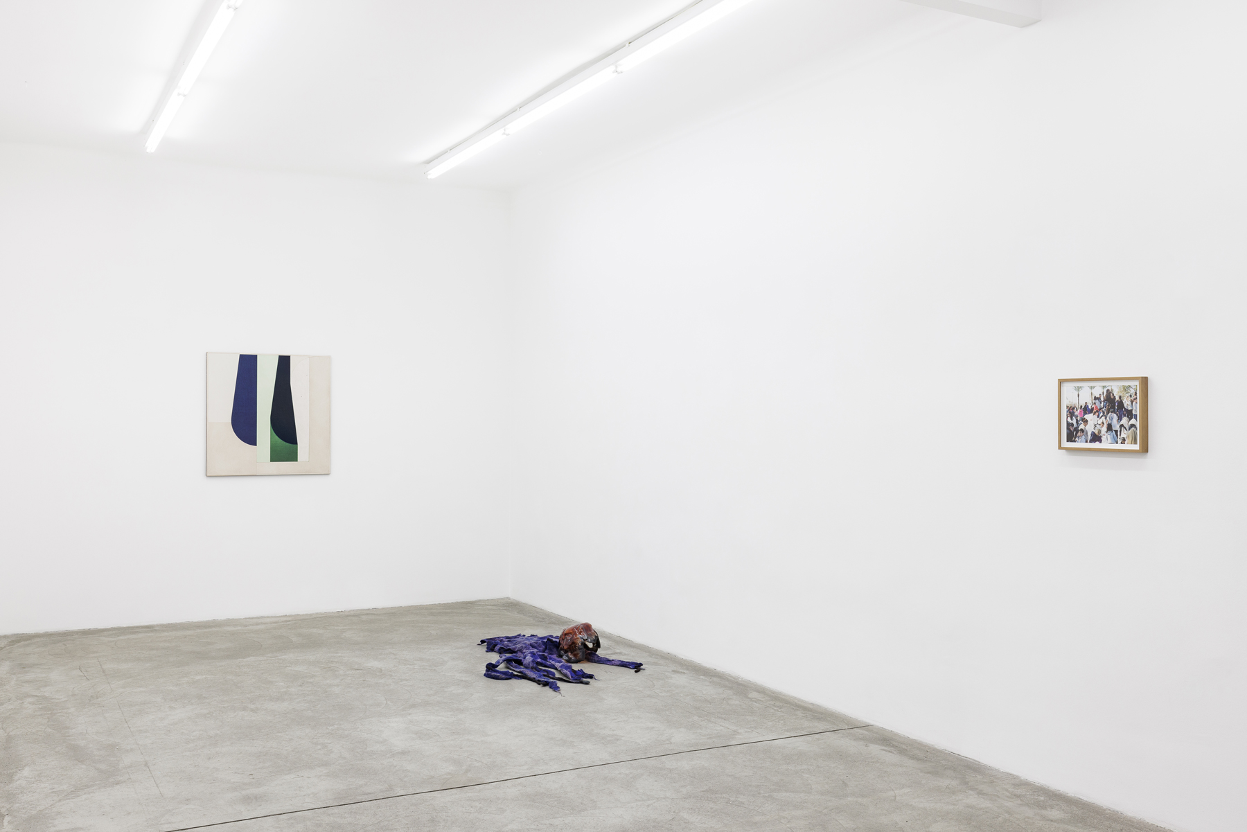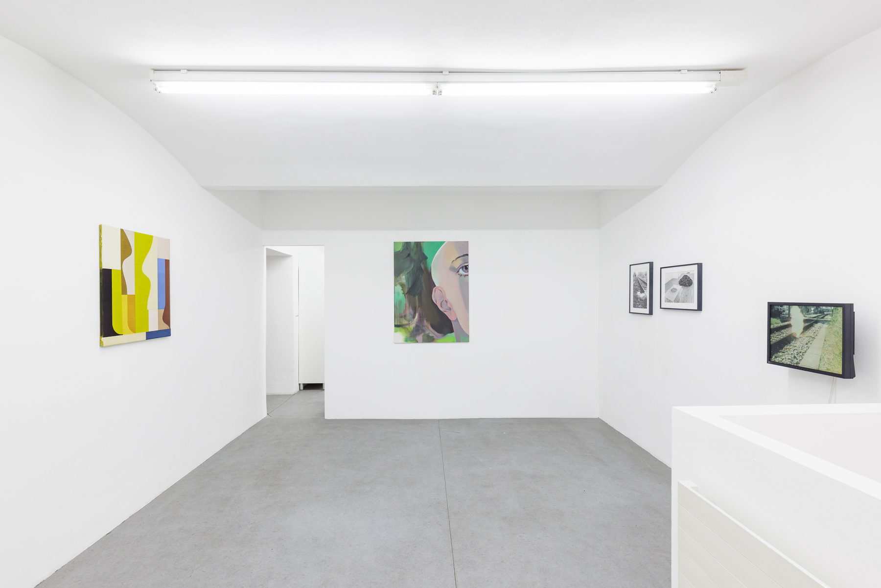 Then there are the gestures in Ene-Liis Sempers video Come, which are an invitation to step out into the landscape; Jan Mertas figurative painting, which shifts its focus to what is beyond the imagery; Werner Feiersingers minimalist architectural sculptures reconceiving notions of space; Nilbar Güreş engagement with seeing and being seen, concealing and revealing, in a search for forms of representation beyond structurally dichotomous world views; Hugo Canoilas installative approach to painting, reaching into the space, which aims to revise an anthropocentric world view and, as a painterly biosphere, always also provides a sociotope and a space for interaction. Jakob Koldings collages, which employ fragments to create a space of resonance, are characterised by the multi-layered echo of language, when all that remains of sentences are words and the blank page becomes an arena for those graphemes stuck to its edges. While Milena Dragicevics paintings, where heads are dissolved to the point of abstraction, see themselves as placeholders for something that lies in the future or past like an arrow pointing into the now.