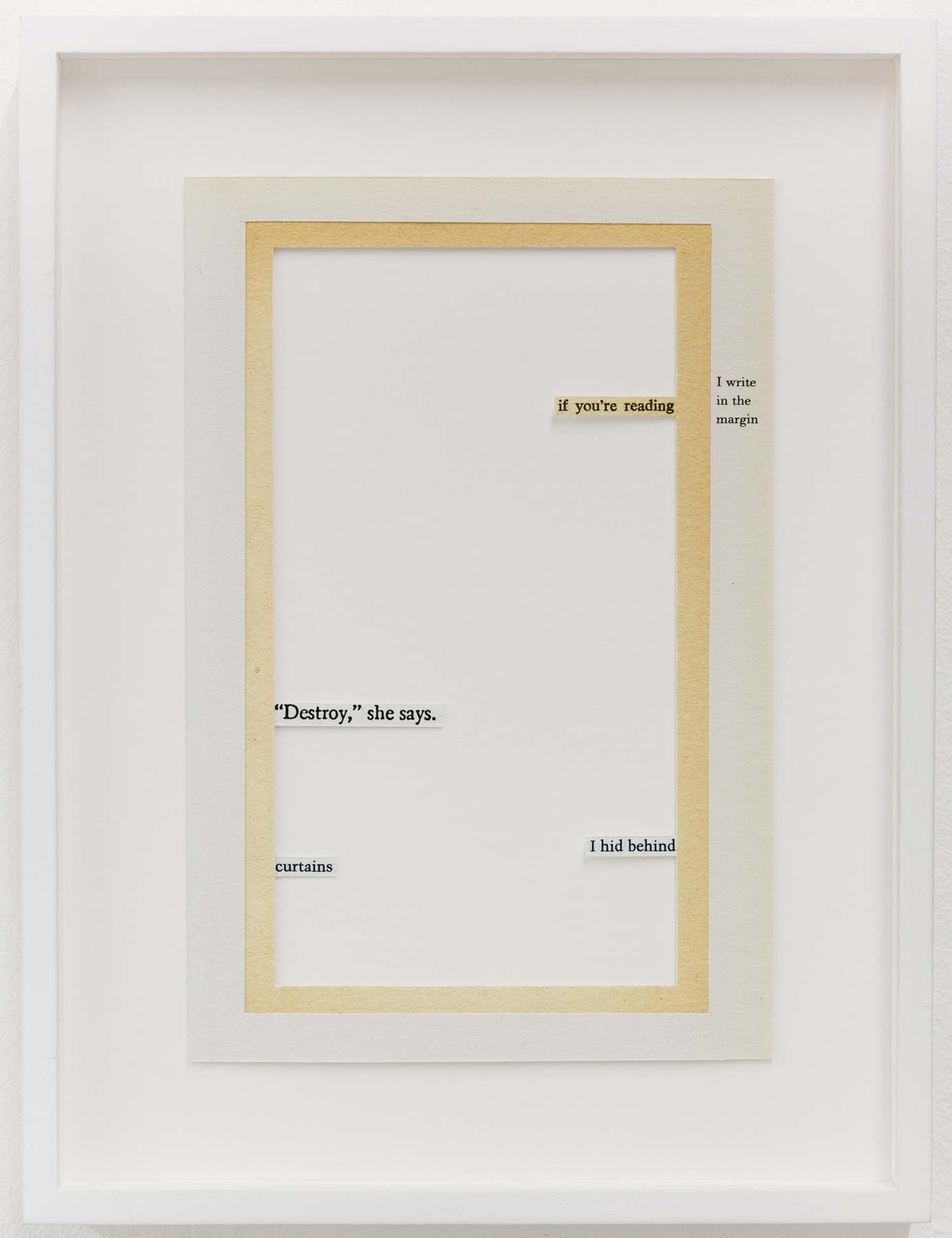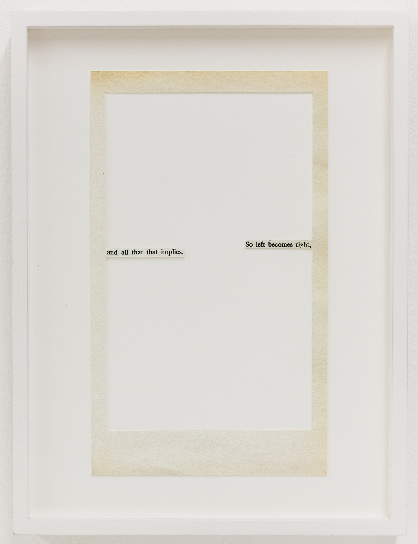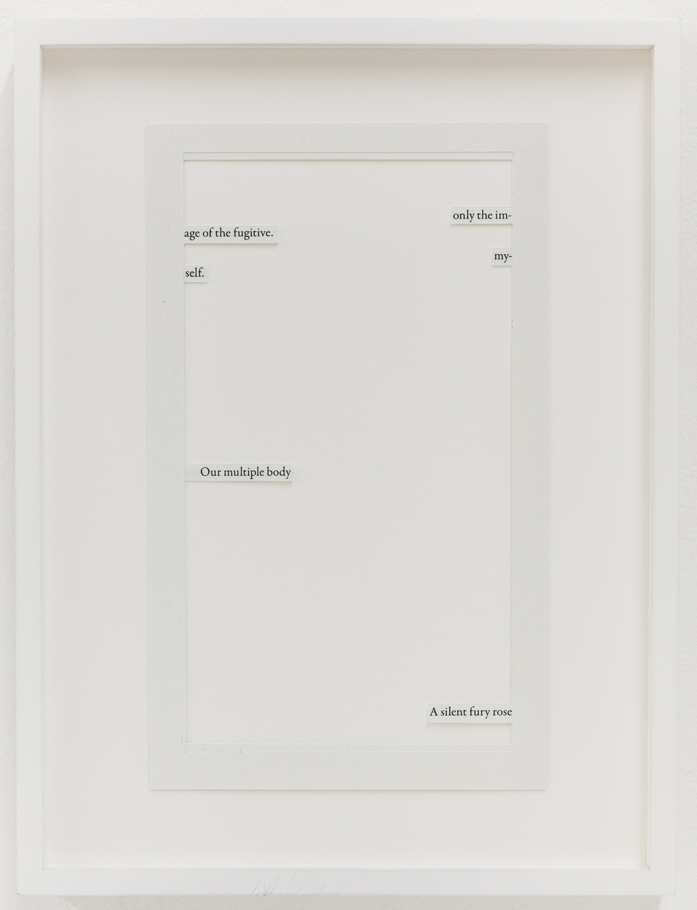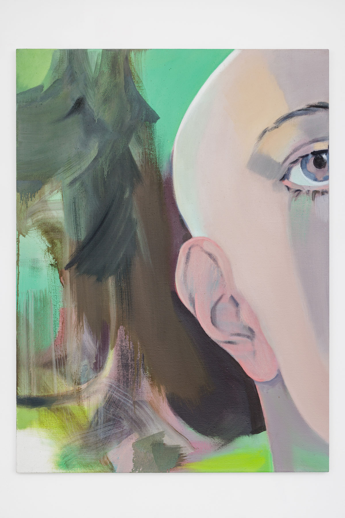 Then there are the gestures in Ene-Liis Sempers video Come, which are an invitation to step out into the landscape; Jan Mertas figurative painting, which shifts its focus to what is beyond the imagery; Werner Feiersingers minimalist architectural sculptures reconceiving notions of space; Nilbar Güreş engagement with seeing and being seen, concealing and revealing, in a search for forms of representation beyond structurally dichotomous world views; Hugo Canoilas installative approach to painting, reaching into the space, which aims to revise an anthropocentric world view and, as a painterly biosphere, always also provides a sociotope and a space for interaction. Jakob Koldings collages, which employ fragments to create a space of resonance, are characterised by the multi-layered echo of language, when all that remains of sentences are words and the blank page becomes an arena for those graphemes stuck to its edges. While Milena Dragicevics paintings, where heads are dissolved to the point of abstraction, see themselves as placeholders for something that lies in the future or past like an arrow pointing into the now.