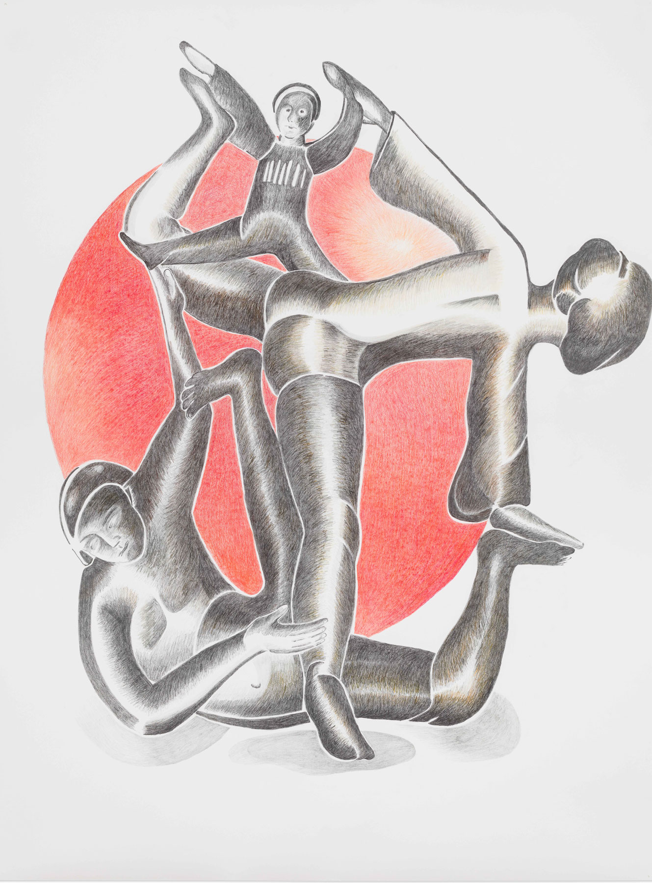 These seemingly frozen movements are reflected in the drawings. Strange creatures, some with several faces or three legs, stand closely intertwined in stage-like spaces.