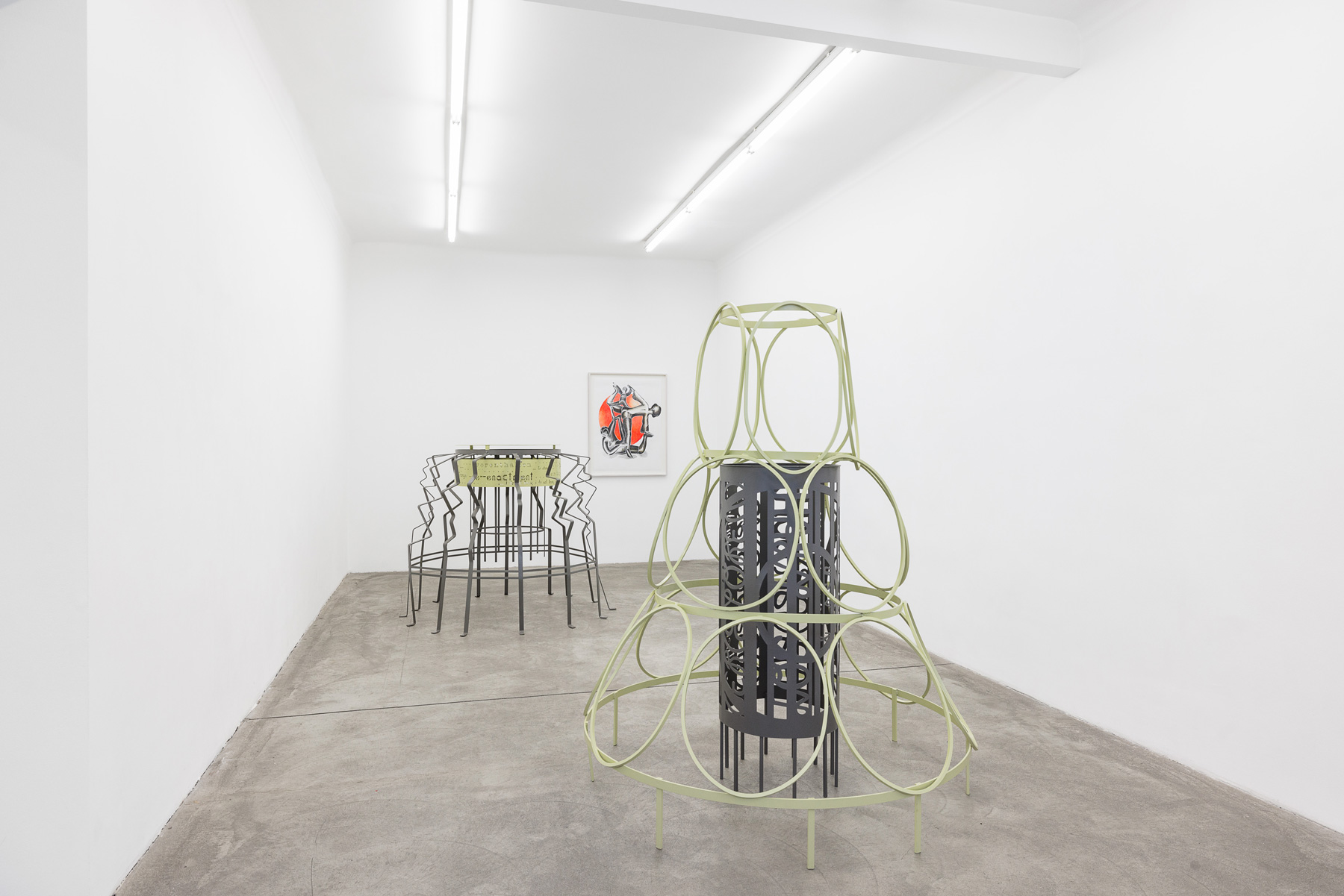 The sculptures from 2008 shown in the exhibition seem frozen in their movements. They are figurative, dance-like steel sculptures of filigree lightness that linger between stasis and dynamism. “We are interested in translating this standstill in motion into a material that is inherently rigid. Words and sentences are carved on discs and strips inside the objects.” (Irene Hohenbüchler)