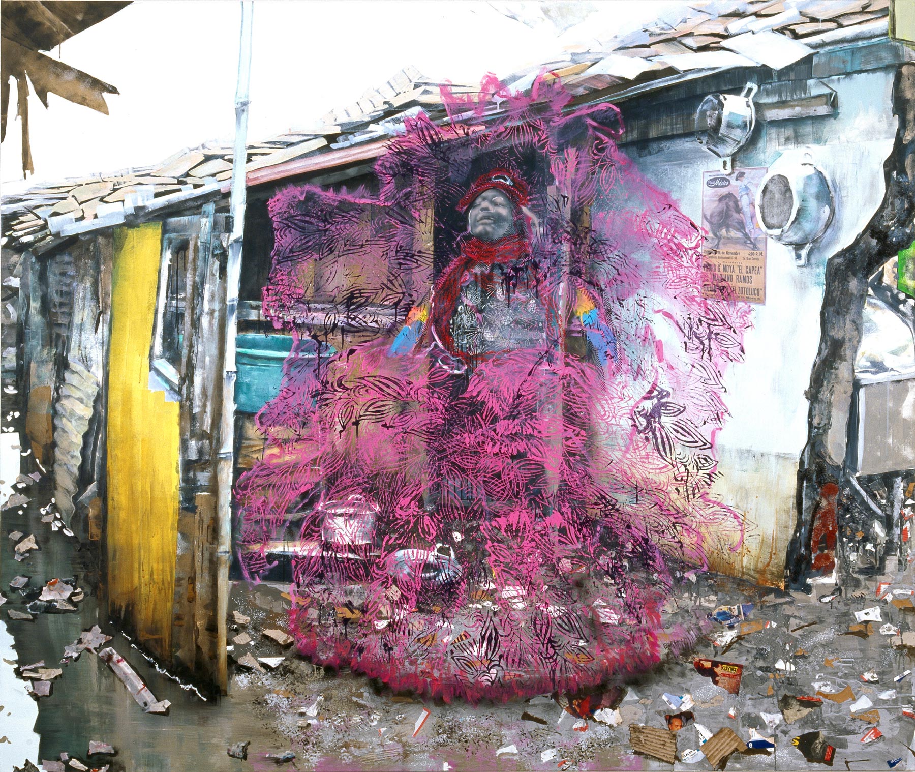 Maja Vukoje’s new paintings address the themes glamour, elegance and (self-)representation. The large-format work Cinderella Favela (2009) depicts a figure in an opulent, pink robe in front of a shack. The ground is covered with litter, the dwelling humble. The person’s body language is proud and self-confident. At the same time she is diaphanous, her representation transparent; she is absent and present in equal degree. Maja Vukoje makes reference to self-dramatization as a socio-political gesture: “The sublime as the antithesis to the profane is a trait of much post-colonial phenomena that fascinates me, such as the artistic metamorphosis seen at the Caribbean Mardi Gras or in Congolese dandies from the slums of Brazzaville.”