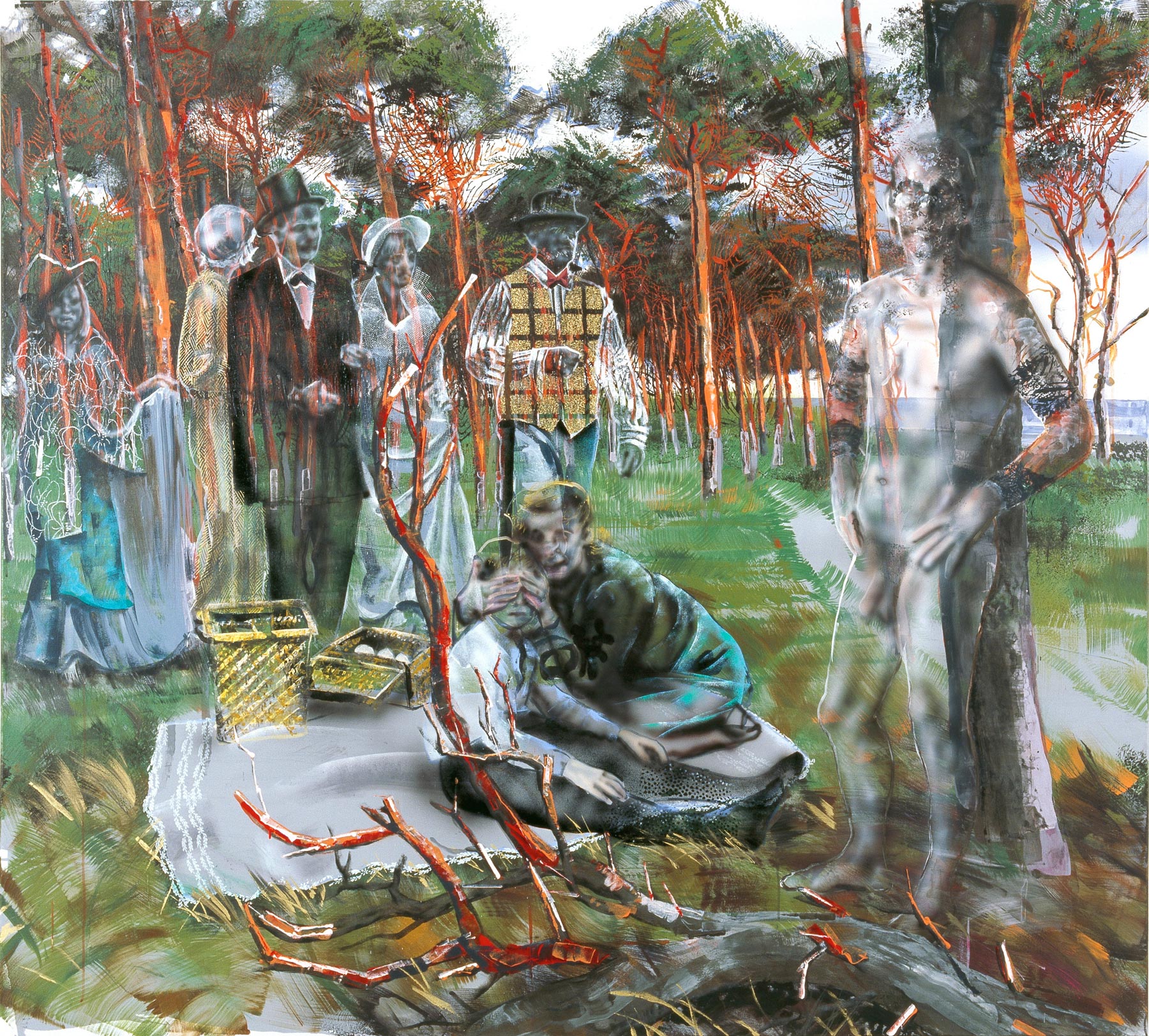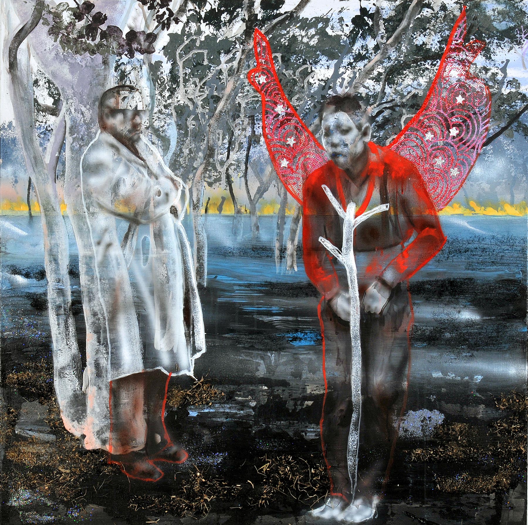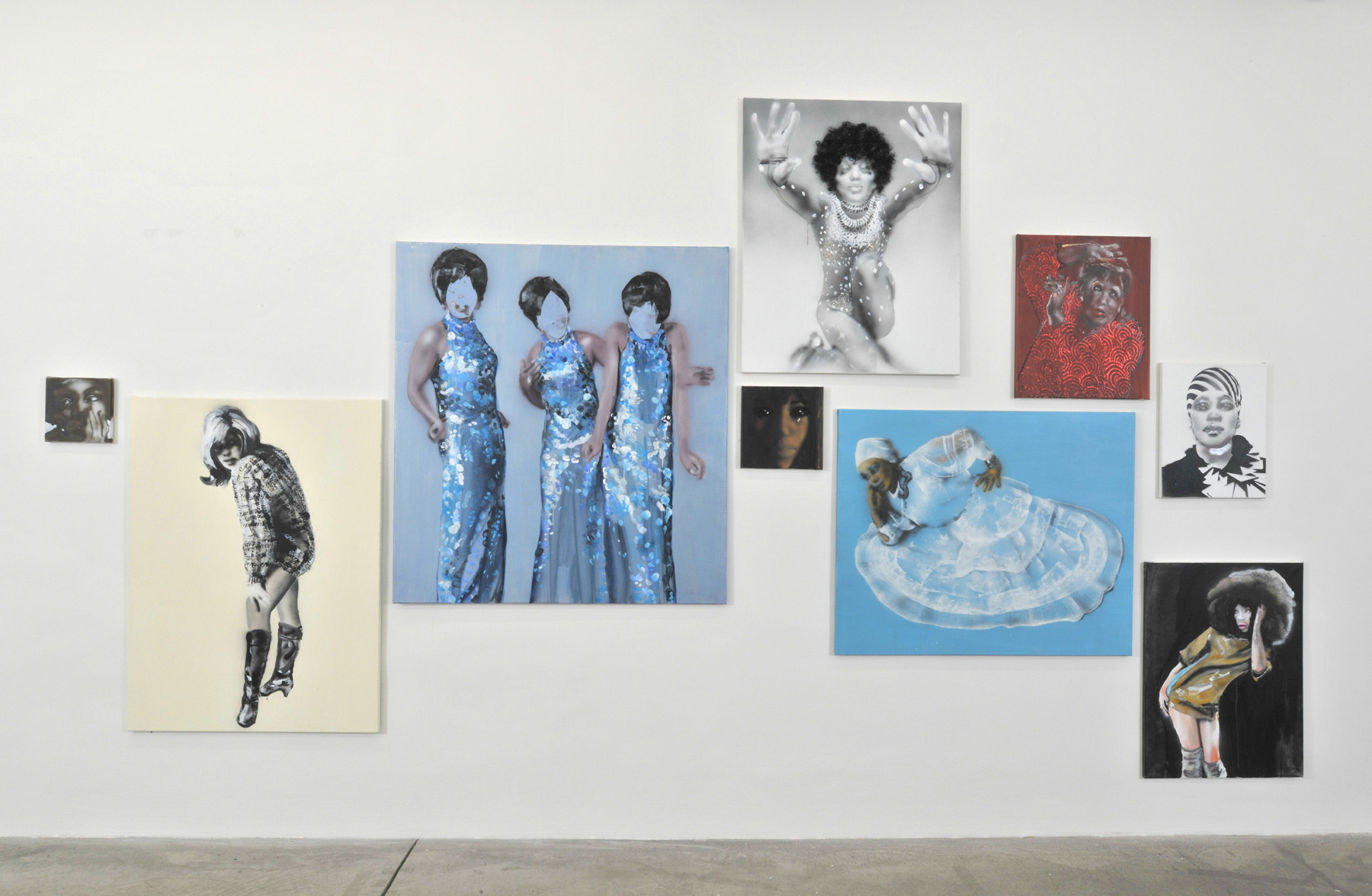 10 Divas (2009), a mixed-media work, depicts legendary soul and bolero singers. The paintings explore how the persona is represented in the media, with a focus on gestures, movement and fashion, spanning from the 1960s to the present day. By grappling with “the other”, Vukoje seeks to illuminate the psycho-social function of affectation and an the significance of magic in contemporary image making.