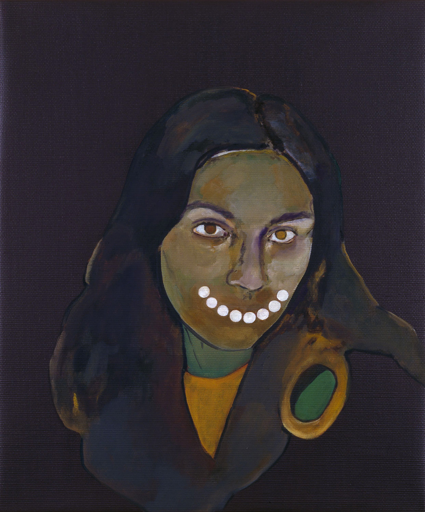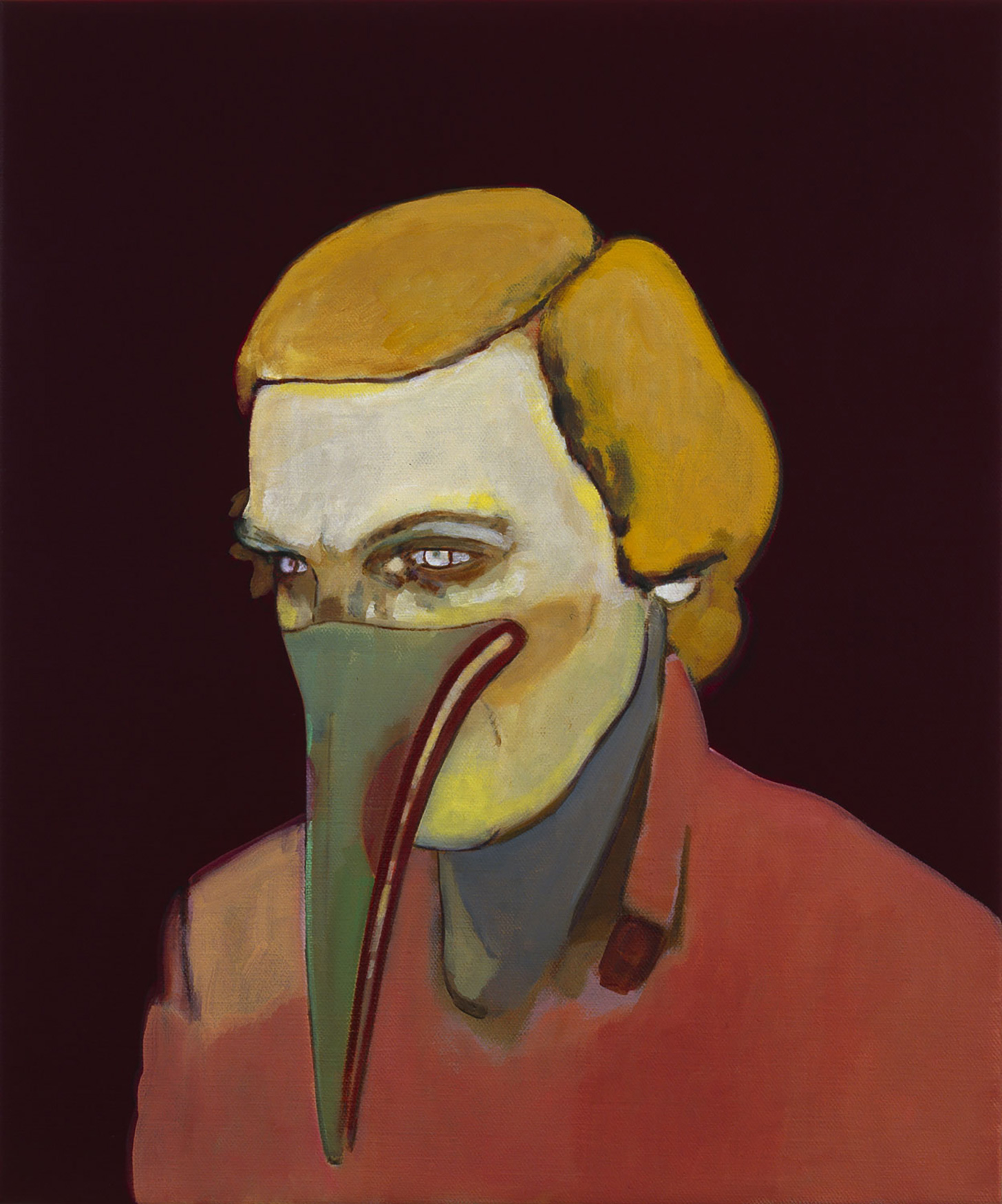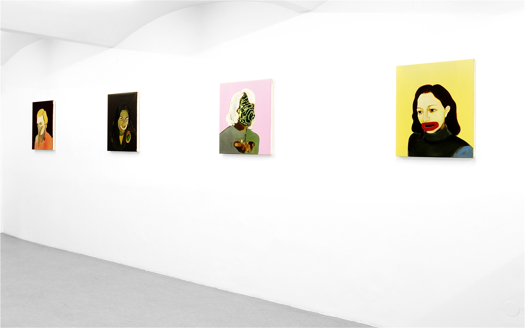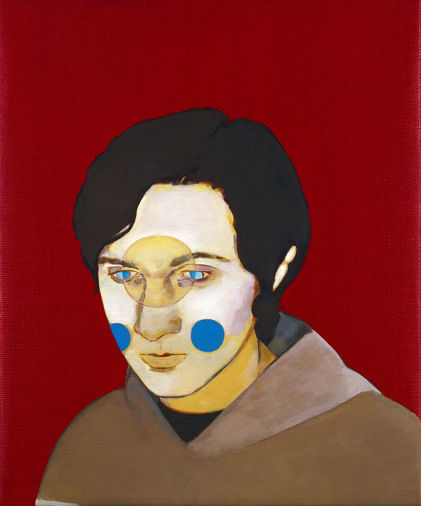 Although the artist has worked with variations of titles and themes in the past, Supplicants is the first series which rigorously adheres to a concept. All works — the format, at 61 × 56.5 cm or 61 × 51 cm, is also predetermined — are representations of the human head, usually of friends or acquaintances, altered with small interventions. Milena Dragicevic covers the faces with geometric shapes or changes the physiognomy. She emphasizes that these are not psychological studies of the individuals who are portrayed: “The paintings are not about the models, they are ‘stand-ins’ for something else.” The title also makes reference to this aspect: supplicant means petitioner or beadsman.