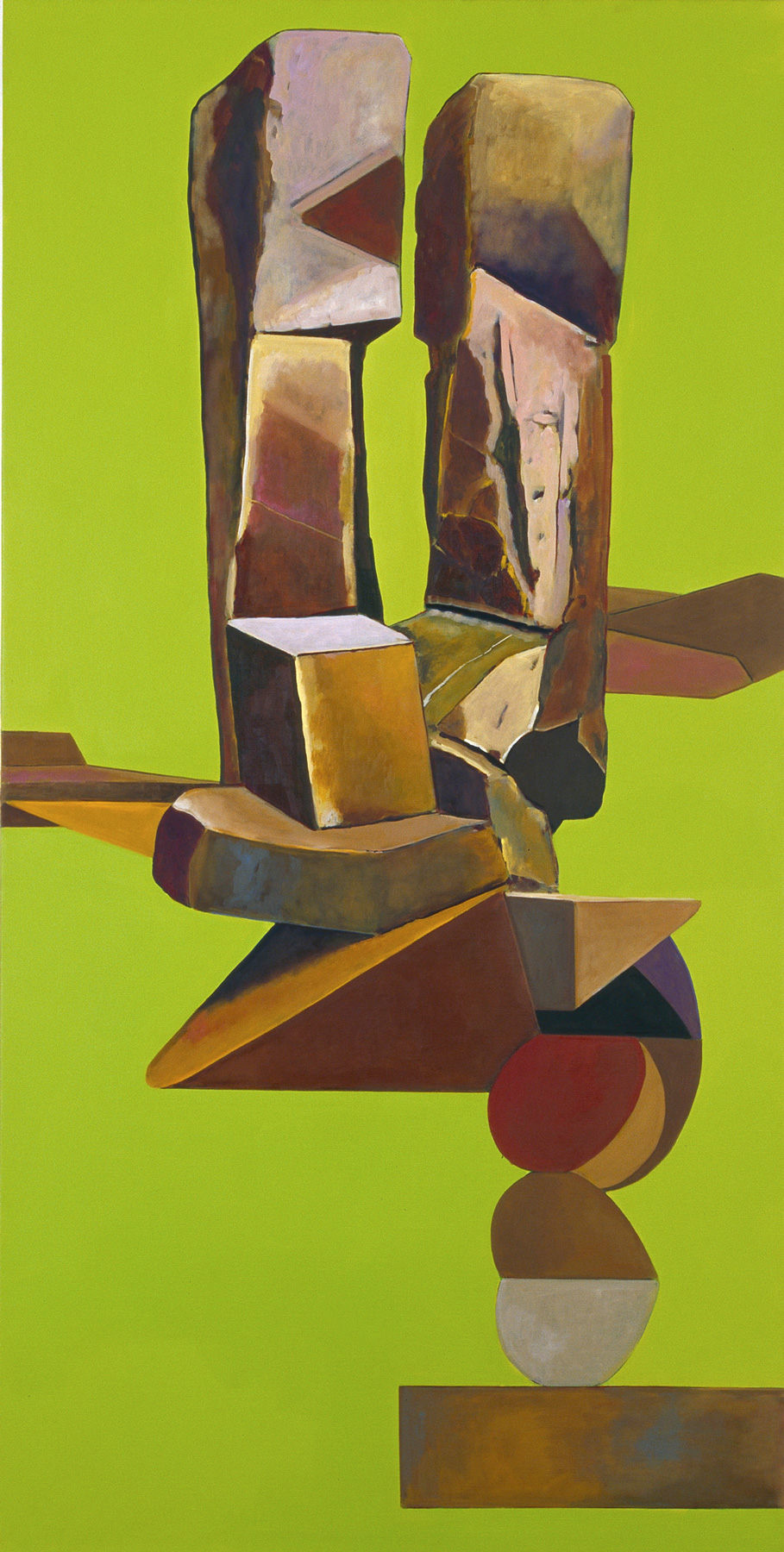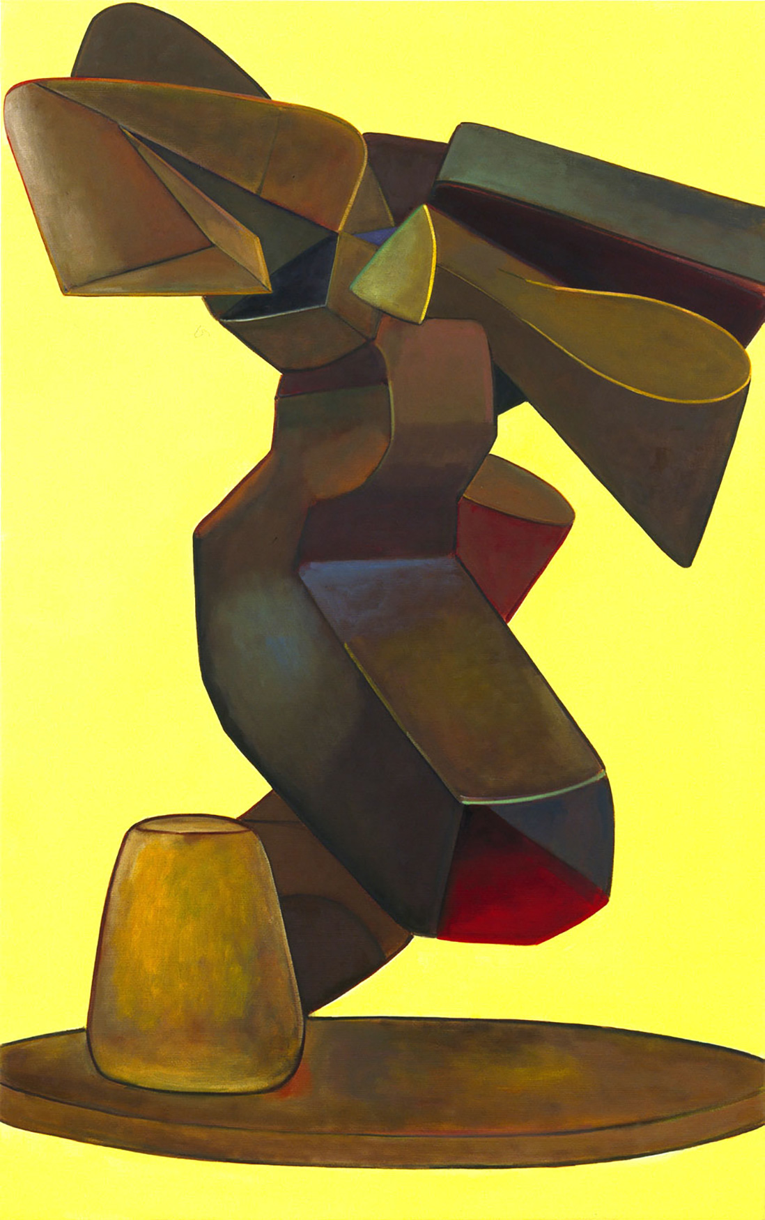 Tuksiarvik 8, a large-format oil painting, occupies a central position in the show. In front of a monochrome backdrop, beginning at a narrow platform, a sculptural figure works its way up. Volumetric and planar elements appear to be collaged, precariously stacked upon one another, the surfaces in relief. Some of the forms were borrowed from modernistic sculptures. The intensive green background seems — juxtaposed with the earthy shades of brown which dominate the sculpture’s color scheme — utterly artificial. The title of this piece and of the entire series is taken from the Inuit language and means prayer site. Dragicevic consciously employs the title for her works — its significance is not apparent at first glance. The structure of her paintings is situated somewhere between realistic form and abstraction; this is true of the titles of the works, as well.