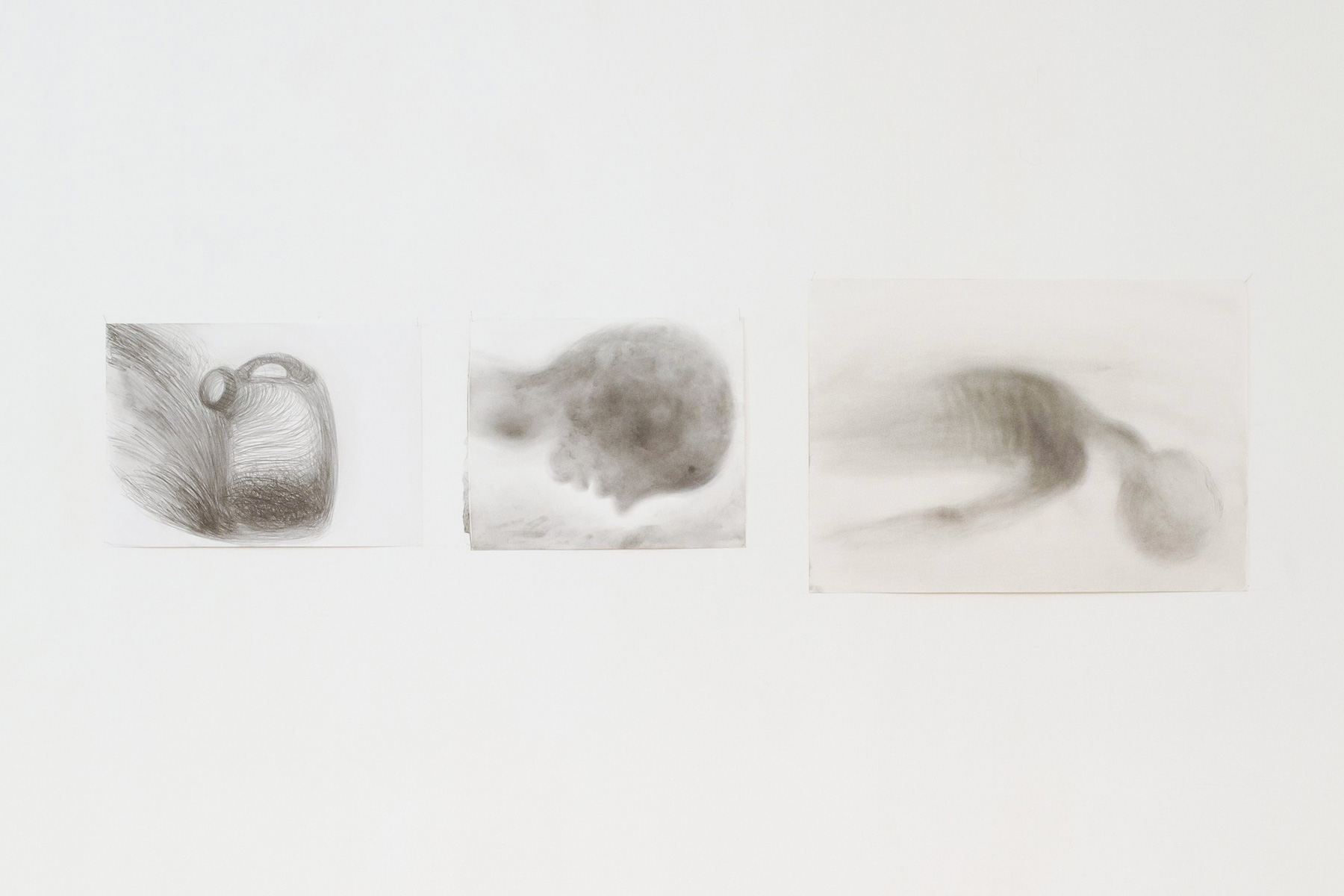 Im zweiten Raum behandelt Cahn das Thema Liegen. Die toten, menschlichen Körper werden in diesen Kohlezeichnungen ganz transparent gezeigt, die Wirbelsäule wird sichtbar, die Figuren scheinen sich im Weiß des Blattes fast aufzulösen.