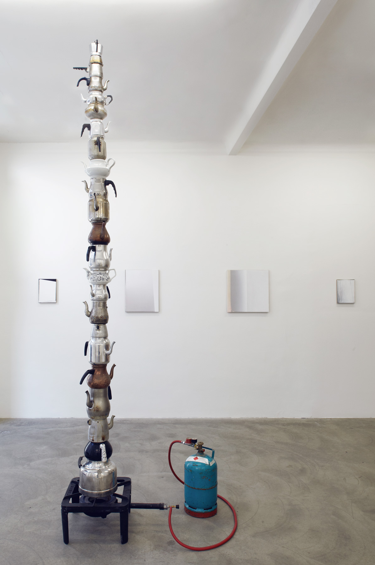 Johannes Vogl, born in Kaufbeuren, Germany in 1981, currently lives in Berlin and Vienna. His sculptural work Dampfsäule (2011), a tower of teapots put on top of each other and heated by a small gas oven, was inspired by a several-month long visit to Istanbul in 2011. The Turkish tea-drinking tradition serves as the starting point for his work that highlights the complexity of Turkish family connections; a fragile structure which depends on stability and solidarity and can work only in an environment of well-balanced togetherness.