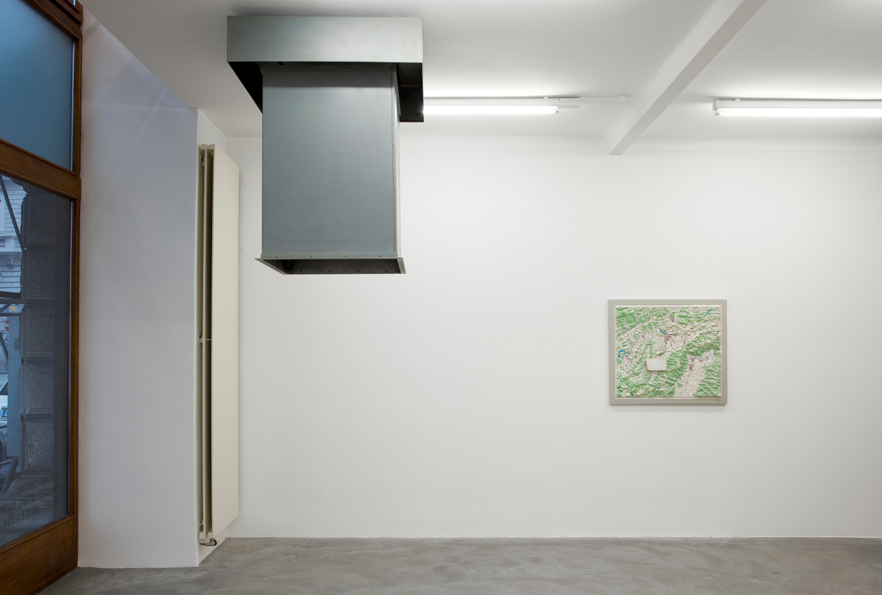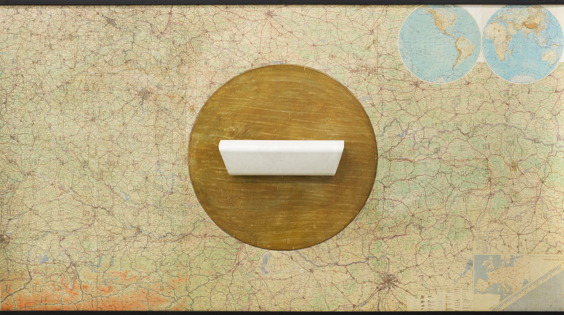 A large-format painting in the style of Socialist Realism from the 1950s shows a scene at a dam in the north of Slovakia. The painting was located in the artist’s family home, just like the objects which Roman Ondák has transferred to this scenery: A part of a wooden door on which a rust-red varnished pipe is mounted (Mailbox, 2013). Ondák’s father had manufactured this mailbox using a sawn-off delineator — a common practice in Slovakia in the 1980s to improvise on everyday objects that served a different purpose. The prototype of such a mailbox appears in a second large-format work in which a white pipe sits on a small round table top that is inserted in a detailed map of Central Europe like a greatly enlarged cutout (Mailbox, 2014). Besides referring to the geography and the artist’s origin, the works are also indicative of Ondák’s private environment — the table on which the mail is placed, the exchange and receipt of messages and information.