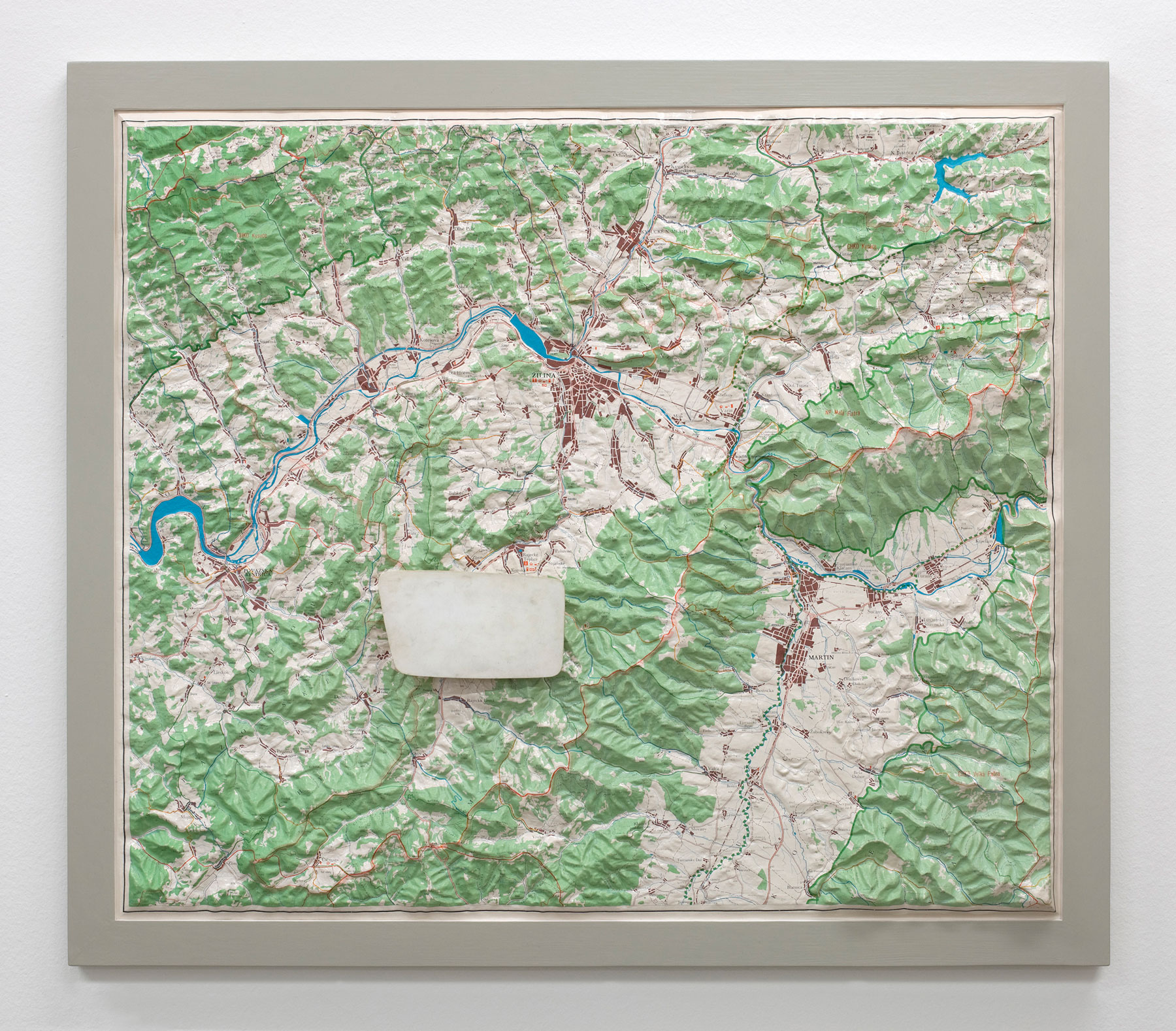 In the eponymous work Erased Wing Mirror (2013) Ondák again combines two ready-mades; a found relief map of Slovakia and an object made by his father in the 1990s. Mysterious at a first glance, the object turns out to be a wing mirror-shaped template used for repairing broken car wing mirrors. In this work Ondák addresses the idea of erasement; this blind mirror gives no reflection, it is the mere fiction of a mirror: “If you look back, there is never a full picture.” (Ondák)