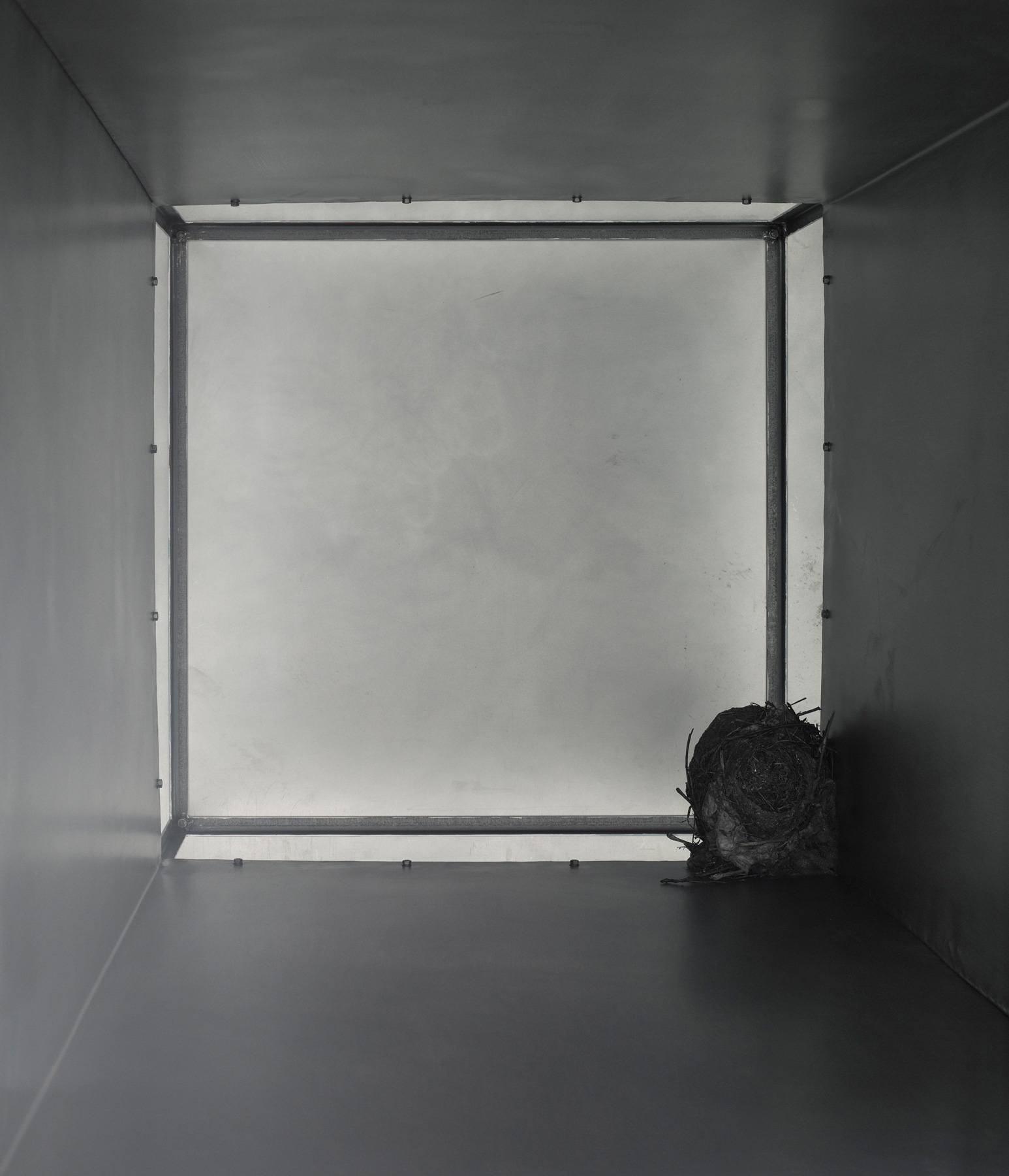 A sheet chimney, which suspends from the ceiling of the gallery’s second exhibition space, acts as a set piece that is unhinged from its original use and fully transferred to this new site (Nest, 2012). The positioning in the exhibition space enables an unusual insight; in the interior of the functional structural element there is a deserted bird’s nest.