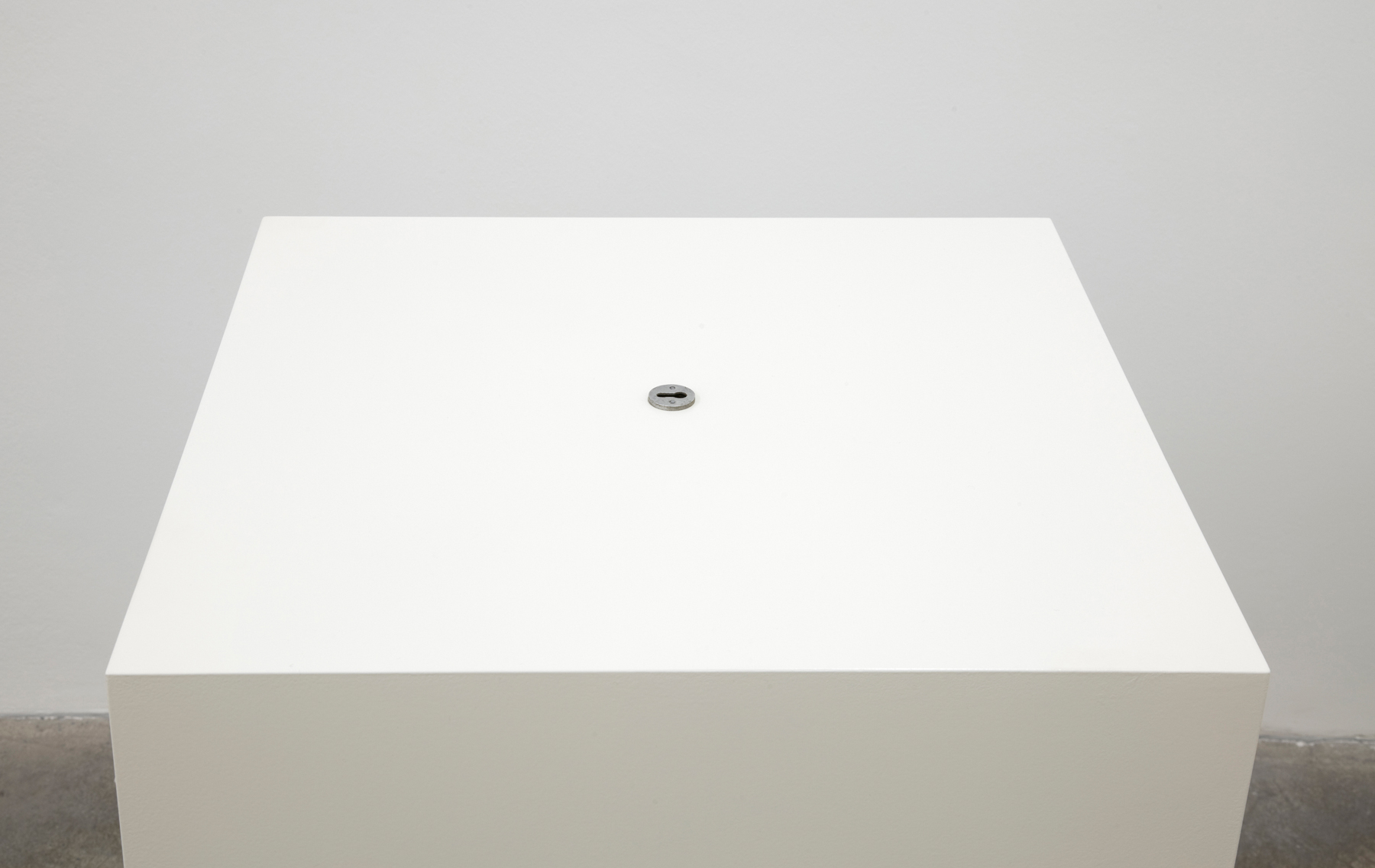 Black Hole (2013) captures the form of a white pedestal as used in galleries and museums to present objects and sculptures. Instead of placing something on the pedestal, Roman Ondák attaches something to the upper side of the white cube — a keyhole. The focus shifts to the volume, the emptiness of the pedestal’s interior.