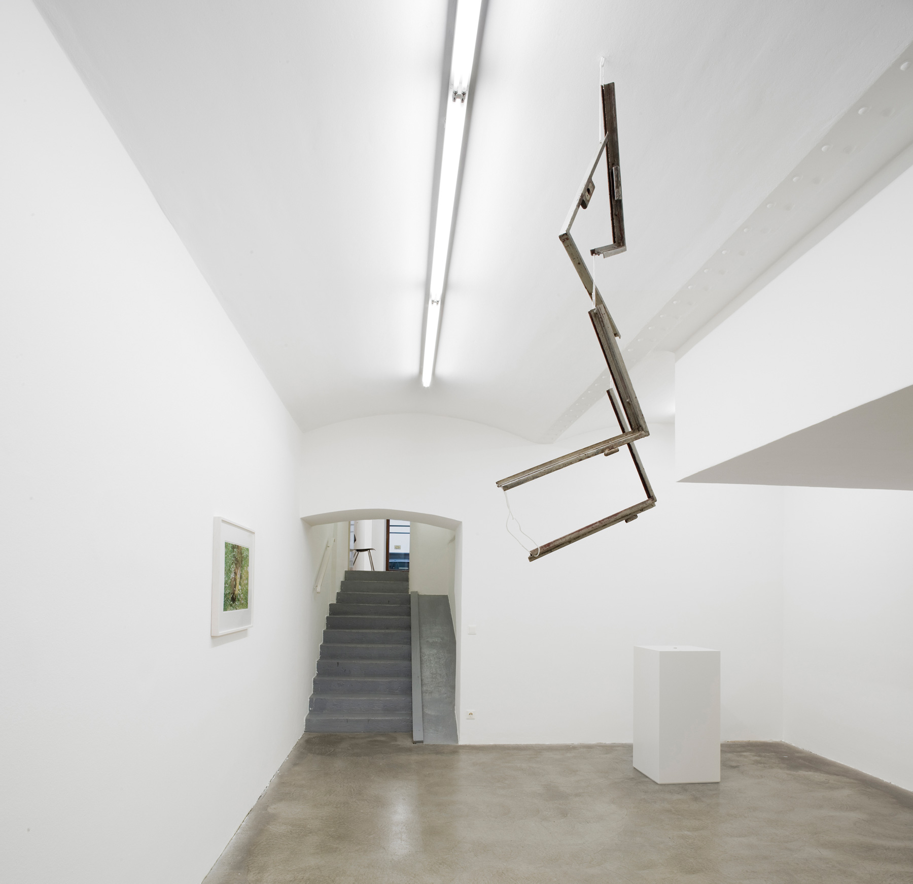 A find in the building in which the artist’s studio in Bratislava is located also forms the source material for Suspended Window (2013) shown in the gallery’s basement. Parts of a window frame cut into pieces are connected with cords and suspended from the ceiling. The form of the frame as well as the possible view through the window are deconstructed while, at the same time, the object undergoes a transformation into the sculptural.