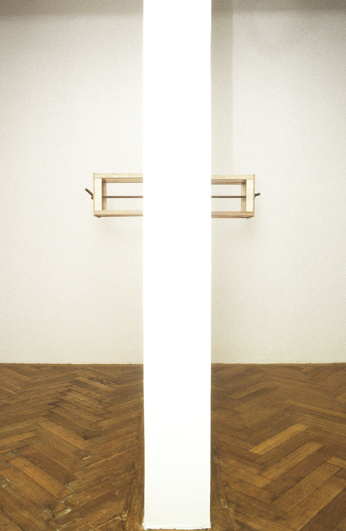 Zwei Hocker, durch ein gestrafftes Gummiseil gegeneinander gespannt, bilden die reduzierteste Umsetzung dieser elementaren Idee. Die Wand bindet die Kräfte des Gummiseils und verhindert den permanenten Platzaustausch der Hocker — verhindert ihre Rotation.