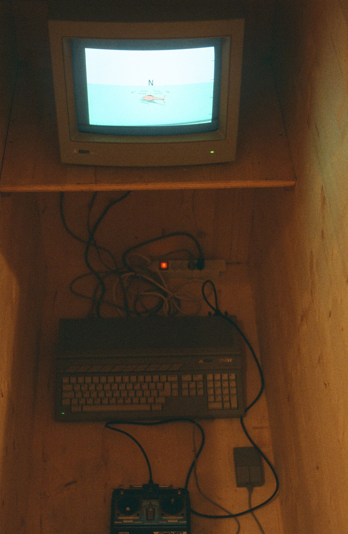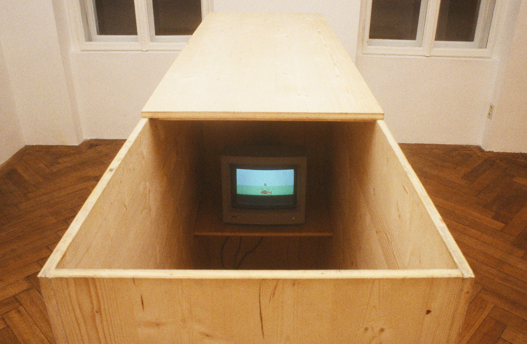 Simulator, eine Holzkiste mit eingebautem Trainingsgerät für Modellhelikopter, entstand aus dem Wunsch nach einer Sitz–Zelle, abgeschlossen von der Umwelt, zur Kontemplation und Konzentration. Diese Konzentration, und nicht der Aufbau eines virtuellen Raumes, sind Vorbedingungen für die Bewältigung eines unfallfreien Fluges mit dem Bildschirmhelikopter. Die Distanz zwischen Bildschirm und Mensch ist auschlaggebend, das Eindringen in eine Scheinwelt wird nicht angestrebt, die Zelle ist auch ohne technische Gerätschaft benutzbar. Das Geräusch des am Boden verharrenden Helikopters und seine Mißinterpretation als marschierende Militärkolonne, kann als Verweis auf Doppelverwendung und Doppelbedeutungen ursprünglich humaner Errungenschaften der Technik gesehen werden.
