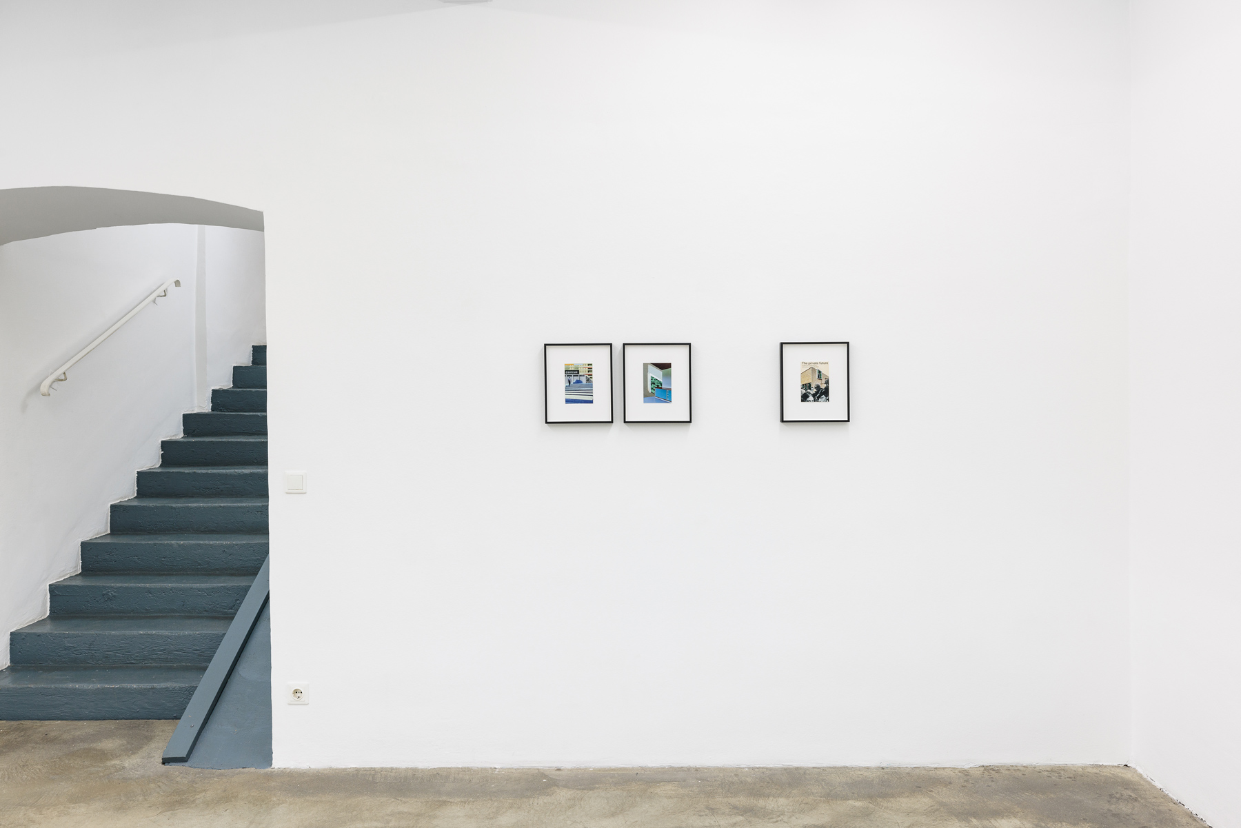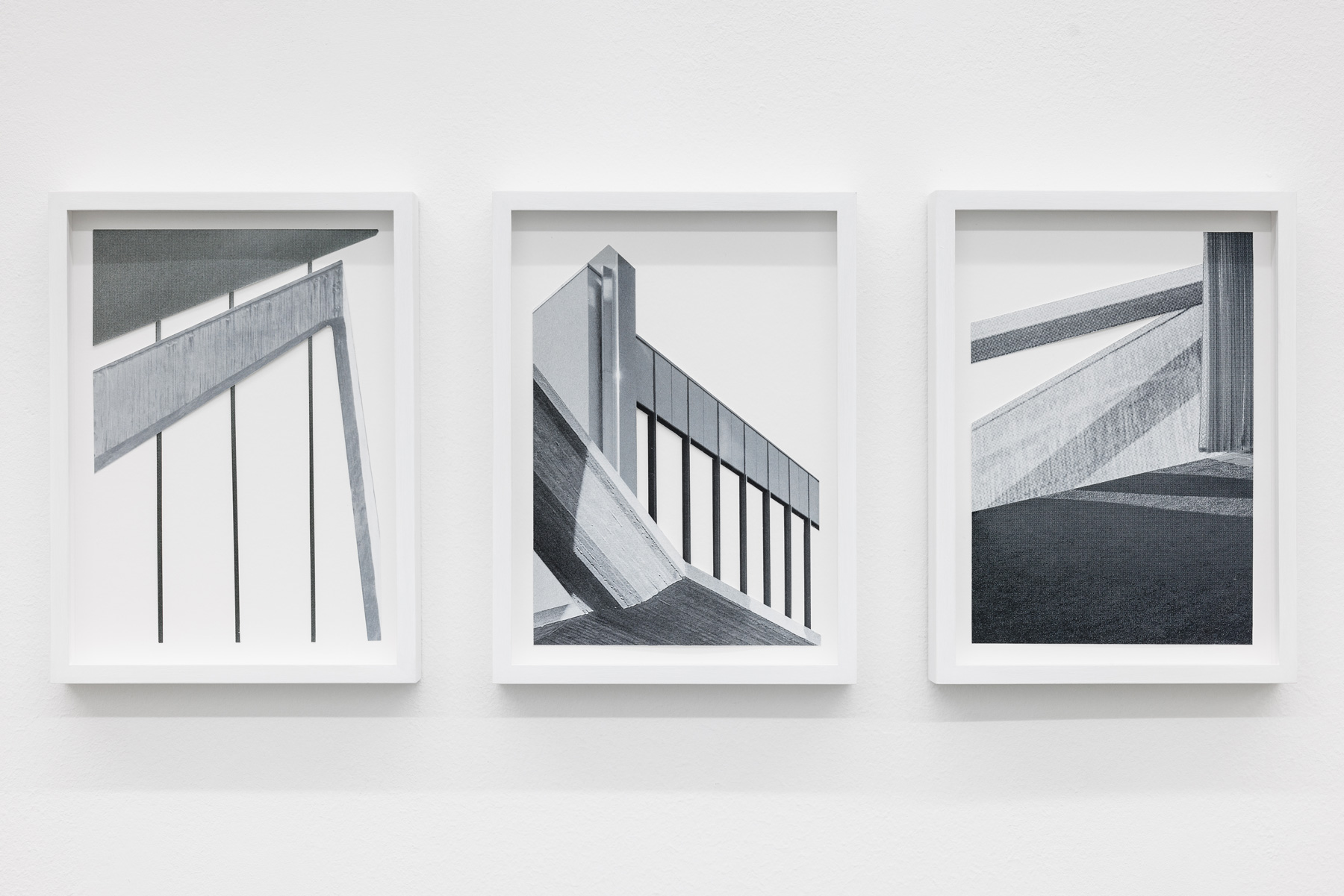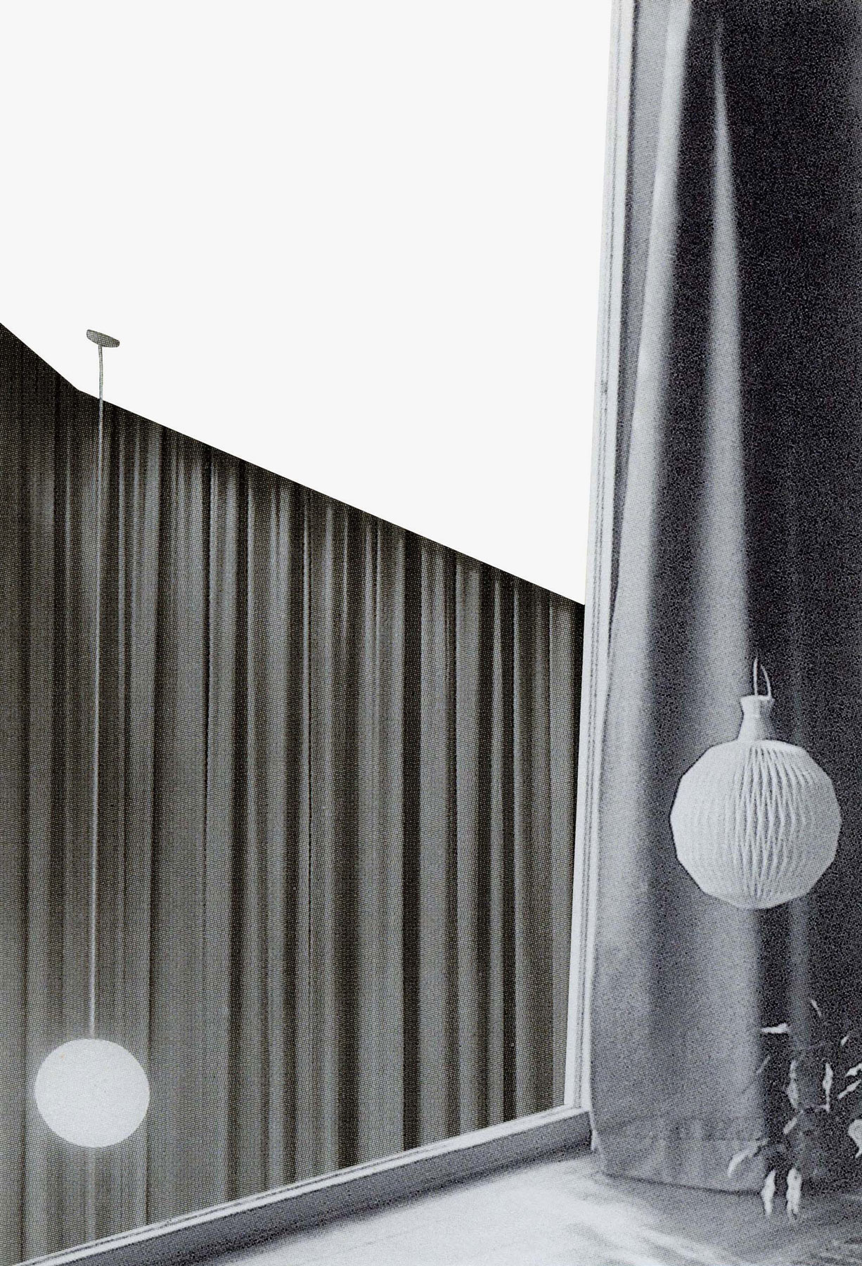 In a series of works titled after Google’s suggestion, the collages are composed of only two elements — one from a building by Richard Neutra and one from a building by Roland Rainer. As both Neutra and Rainer worked within a modernist tradition, the collages can at first glance appear to be a single, unified space — a space created by one architect. This effect is echoed by the removal of all contextual elements, leaving the collaged spaces to exist on their own, floating in a “neutrality” of nothingness.